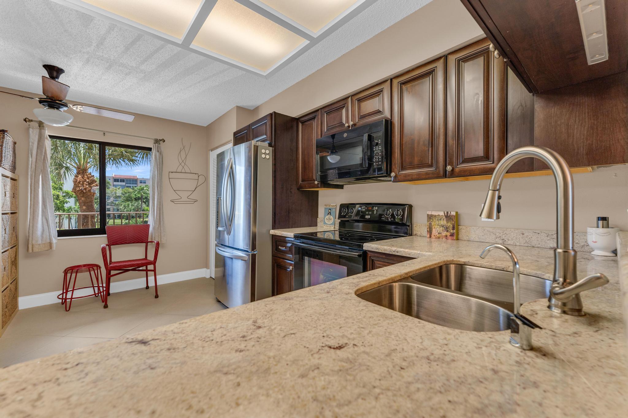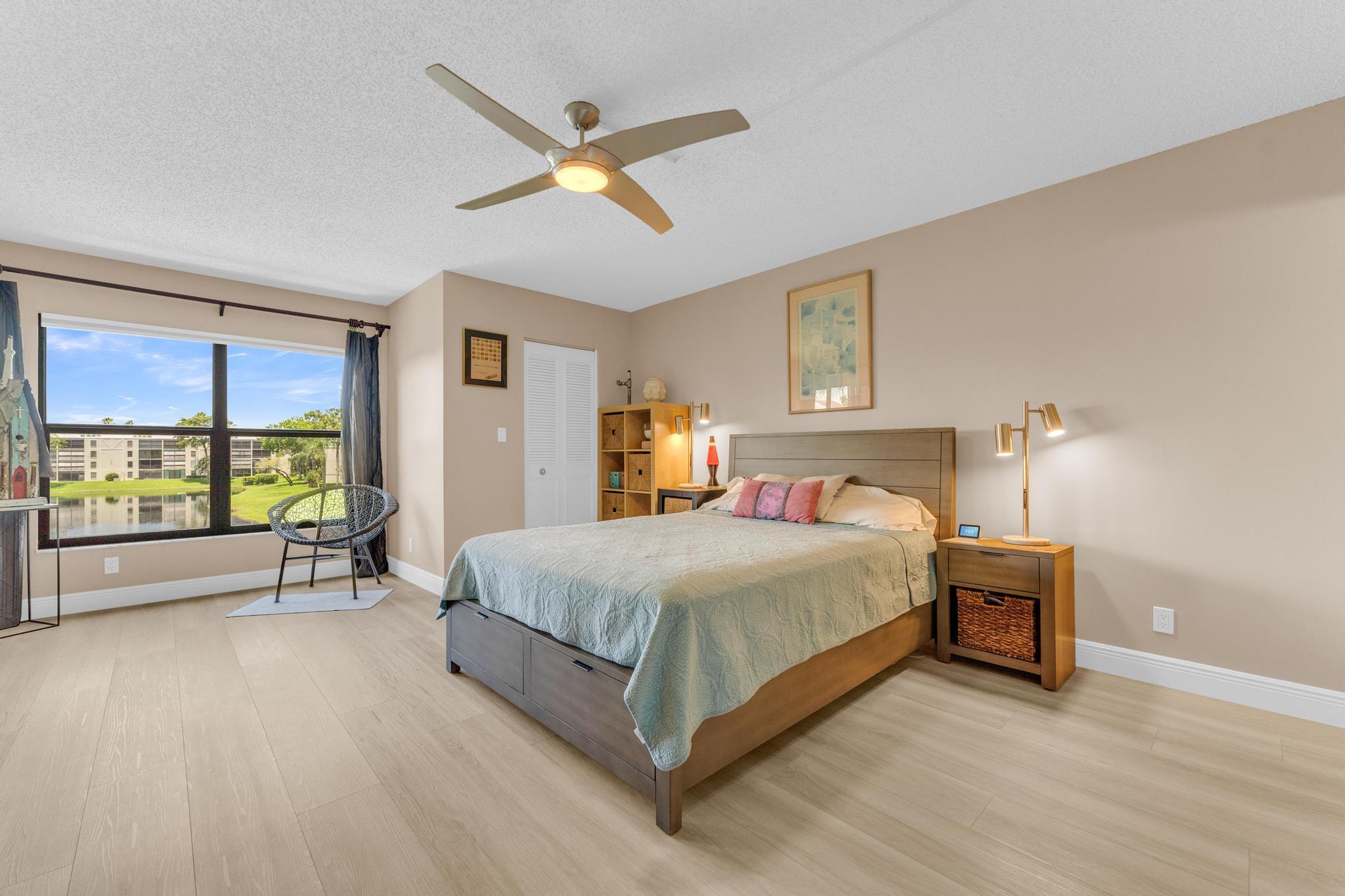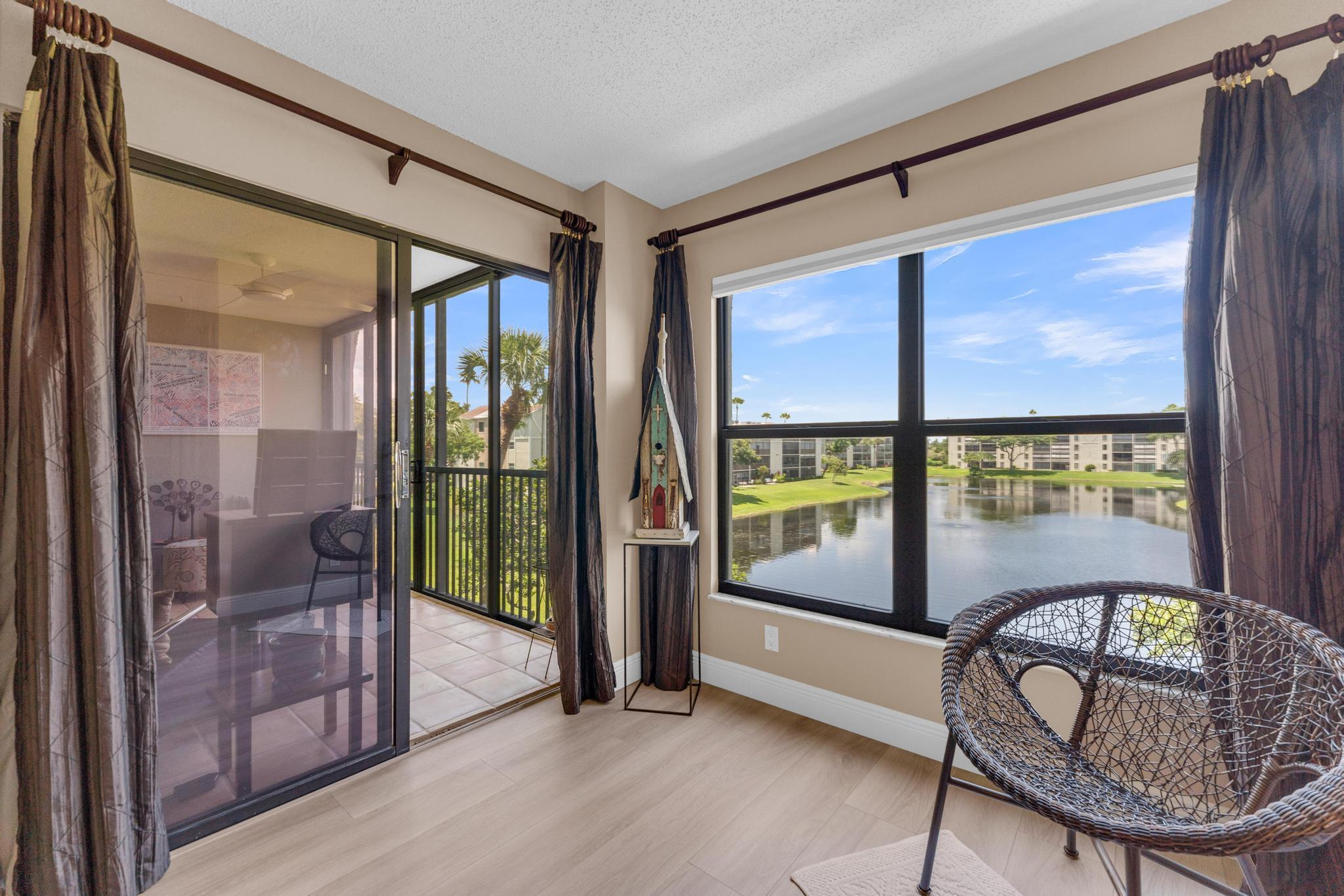 Beautiful condo PRICE DROP TO SELL!!! This is the Buckingham model. Largest in the community. Stunning, updated unit in mint condition. Direct center lake view. Warm and inviting colors. Shows like a model. Freshly painted! HURRICANE IMPACT windows and sliding doors The balcony has been totally opened to be a part of the living area. Sliding doors are gone!!! Large lovely diagonal rectified tile in the living area. High end vinyl flooring through the bedrooms. Beautifully renovated eat-in kitchen w/ high end wood cabinetry and granite countertops. Open and bright living, dining area w/ wet bar. X-large main bedroom w/ sitting area, 2 large walk-in closets, and tastefully updated bathroom. Large guest bedroom. Updated bathroom w/ shower and double sink vanity. Separate laundryroom.