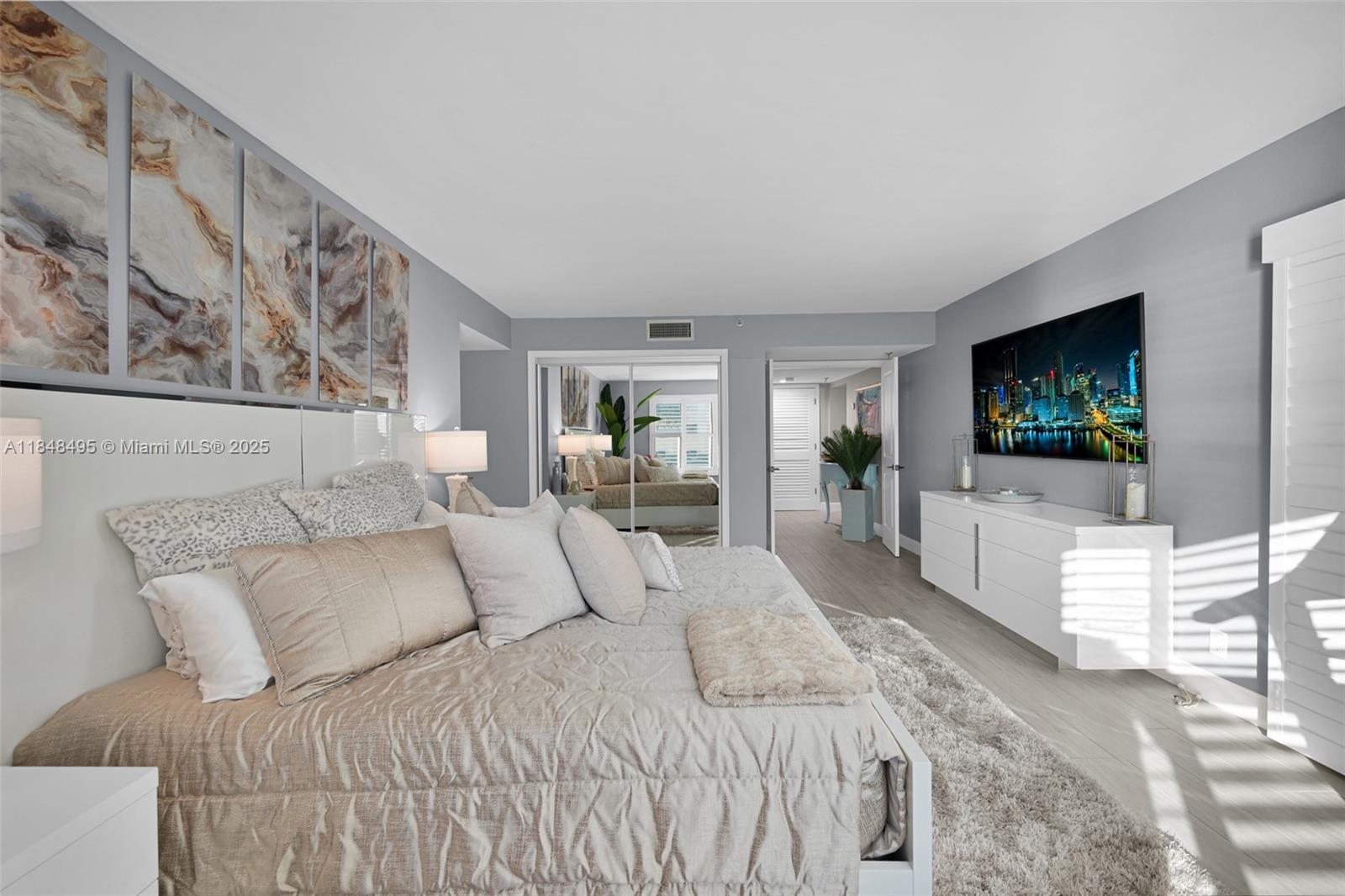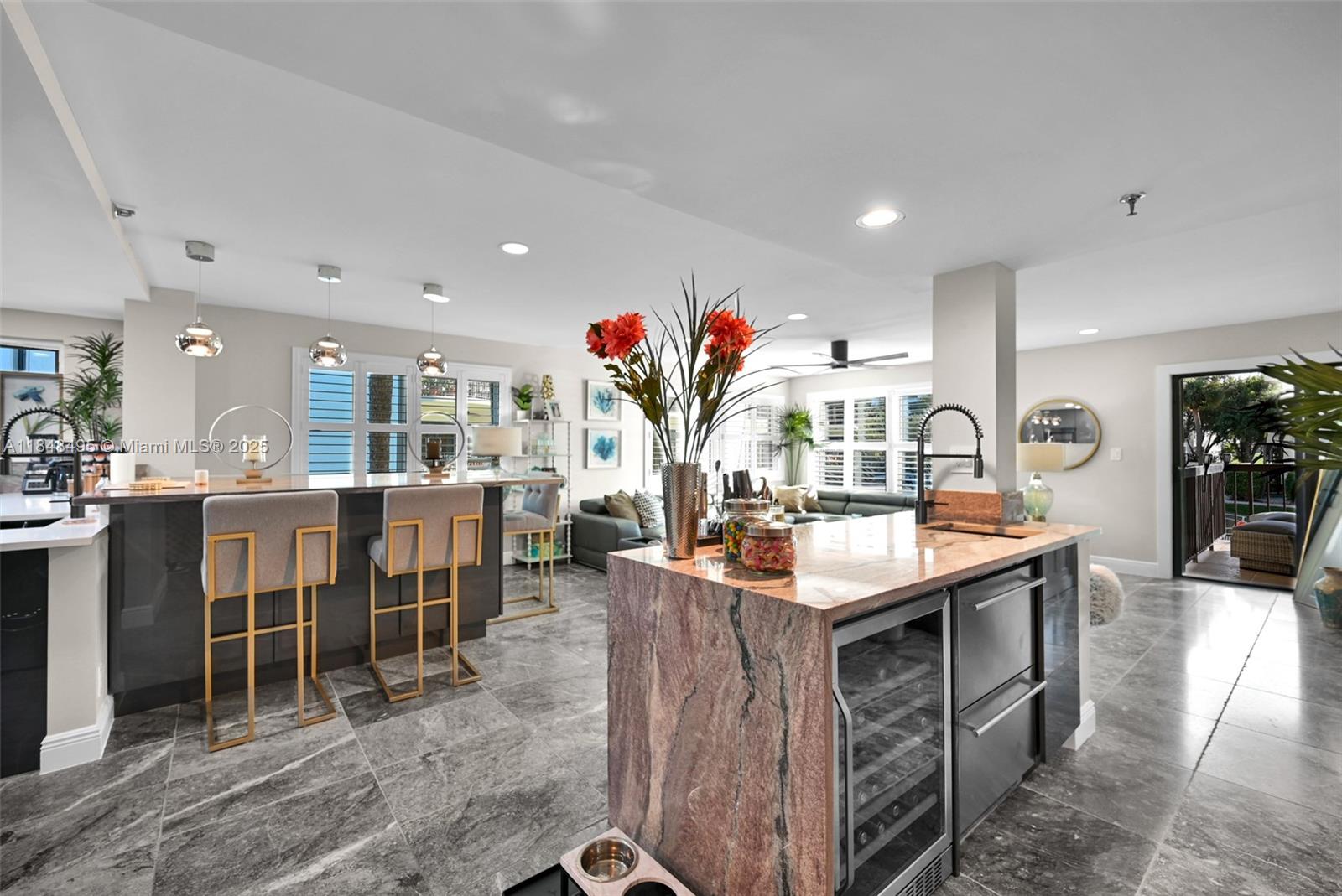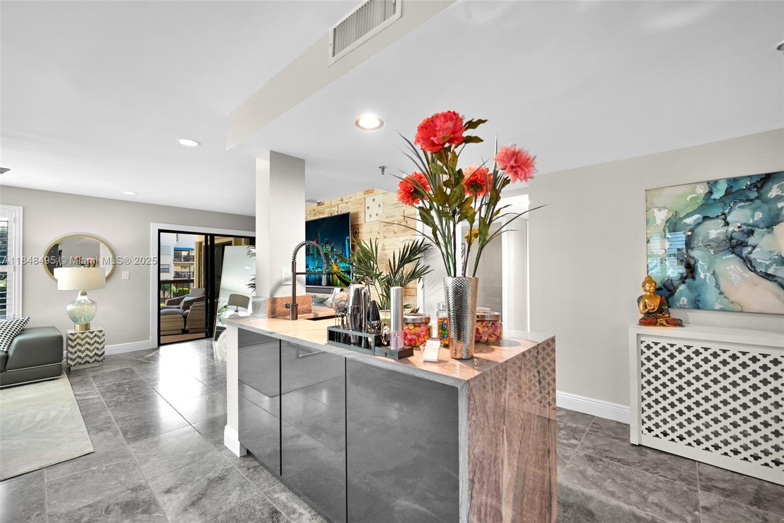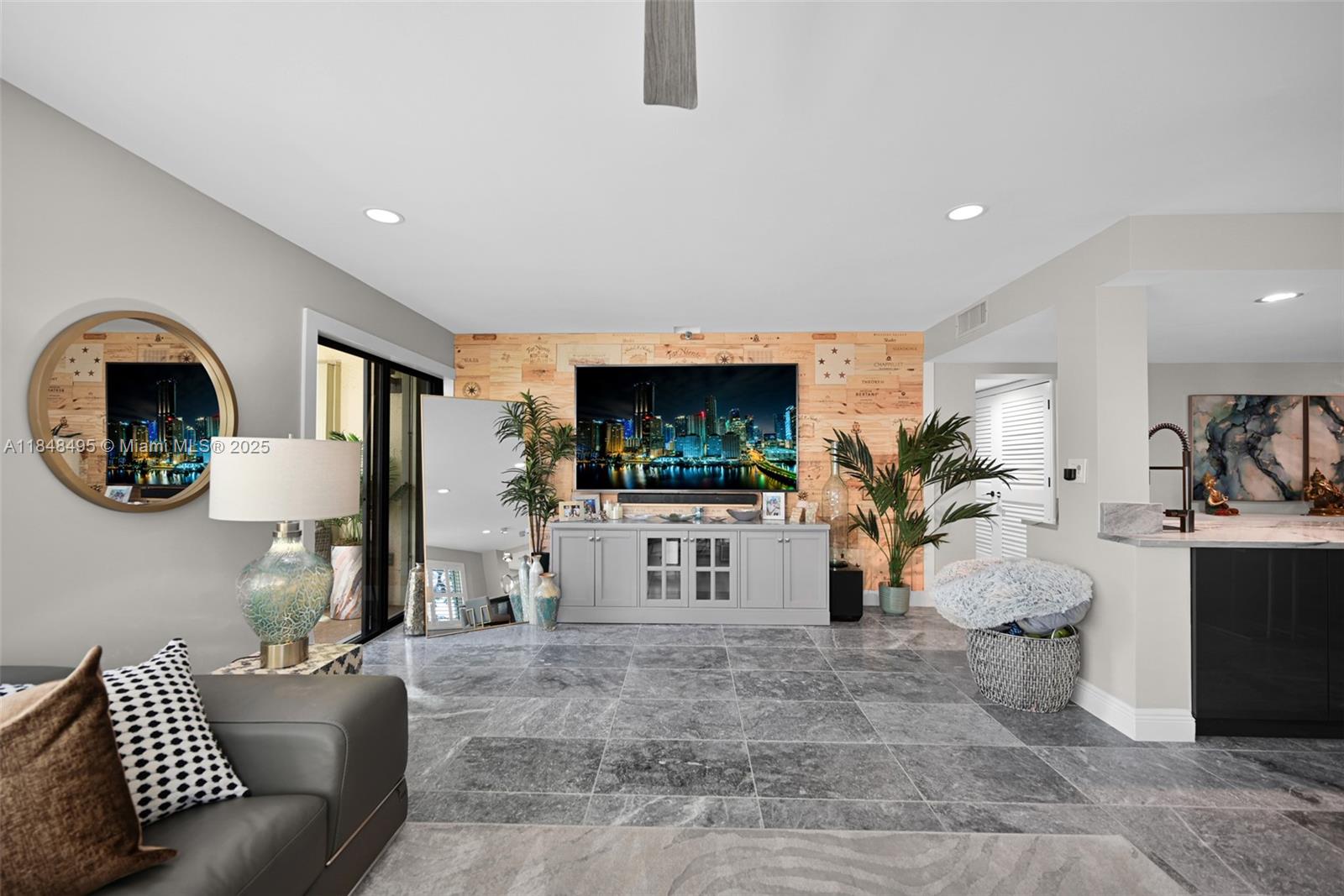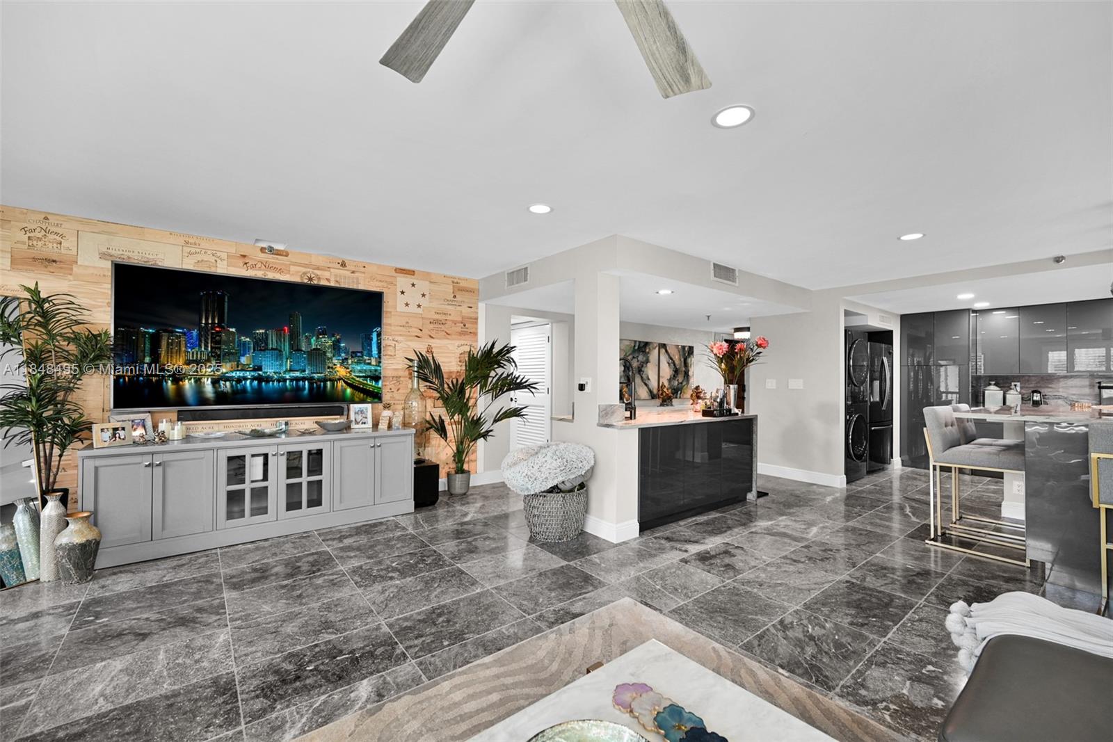 This beautifully remodeled 3-bedroom, 2-bathroom condo offers an exquisite blend of luxury and comfort. The open-concept floor plan creates a seamless flow throughout the home, featuring a stunning waterfall wet bar and a large wine fridge, perfect for both relaxation and entertaining. The kitchen is a true highlight, offering ample cabinetry and a generous space designed for cooking and hosting with ease.Large impact windows, The master bedroom is a serene retreat, complete with spacious his and hers walk-in closets, a dual sink vanity, a luxurious shower with dual showerheads, and a cozy sit-down area. The additional bedrooms are equally impressive, offering ample space and sizable closets.The unit is fully furnished and move-in ready—just bring your suitcase and settle in!