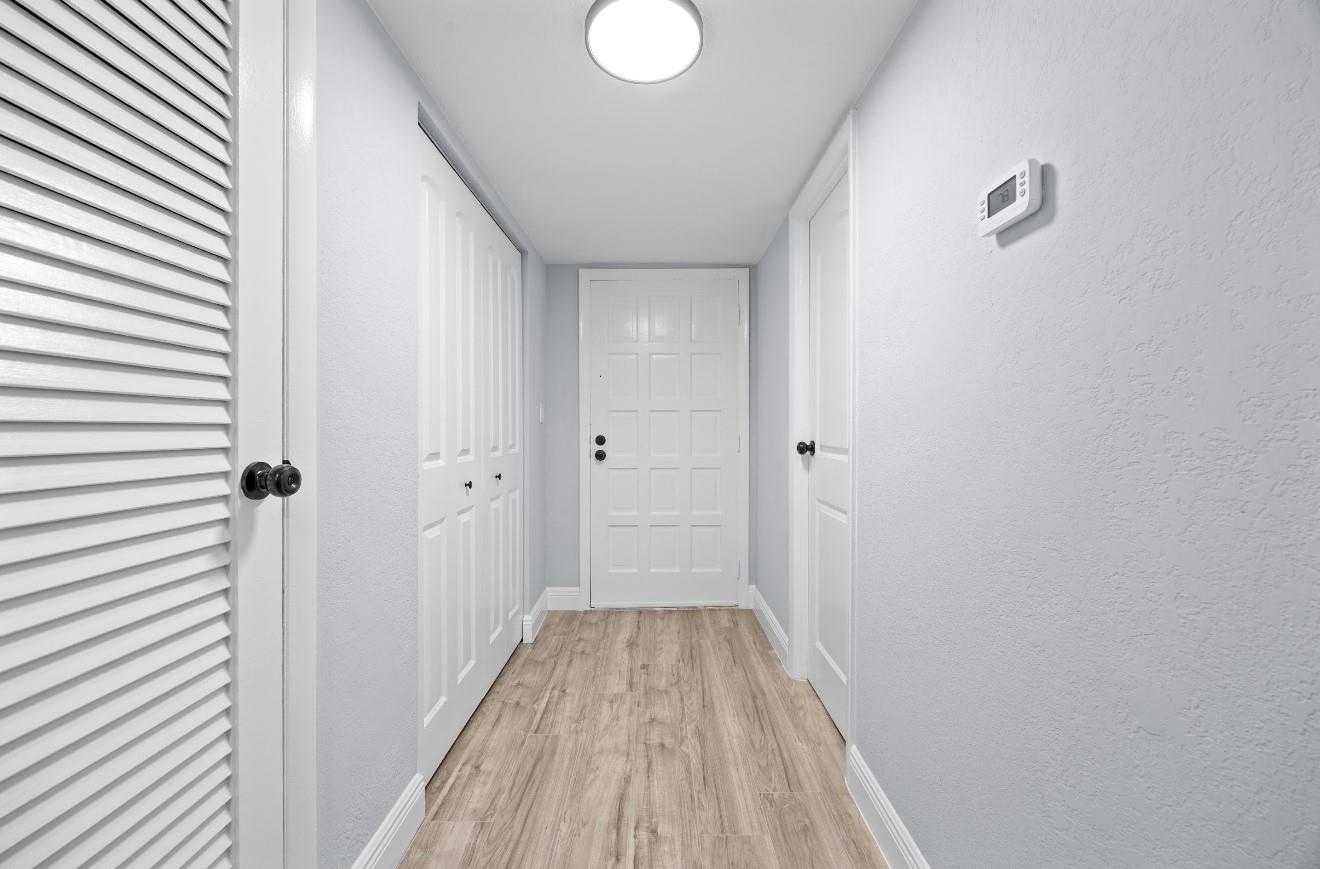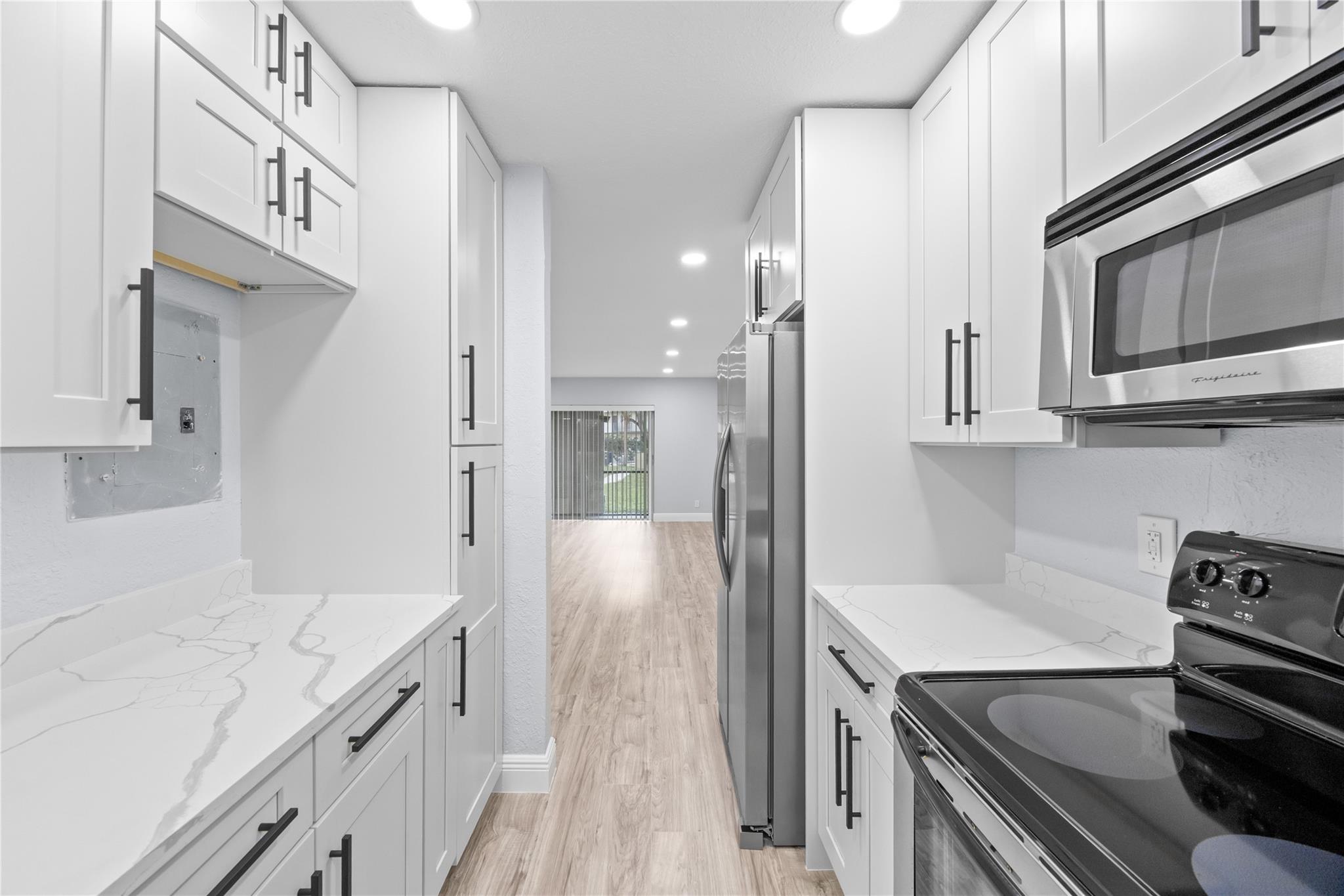 Beautifully Remodeled 1-Bedroom in Active Gated Community Welcome to this stunning ground-floor 1-bedroom, 1.5-bathroom unit, fully remodeled w/ brand-new laminate flooring throughout, a sleek white kitchen w/ quartz countertop, stainless steel appliances, & recessed lighting under smooth ceilings. The open living space flows seamlessly to a screened-in patio overlooking the sparkling community pool. The spacious primary suite features a large walk-in closet and an elegantly updated en-suite bathroom with modern fixtures. Additional highlights include a stylish powder room for guests and plenty of storage. Set in an active, gated community offering scenic walking trails, peaceful lakes, and a vibrant social scene, this turnkey unit blends comfort, style, and convenience.