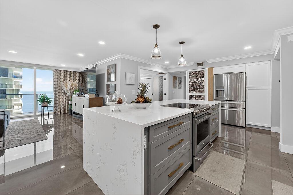 Introducing 5440 North Ocean, Unit 1404, Singer Island. This 2BR/2BA fully renovated waterfront condo delivers the strength, style, and location serious buyers look for. Built for performance and luxury, it features porcelain tile flooring, custom-built cabinetry, and quartz countertops with a bold waterfall edge finished in matte black and gold hardware.The chef-inspired kitchen showcases rich grey cabinetry, high end appliances, brushed gold finishes, a premium range with warming drawer, updated backsplash, a quartz slab with waterfall design, with an added wet bar adjacenta refined blend of form and function. The inunit washer/dryer adds everyday convenience.Tenant Occupied until October 2026