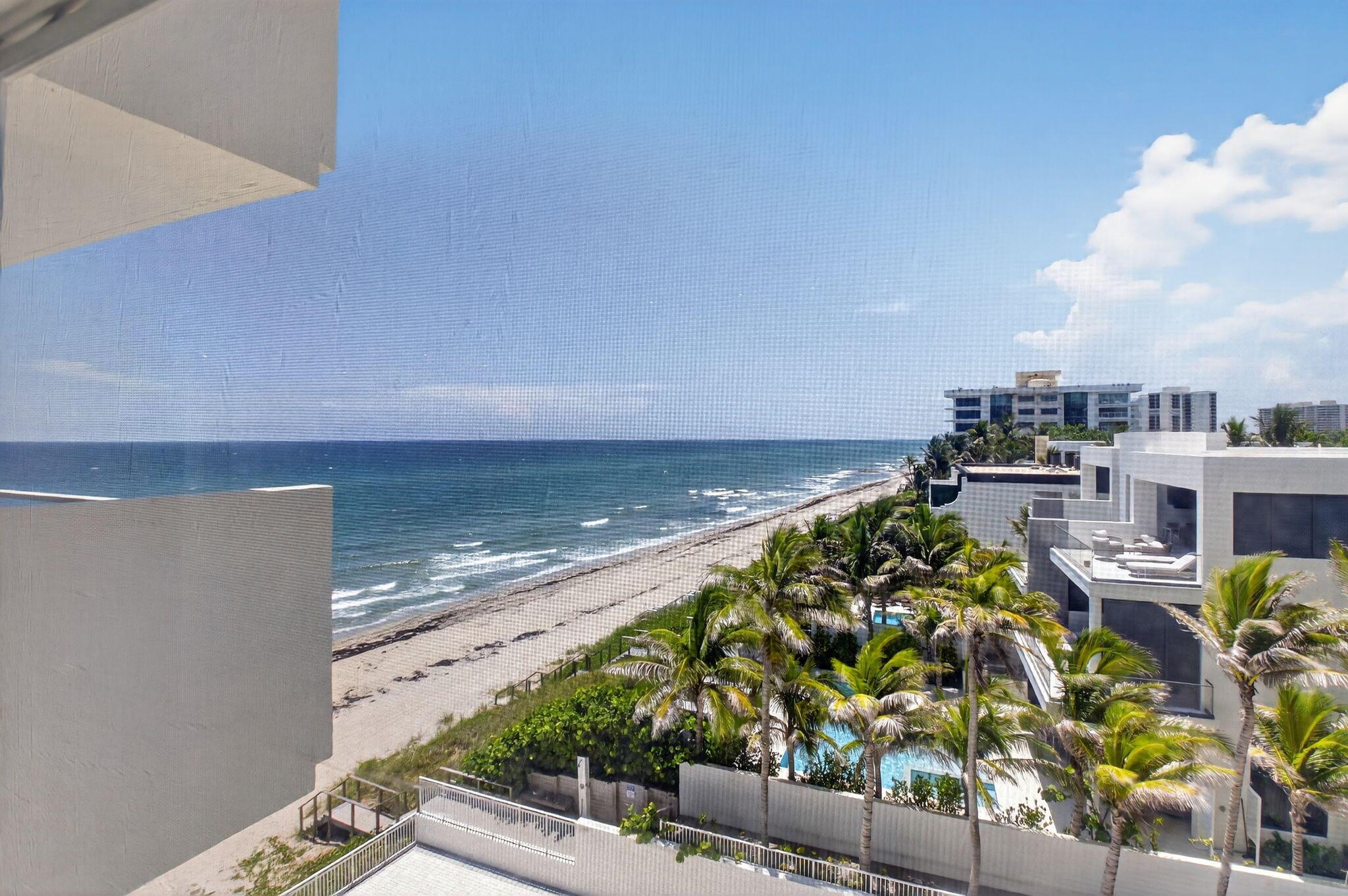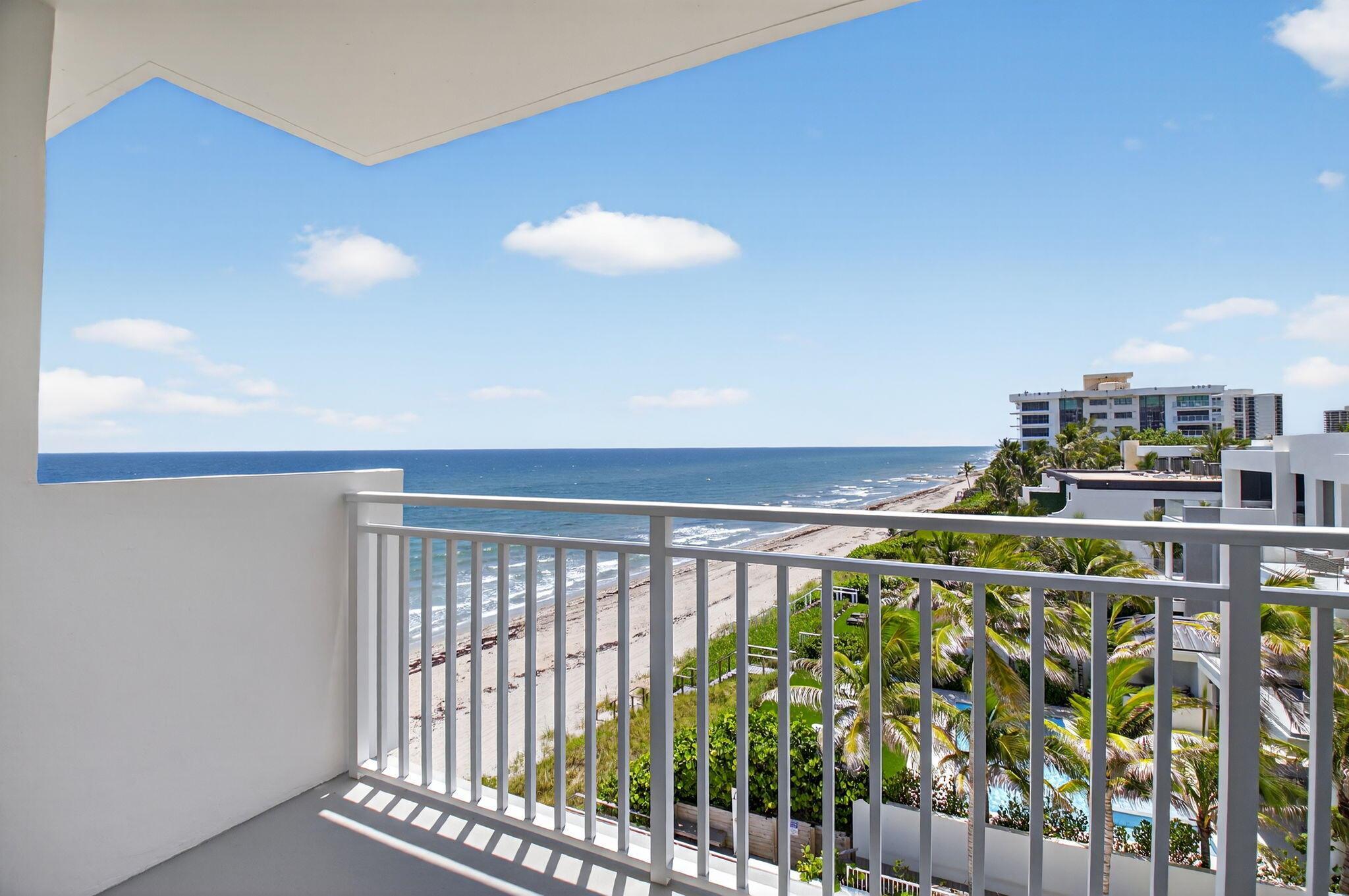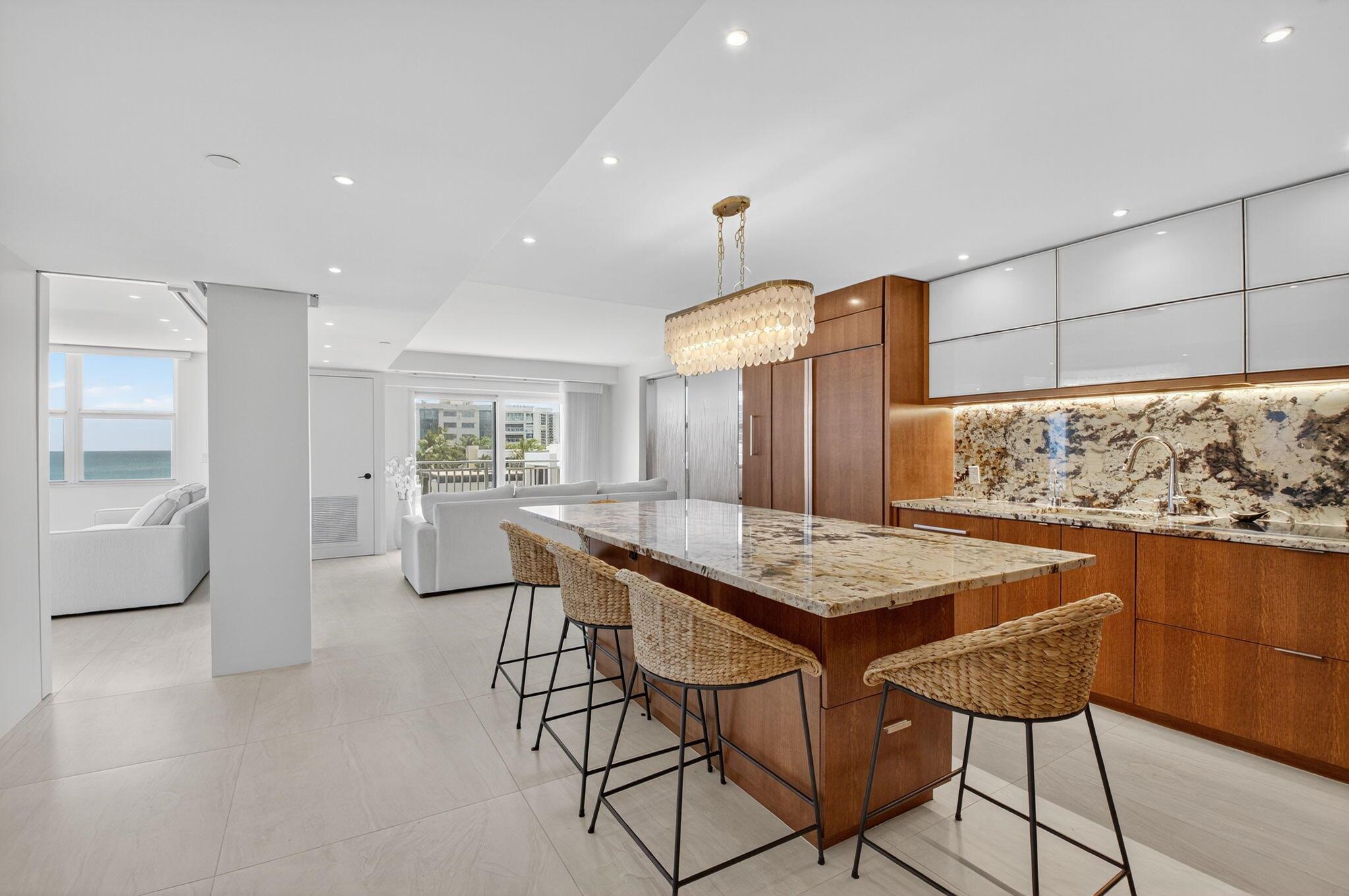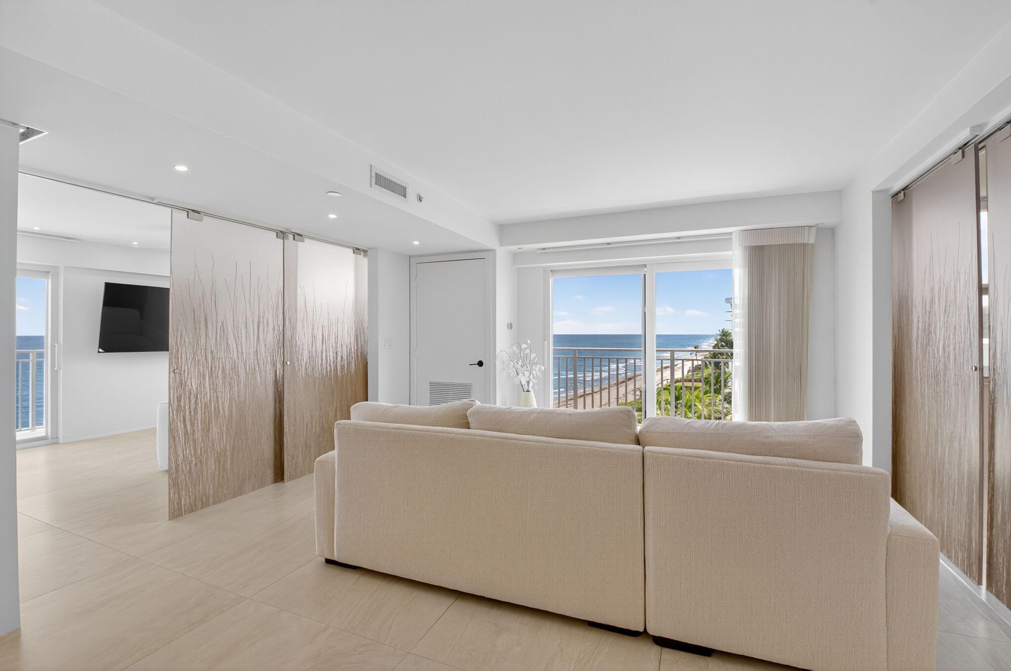 Coastal Luxury Living Redefined. Situated directly on the oceanfront, Residence 507 offers sophisticated living with uninterrupted ocean views from every room, including the primary bath. This fully integrated smart home captures the essence of coastal elegance, with two private balconies perfectly positioned for sunrise and sunset.The custom kitchen is the true centerpiece, designed for both function and entertaining, and appointed with Miele, Bosch, and Sub-Zero appliances, bespoke wood cabinetry, and an oversized island with seating for ten. Floor-to-ceiling glass doors frame the living space, creating a seamless connection between polished interiors and the breathtaking beauty of the ocean.