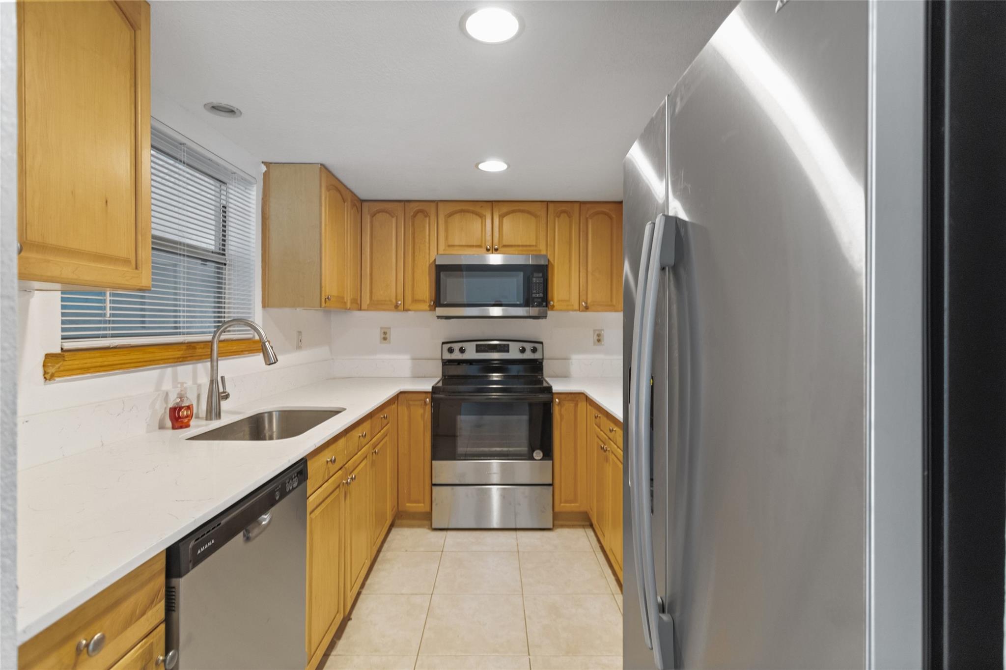 Lovely updated and spacious 2-bedroom, 2-bathroom unit featuring an enclosed patio perfect for relaxing. Updated kitchen boasts brand-new stainless steel appliances, stunning quartz countertops. Enjoy the convenience of an in-unit washer and dryer. Primary bathroom has been updated with a new vanity, walk-in shower, and new flooring. Both bedrooms feature new laminate flooring, the rest of the home with tile — no carpet anywhere! Freshly painted. New light fixtures. Pet friendly. New roof (2025) AC (2018) Water heater (2020)… Eligible for as low as 3.5% down payment. Ask about The Hometown Heroes Program. HOA Requirements: Minimum credit score required 650; Household income of at least $35,000/year; Debt-to-Income ratio under 40%. No rentals for first 3 years. All ages welcome.