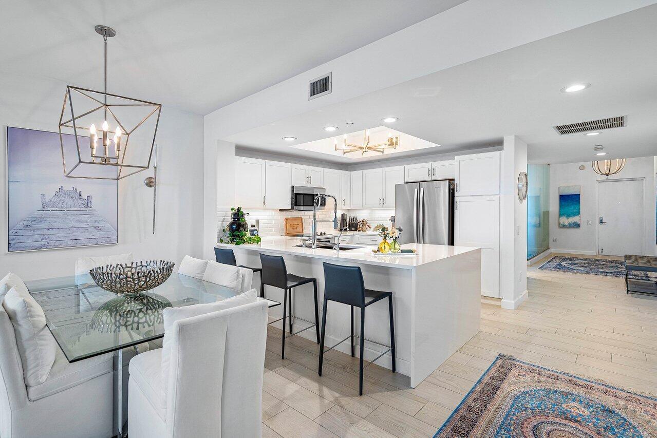 COMPLETELY REMODELED in 2021 - EXQUISITE FURNISHINGS NEGOTIABLE! Fabulous 2BR + den (easily converts to 3rd BR) was professionally renovated & elegantly furnished by renown Design Guild Interiors of Jupiter, FL with a sophisticated ''Urban Beach Lifestyle'. Porcelain plank floors, glass shower enclosures, upgraded vanities, custom kitchen w quartz countertops, custom closets. 3 flat screen TVs. This is Florida Lifestyle at its finest- Newly renovated rooftop oasis w/pool, spa, BBQ areas, tennis, pickleball, bocce. Clubhouse, billiard room & fitness center. 24 hr manned gate, temperature controlled storage, walk to Publix. Marina w/dry docks available. Jump on your boat effortlessly & be on the ocean in minutes; no fixed bridges! Pet friendly.