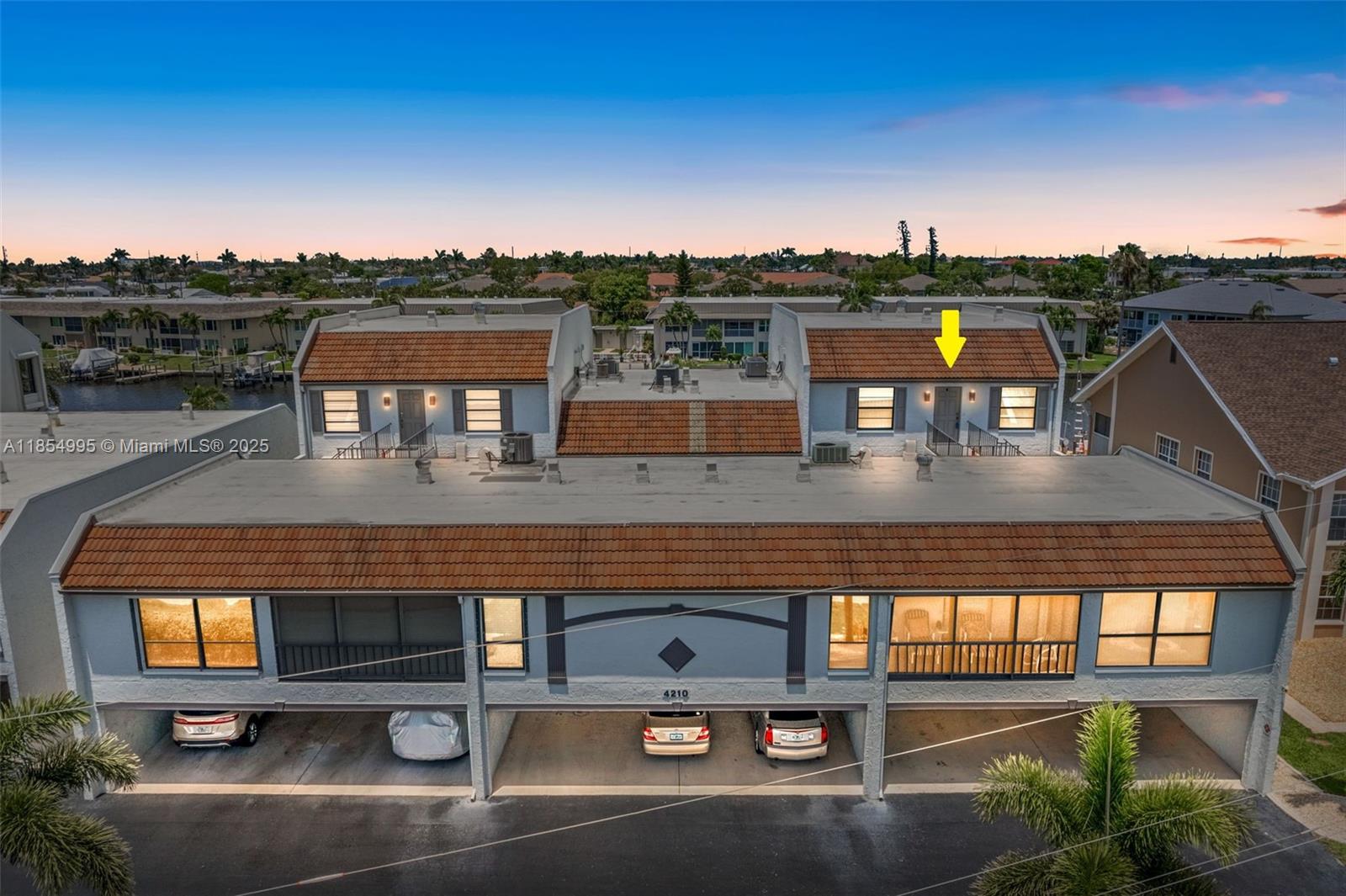 PENTHOUSE with DIRECT GULF ACCESS & STUNNING WATERFRONT VIEWS! Across from the exciting Jaycee Park renovation in SE Cape Coral, this FULLY FURNISHED 2BR/2BA top-floor condo overlooks the 200+ ft Navarro Canal with just one turn to the river & Gulf. Enjoy a private screened balcony/sunroom, vaulted ceilings, impact windows, stone feature wall, spacious kitchen, walk-in closet, and in-unit laundry. Community offers crystal-clear pool, scenic walkways, and optional dockage (assessments paid). Newer A/C, water heater, range, disposal, and re-piped plumbing. Beach Pkwy Promenade location close to SWFL’s best beaches, dining, and shopping. 55+ community, move-in ready—live the Florida waterfront lifestyle!