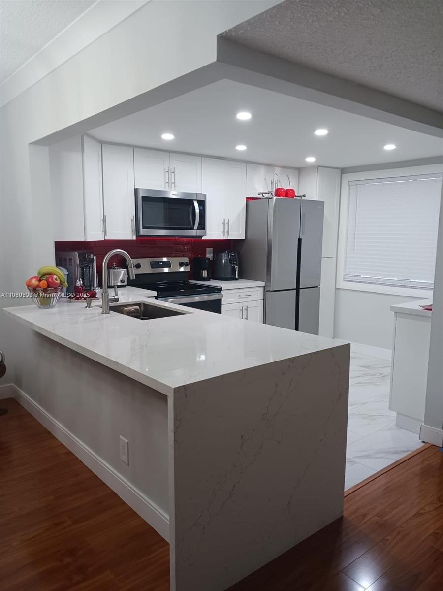 Exquisitely presented unit in a 55+ community offers luxurious living in a tranquil setting. Spanning 1,364 SF. Features 3 bd + 2 bth, perfectly designed for comfort and convenience. Beautiful tile and wood floors throughout. Stunning quartz countertops gives space for cooking and entertaining. Convenient washer-dryer in unit. This corner unit adds privacy, less noise and more natural light. Community Amenities: gated community access. Social activities at the clubhouse. Professional management on-site. Five heated pools. Enjoy peaceful moments by the canal, with areas to sit and relax. Stay connected with internet and cable included in the community services. Chandelier not included. Unit can be rented after 1 yr.