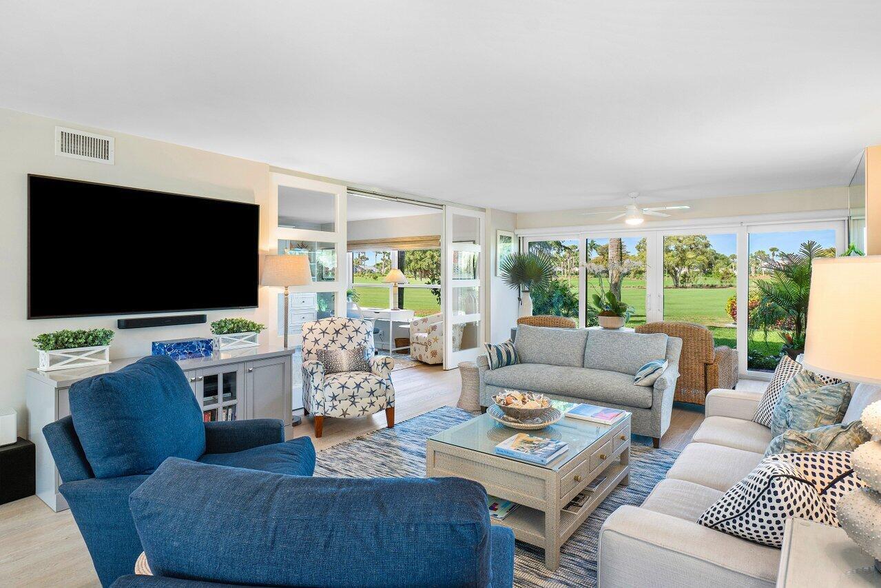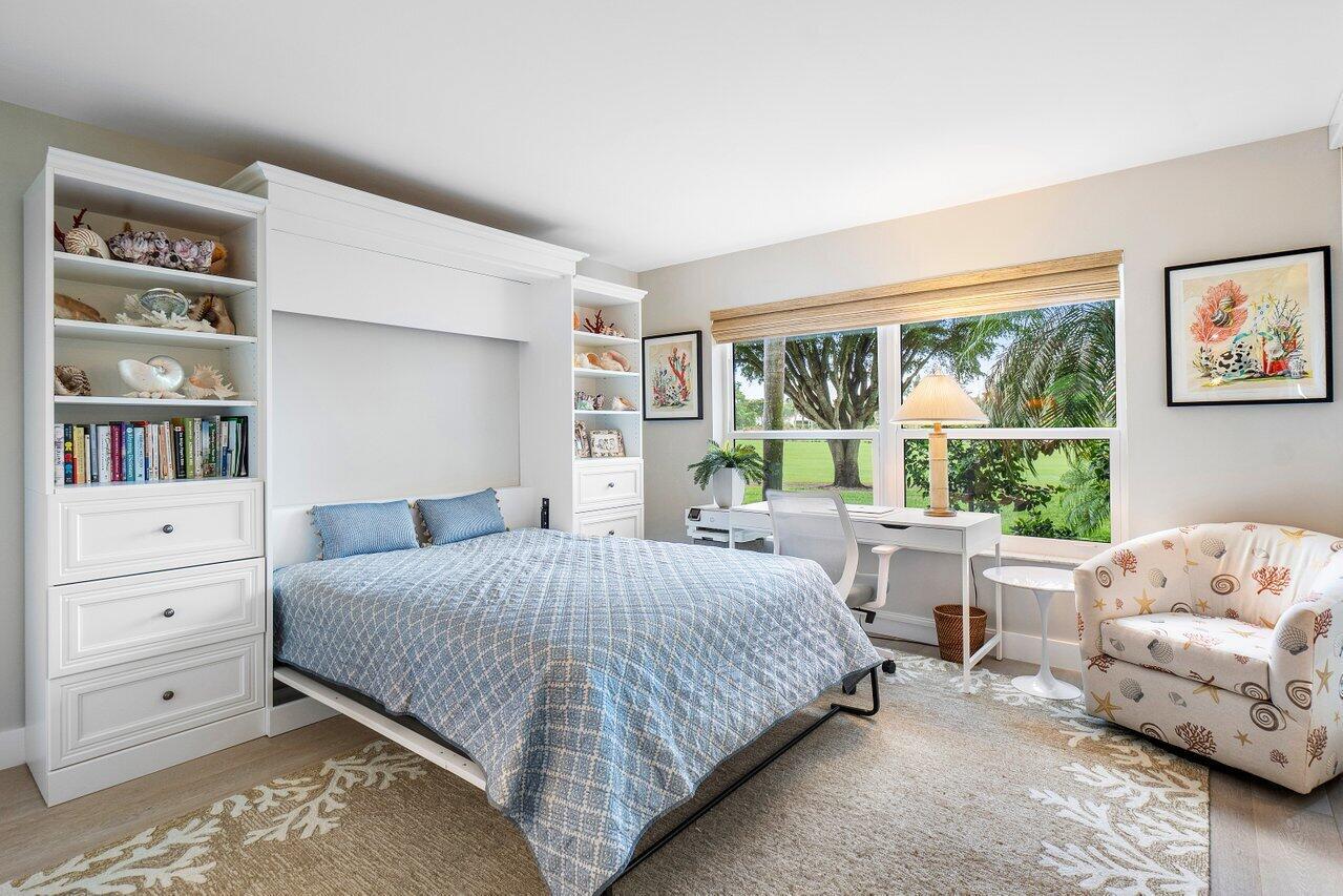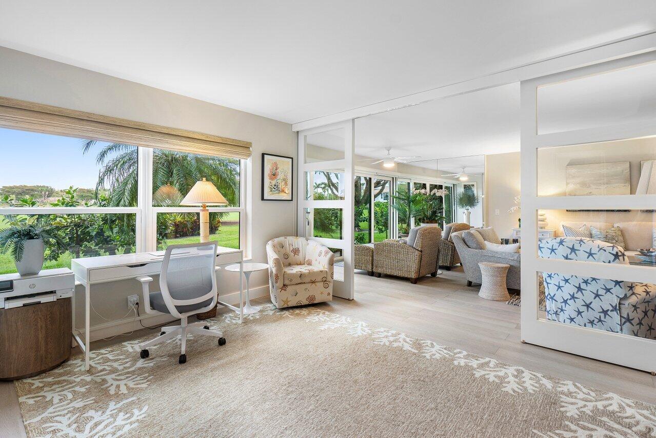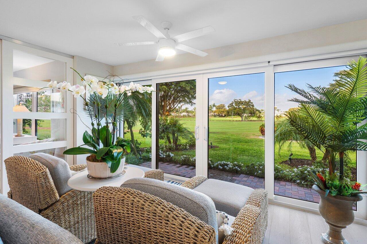 Beautifully renovated 3-bedroom, 2-bath first-floor residence, offering double fairway views of the newly renovated North course. With all impact glass windows, you'll enjoy peace of mind and energy efficiency. The open floor plan features a spacious living area that seamlessly flows into the updated kitchen, complete with sleek white cabinetry and elegant countertops. The kitchen also boasts a built-in banquette in the breakfast area. The den offers a convenient Murphy bed for added flexibility, whether used as a guest room or home office. Step outside onto your private open patio, perfect for relaxing and entertaining. Quail Ridge offers many upscale amenities - golf, tennis, pickle ball, clubhouse with dining and social events all in a vibrant community atmosphere.