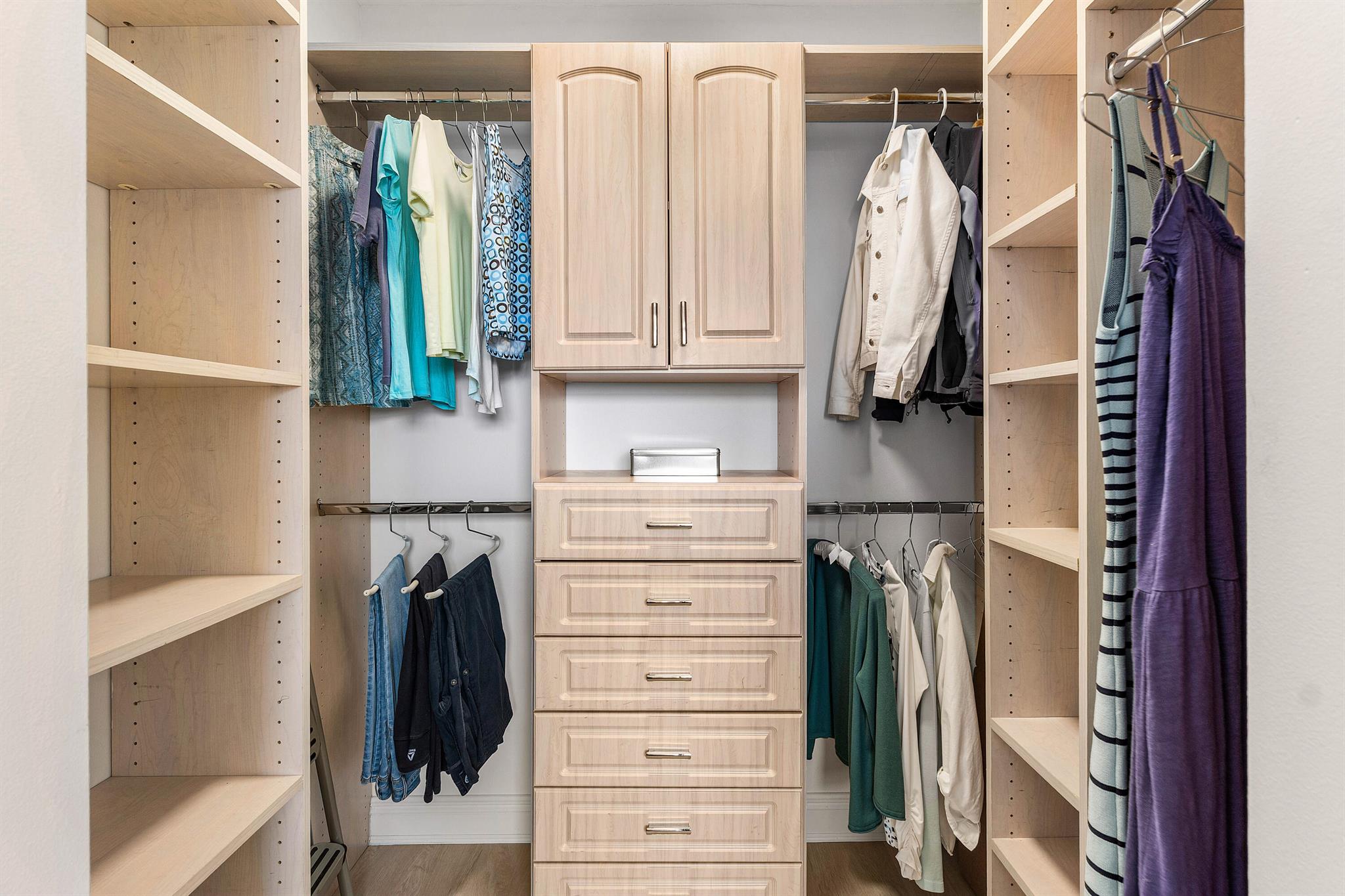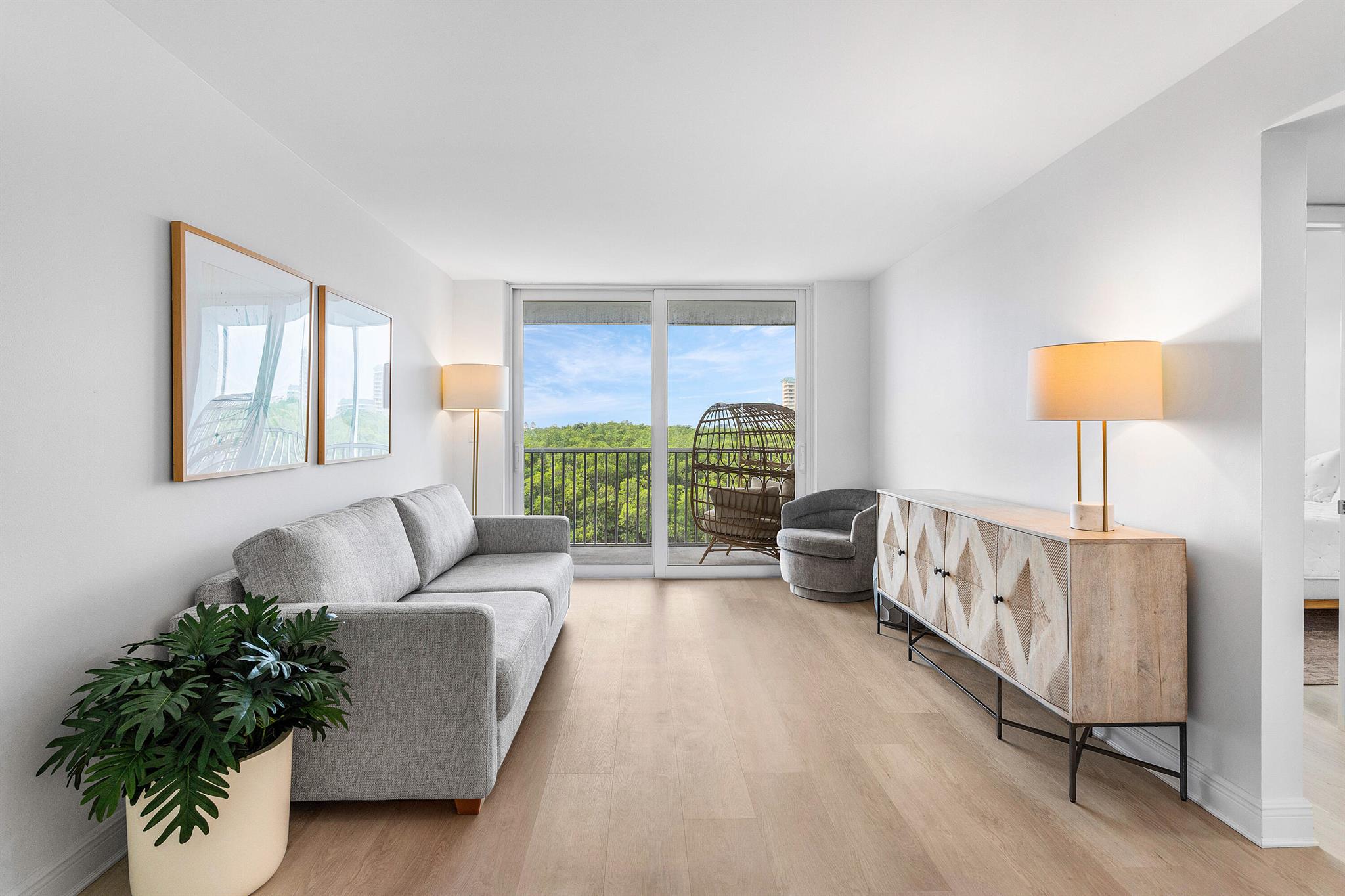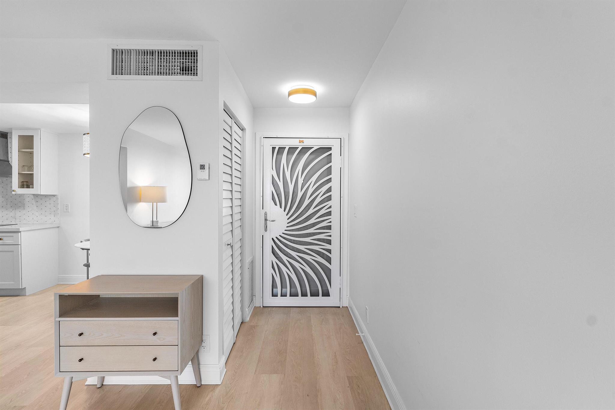 Experience waterfront living at its finest in this beautifully renovated penthouse on the Intracoastal. Filled with natural light throughout, this bright and airy one bedroom, one bath residence features a sleek walk-in shower and a spacious bedroom with plantation shutters framing exceptional water views, plus a generous walk-in closet with custom built-ins.A coastal-inspired custom bookshelf in the hallway leads to the primary bedroom, adding both charm and functionality. The thoughtfully designed kitchen showcases quartz countertops, a wall oven, open-concept shelving, and abundant cabinetry with drawer storage, all seamlessly flowing into the inviting eat-in dining area.