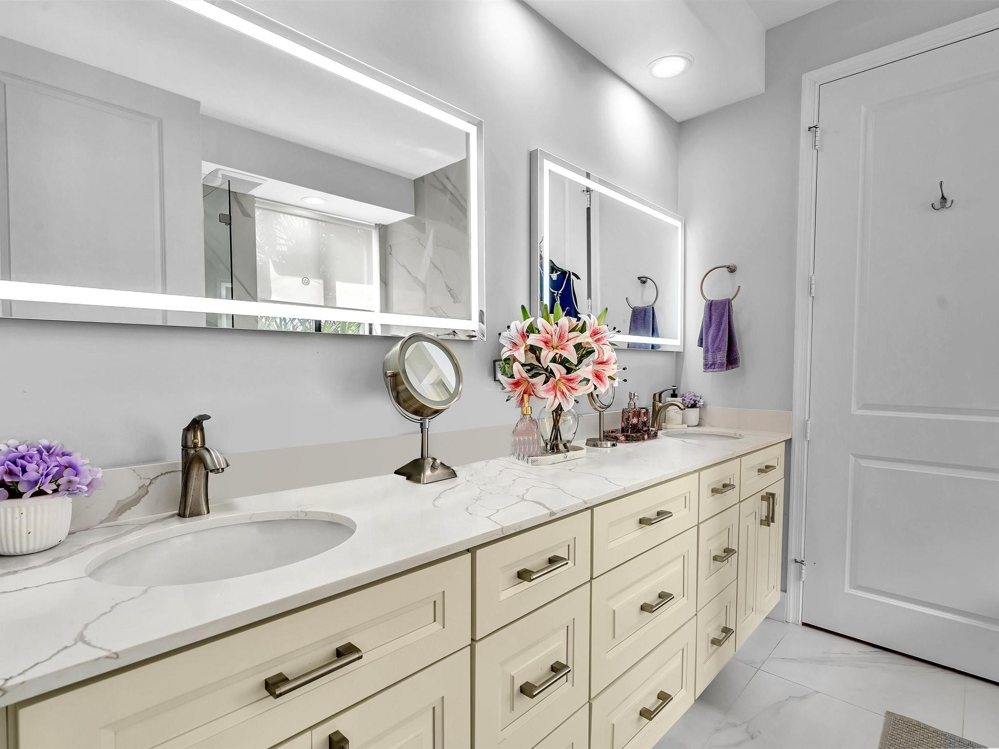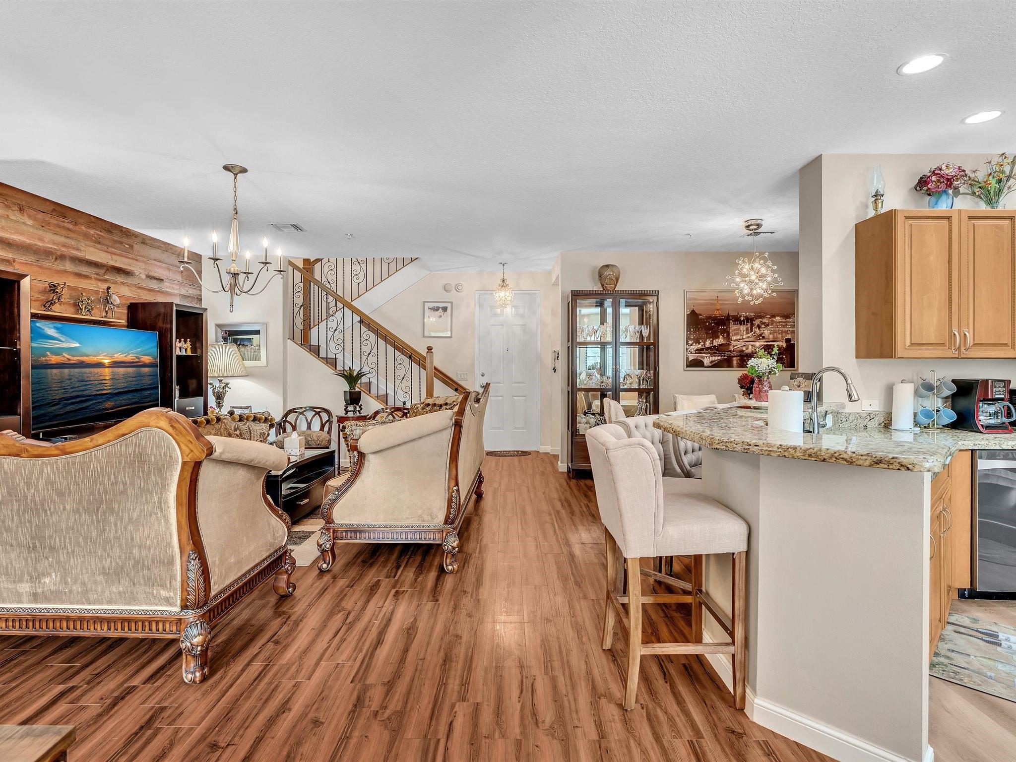 This stunning Artesia Botanica model offers the ultimate in luxury and convenience. Experience townhouse-style living within a secure building - no elevators needed with direct ground-level access! This highly desirable and rarely available floor plan features 2 bedrooms, 2.5 baths, plus versatile den converted to 3rd bedroom. Gourmet kitchen showcases rich wood cabinetry, granite countertops, and stainless steel appliances. Elegant wood-like flooring throughout. Cedar wood accent wall. Custom shelving in all closets. 5 ton a/c unit (2023). New light fixtures & fans. Impact doors & windows. Expansive master suite boasts dual vanities in the spa-like master bath. Exceptional convenience with 2 assigned covered parking spaces directly next to your private back entrance. Don't miss this one!