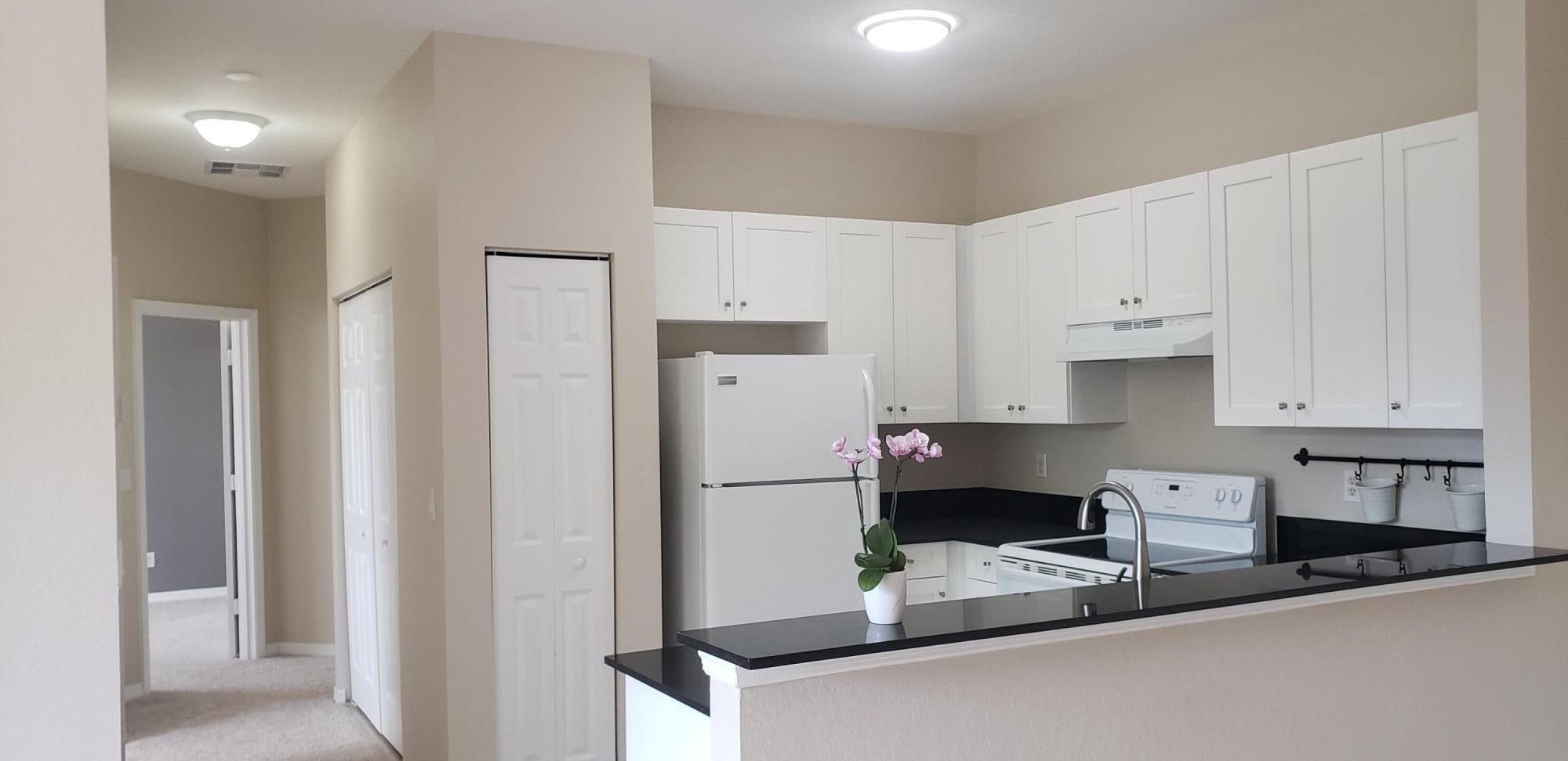 Move-in-ready! Newly painted. New flooring. New window coverings and fixtures. Updated kitchen and bathrooms with shaker cabinets and granite countertops. This 2bed/2bath Corner unit with attached garage and private driveway offers Like-new appliances. Newer A/C. Large walk-in closet. Laundry inside unit. Lots of natural light and storage. Private balcony. Excellent location in the desirable Magnolia Bay gated community. Water utilities, alarm monitoring, roof and exterior building maintenance included. All ages welcome. Pet-friendly community. No waiting period to rent. Plenty of guest parking. Community pool. Walking distance to local schools, shops, parks. Minutes from Okeeheelee Park with a nature center, fitness trails, sports, water activities. Close to beaches, highways, and more.