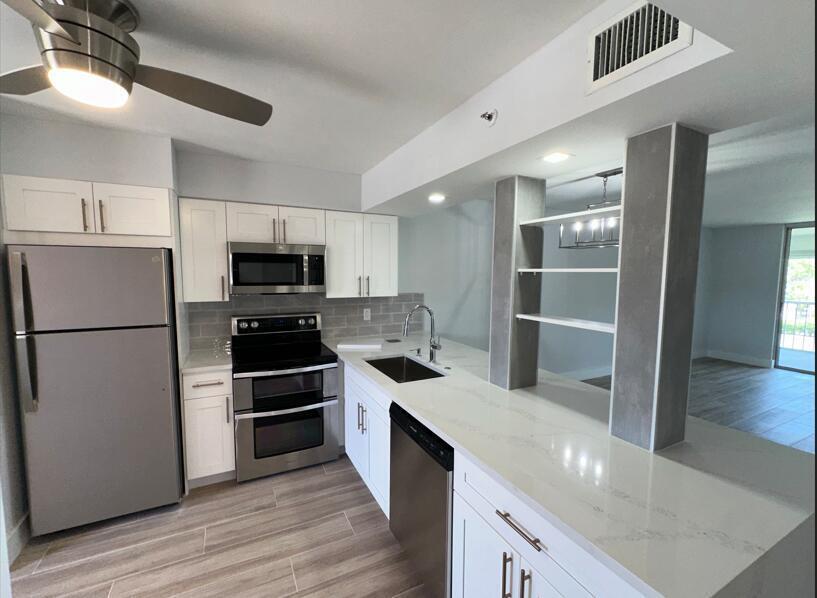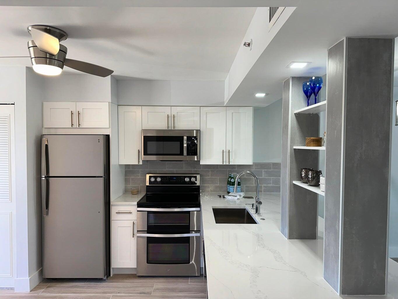Available furnished PALM BEACH LIFESTYLE for season or year-round in this 2 bed/2 bath condo overlooking sparkling waterways. Updated MODERN TOUCHES. Kitchen open living spaces, WATERFALL QUARTZ COUNTER and DECORATIVE SHELVES. Spacious bathrooms, FLOATING VANITIES, PEBBLESTONE SHOWER FLOOR as well as MARBLE-LOOK WALL TILES. Gorgeous light-colored WOOD-LIKE TILE FLOORS give the feel of a beach cottage. MODERN CHANDELIER and LIGHT FIXTURES complete this condo updates. Elevator just steps to front door. Close to shops, restaurants, Delray beaches, nightlife of Atlantic Ave and Delray Marketplace. Villages of Oriole Bonaire is a quiet enclave which offers clubhouse, pool, fitness center.