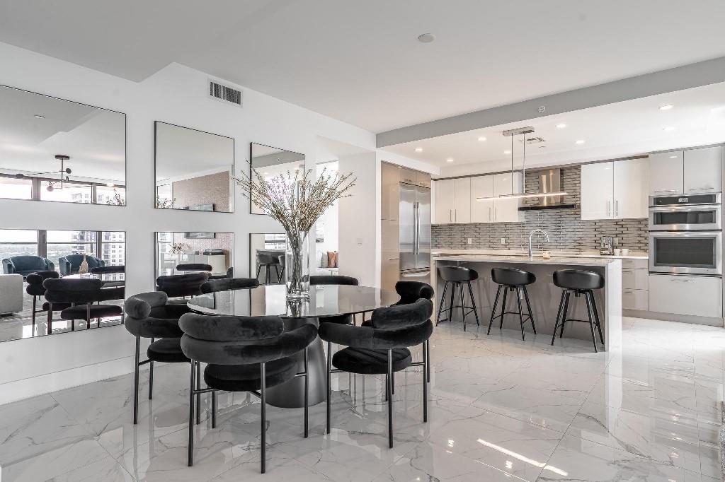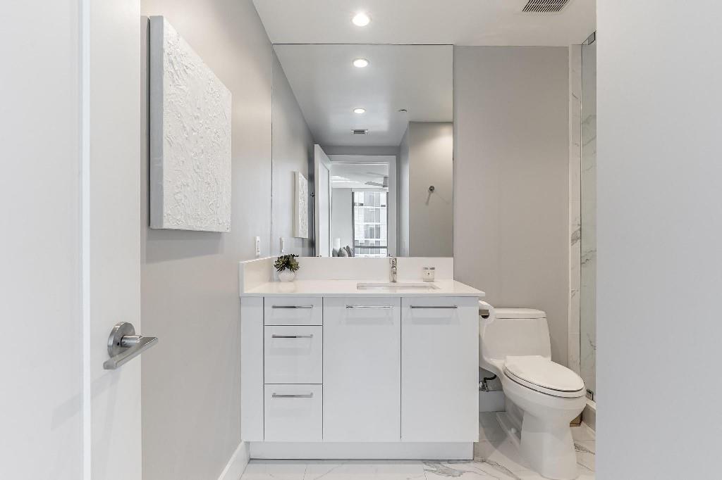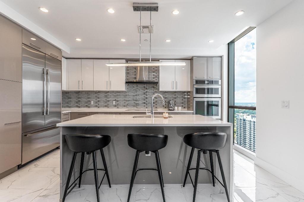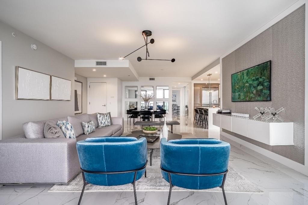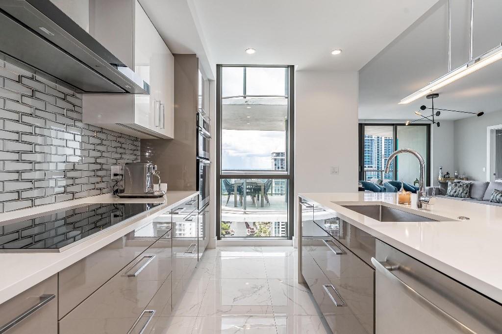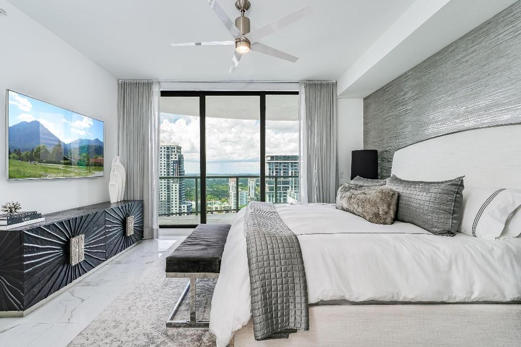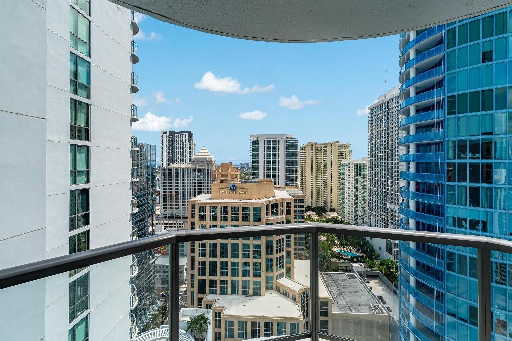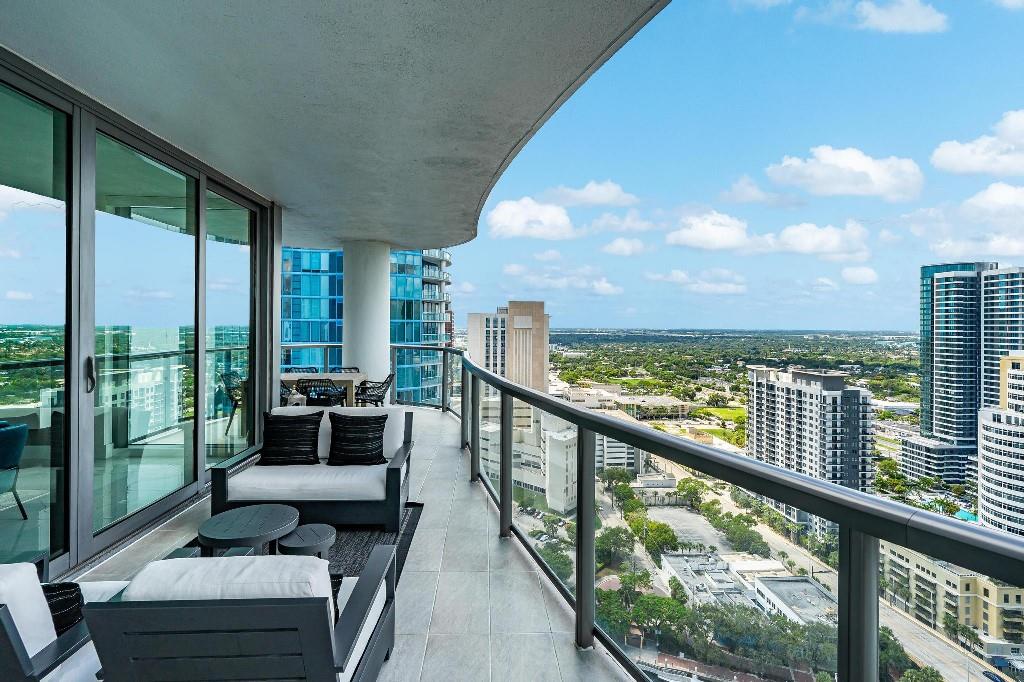 Sophisticated 30th floor residence in the premier 100 Las Olas tower, offering exceptional river, city, and skyline views from every room. This 2-bedroom + den, 3-bath layout is one of the building’s most desirable floor plans, featuring 9’ floor-to-ceiling windows and an expansive 550 sq ft wraparound terrace. Interior upgrades include porcelain tile flooring, quartz countertops, motorized blinds, custom closets, designer lighting, and built-ins. The flexible den functions as an office or optional 3rd bedroom. Two premium side-by-side EV-ready parking spaces included. Enjoy full-service luxury living with high-end amenities and immediate access to the dining, shopping, and energy of Las Olas.