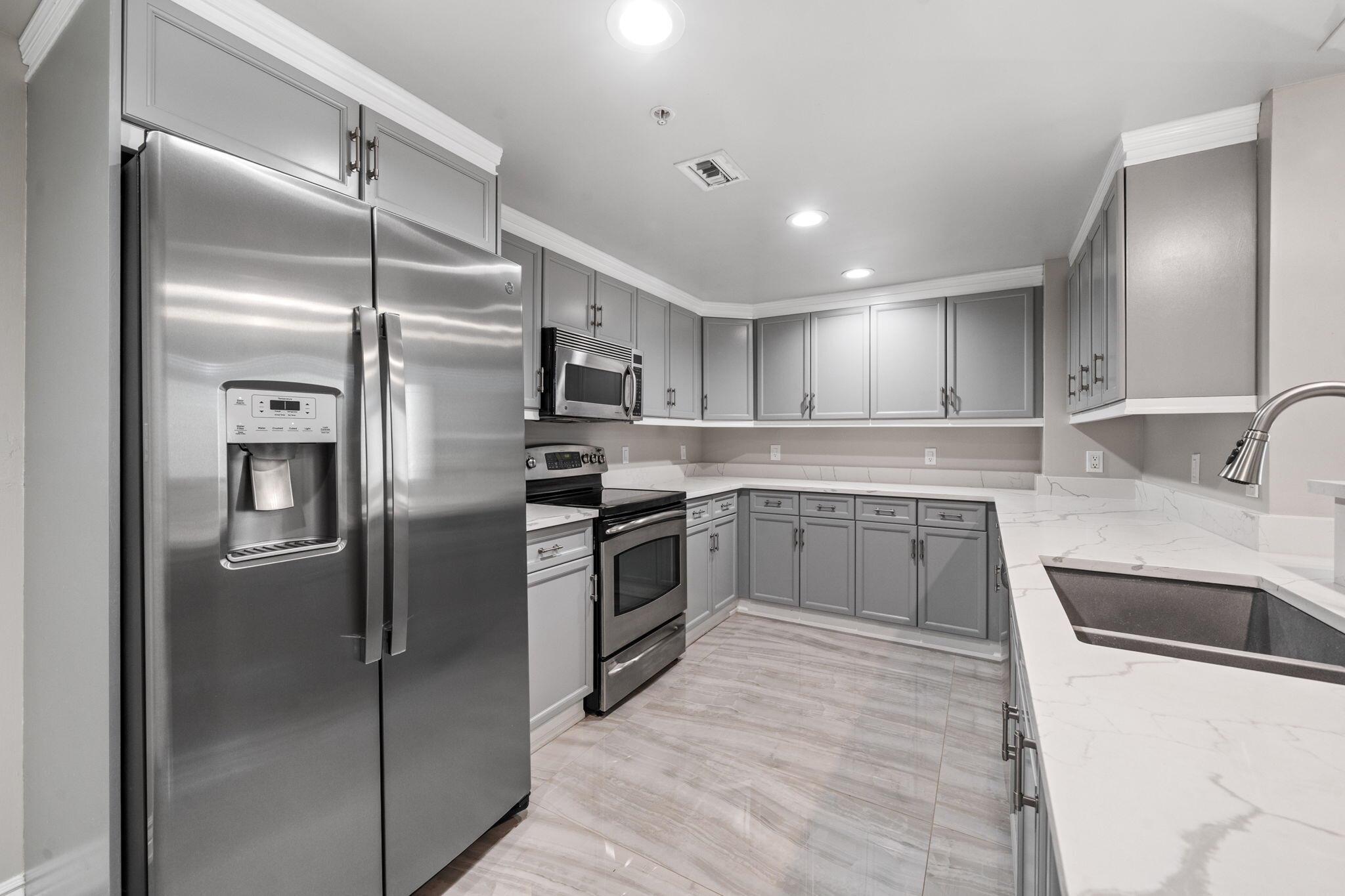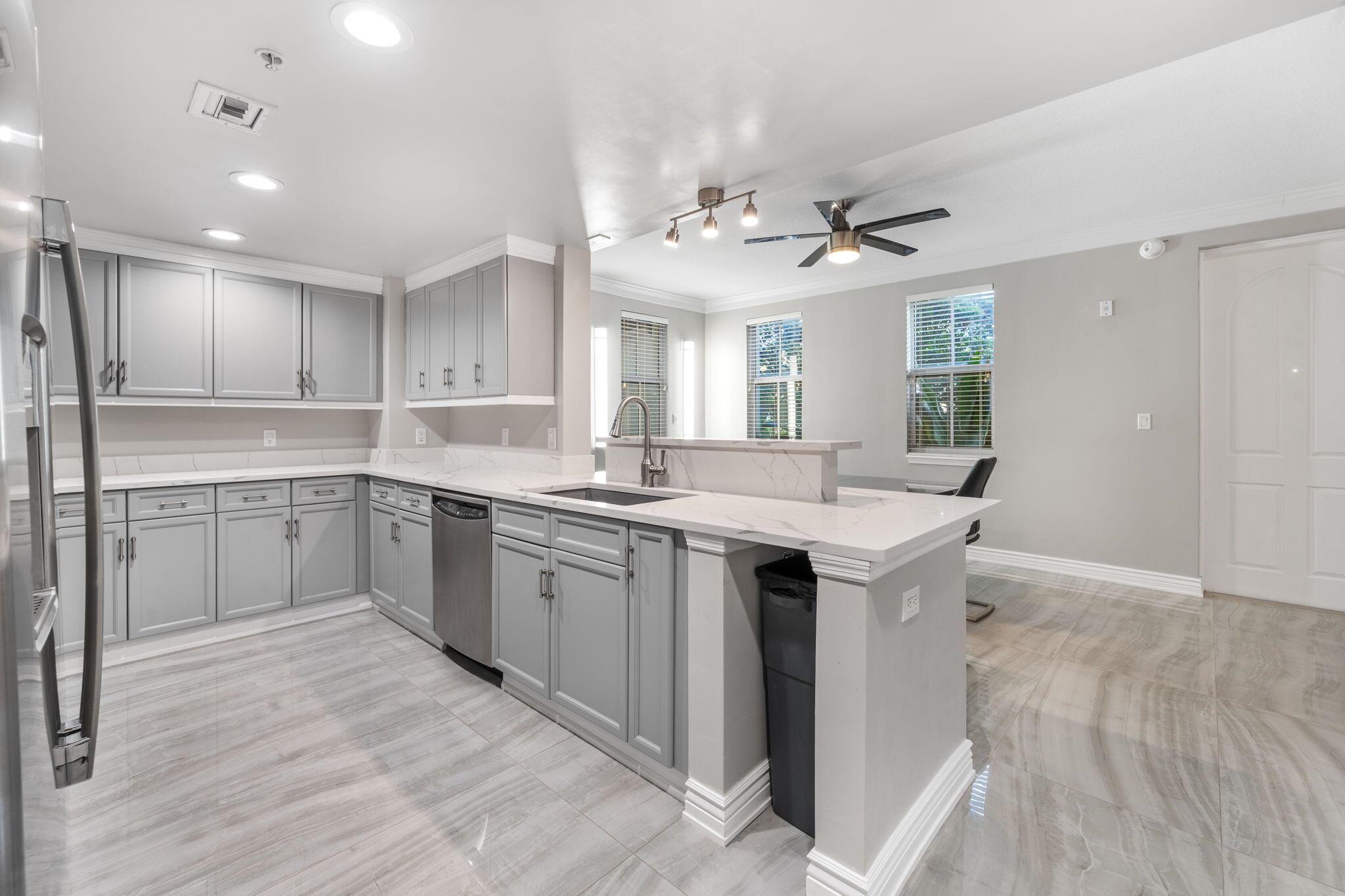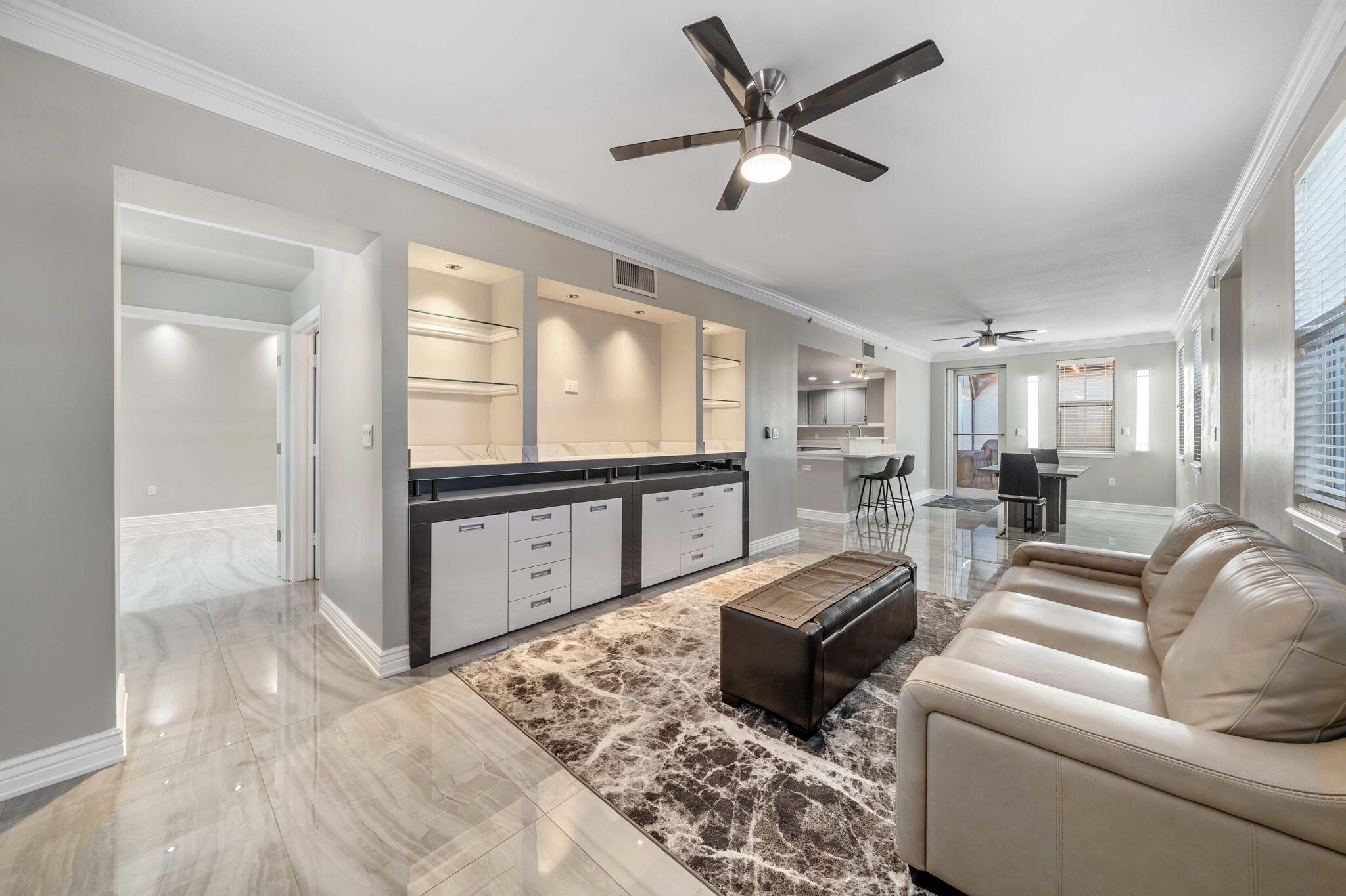 New Price!! Experience luxury living on the Intracoastal at Flagler Landing, a gated waterfront community in West Palm Beach. This beautifully updated 1-bedroom, 1-bath residence blends sophistication, comfort, and convenience, featuring a brand new AC and high-end finishes throughout. The renovated kitchen opens up to a spacious living and dining area, anchored by a custom entertainment center and flowing seamlessly to a private patio--your perfect spot to unwind or entertain. Double doors lead to a grand bedroom retreat with custom closet shelving and abundant natural light. As a first-floor residence, everyday living is effortless with two private entrances, a deeded garage parking space located just steps from the door, and a trash chute nearby.