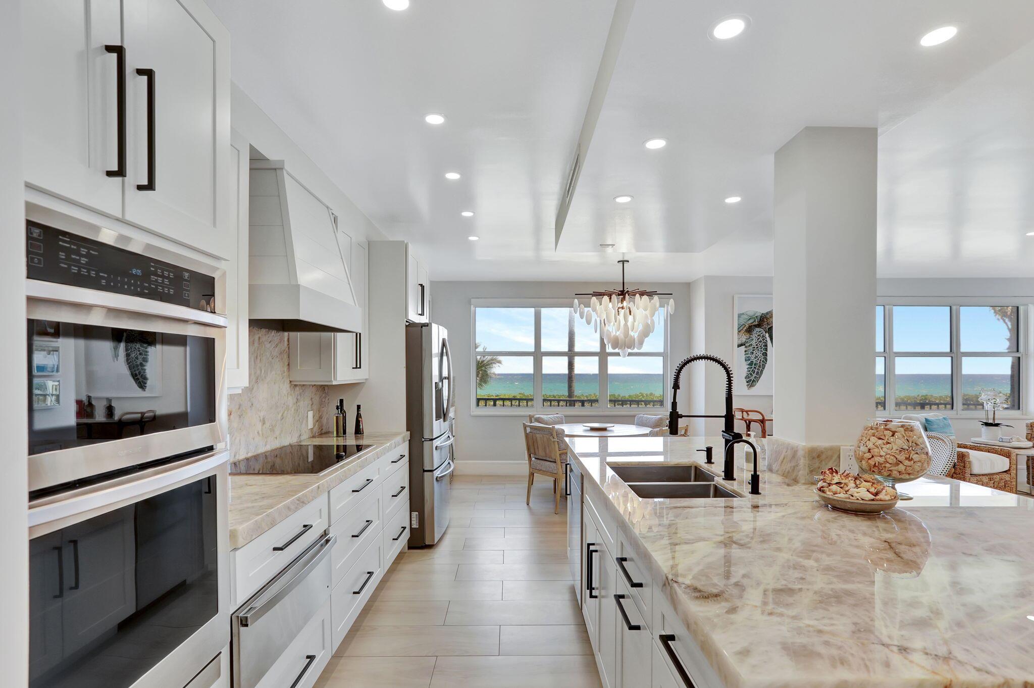 Step into PARADISE, ONE-OF-A-KIND, RARELY AVAILABLE CONDO on the SOUTHEAST CORNER Offering Unparalleled Panoramic Views of the Atlantic Ocean. Breathtaking Sunrises from your Lavish 2/2 Abode. Your Wraparound Patio is a Perfect Haven for Entertaining or Relaxing. Cable, Internet, & Water Included! Luxurious Interior Features include a Chef's Dream Kitchen w/ Custom Wood Cabinetry, Stunning Quartzite Countertops, Large Island, Stainless Steel Appliances, Built-in Microwave, Warming Draw, Instant Hot Water Sink, Wine Cooler & Custom Pantry. This Home Exudes Elegance & Modern Upgrades-Impact Glass, Electric Shades in Living Room, New Plumbing & Electric, Soundproof Wall in Primary, Porcelain Flooring, Freshly Painted, Reflective Raised Ceiling, Water Filtration, W/D, & Stylish Fixtures.