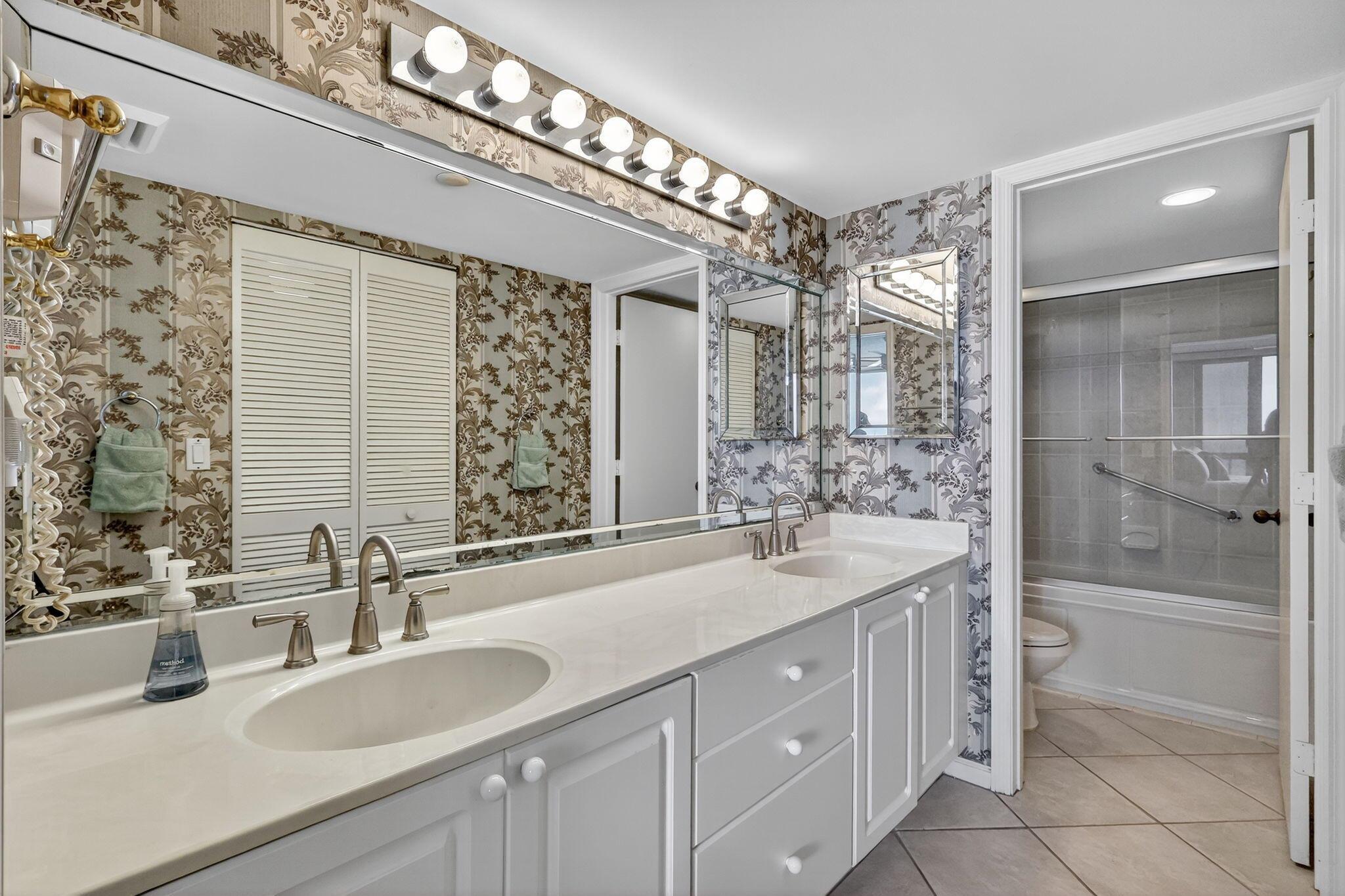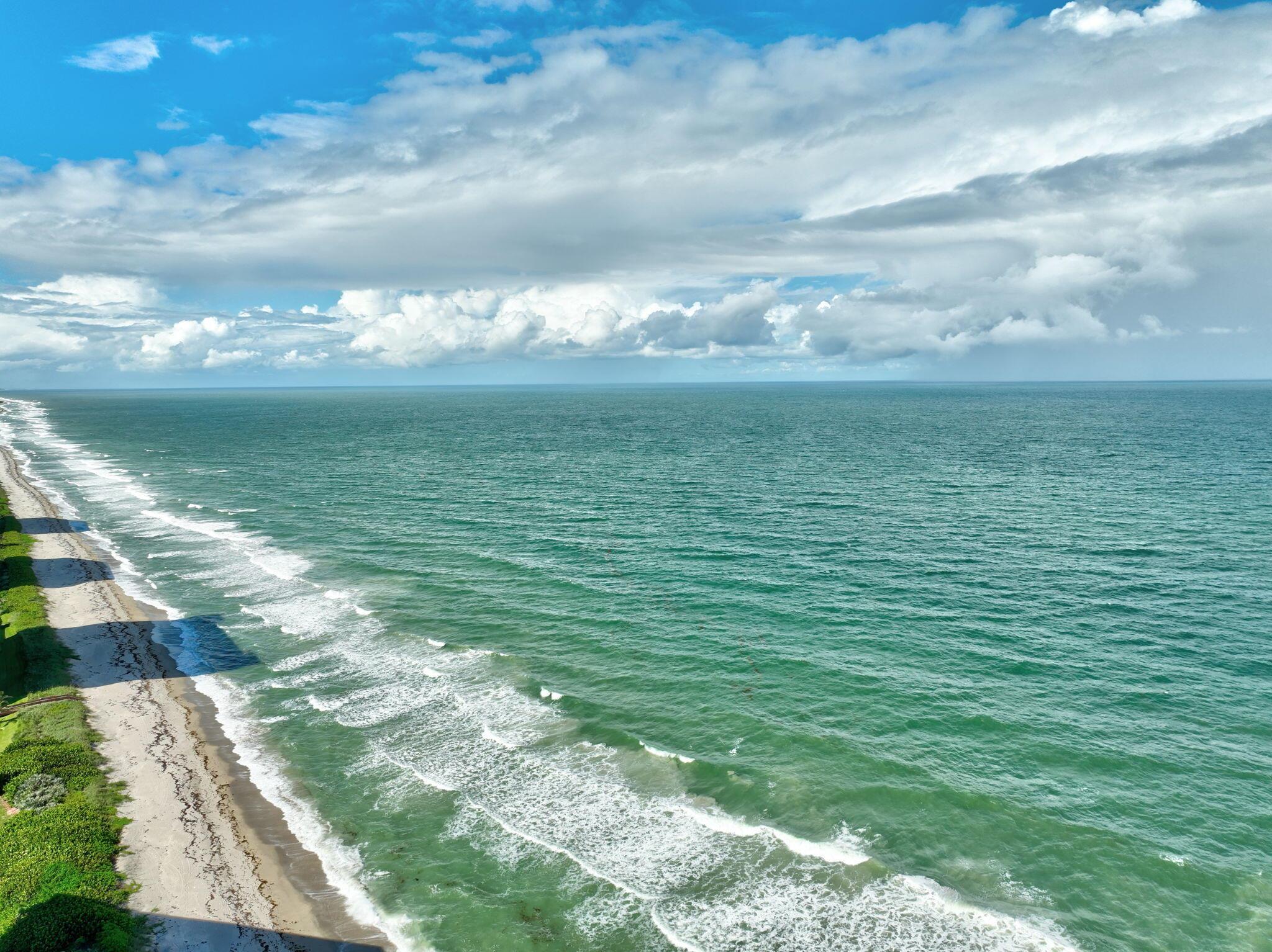 Wake up to sunrise over the blue ocean water at the sought after island Dunes II community. This beautiful spacious 1 bedroom, 2 bath condo has expansive views of the ocean from the bedroom, living room and covered balcony. The bright kitchen boasts a cozy breakfast nook looking out over the intercoastal. All tile floors and crown molding make this unit elegant and clean. Accordion shutters for storm protection on all windows. Island Dunes has direct beach access, 2 heated swimming pools, hot tub, sauna, fitness center, 9-hole golf course, 6 tennis courts and 6 pickleball courts. The lobby & elevators updated and new roof in 2024. Island Dunes has passed its Milestone report and there are no pending special assessments at the time this listing was entered. Large A/C storage. W/D in unit.