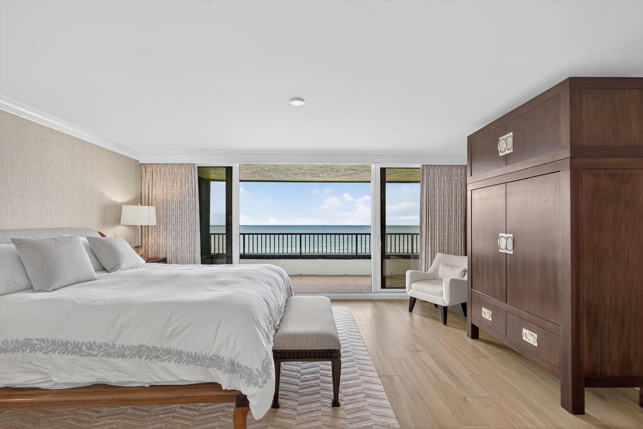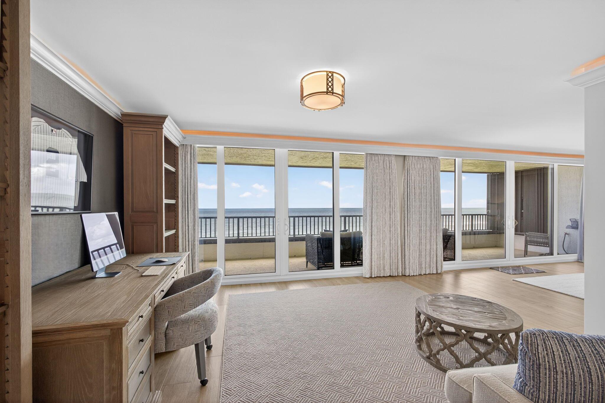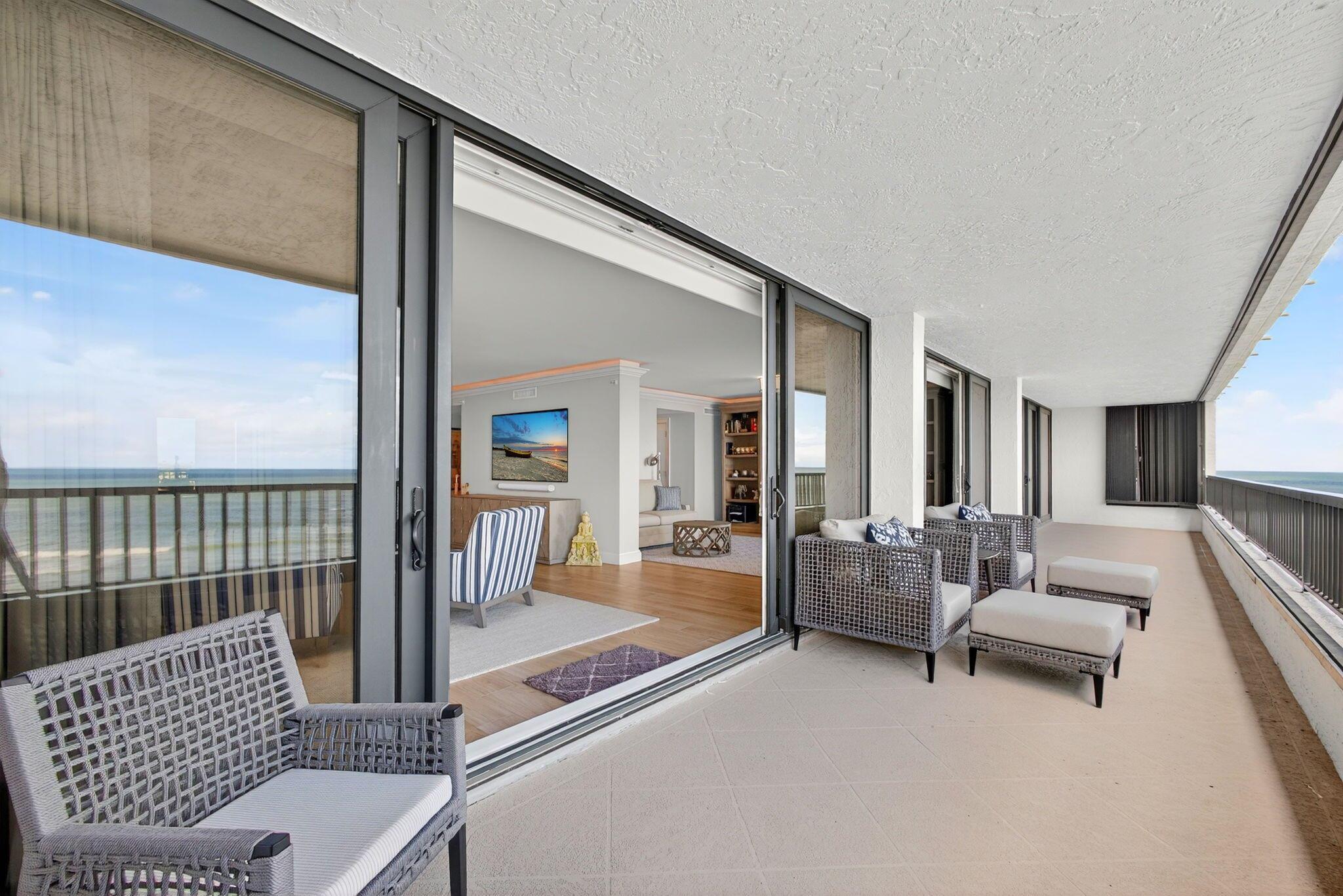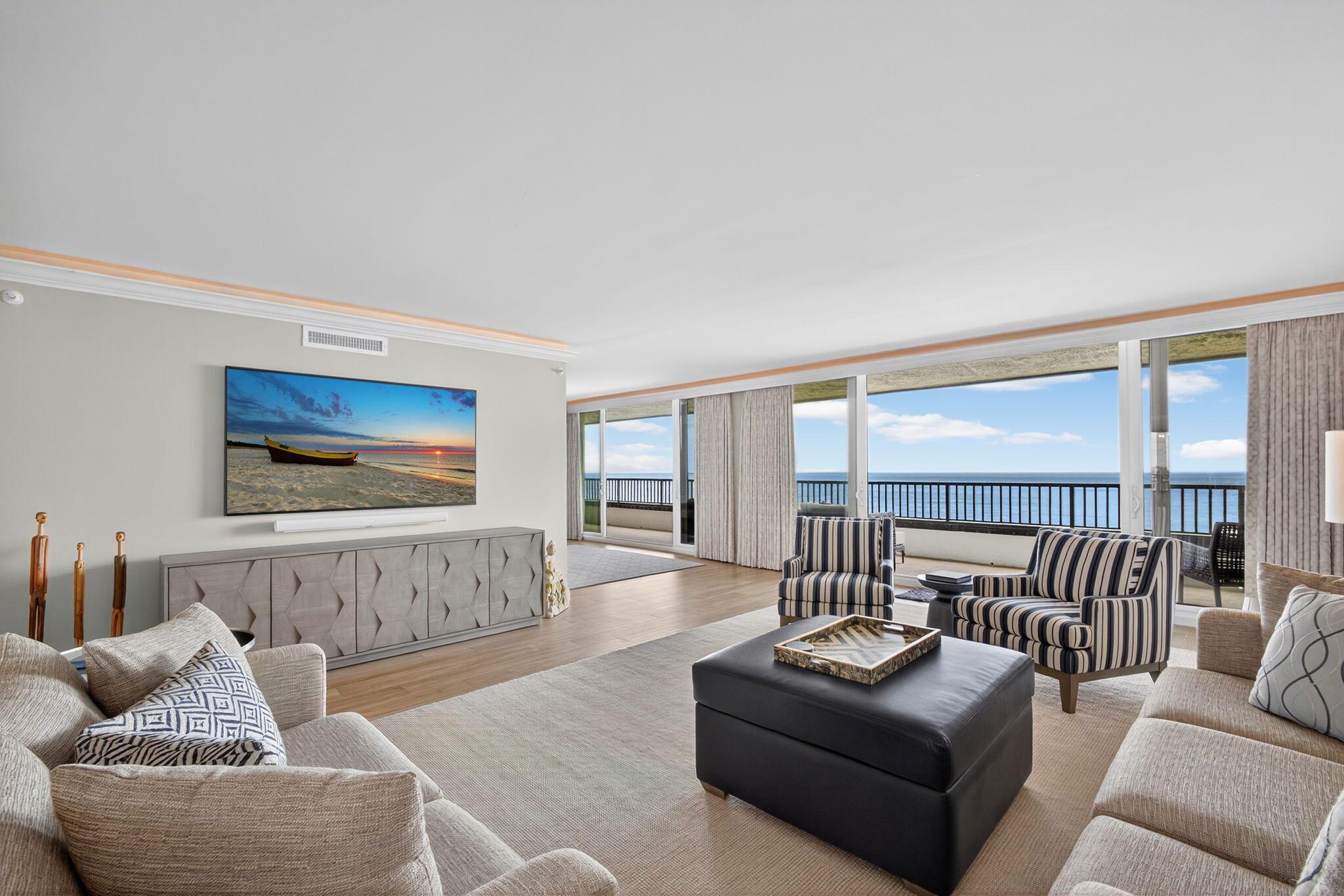 A rare opportunity awaits to own a bespoke residence within one of Jupiter Island's most exclusive enclaves. This fully reimagined 2 bedroom 2 1/2 baths home with a private office offers refined coastal living framed by sweeping views of both the Atlantic Ocean and Intracoastal Waterway. Thoughtfully designed with an open, airy floor plan, this residence exudes understated elegance. Custom finishes and meticulous craftsmanship are showcased throughout, from serene white on white kitchen with quartz countertops to expansive living areas that flow seamlessly to terraces on both sides of the residence. Impact glass, custom window treatments provide comfort and peace of mind. With only 28 residences in the building, privacy and exclusivity are paramount.
