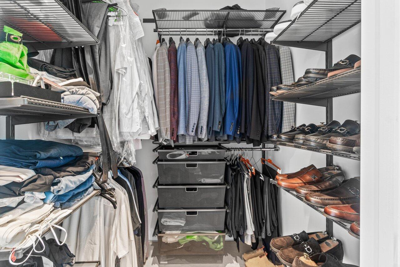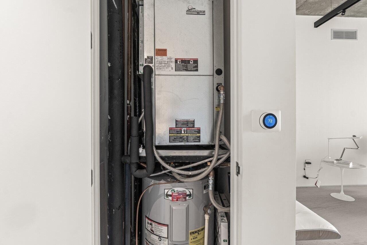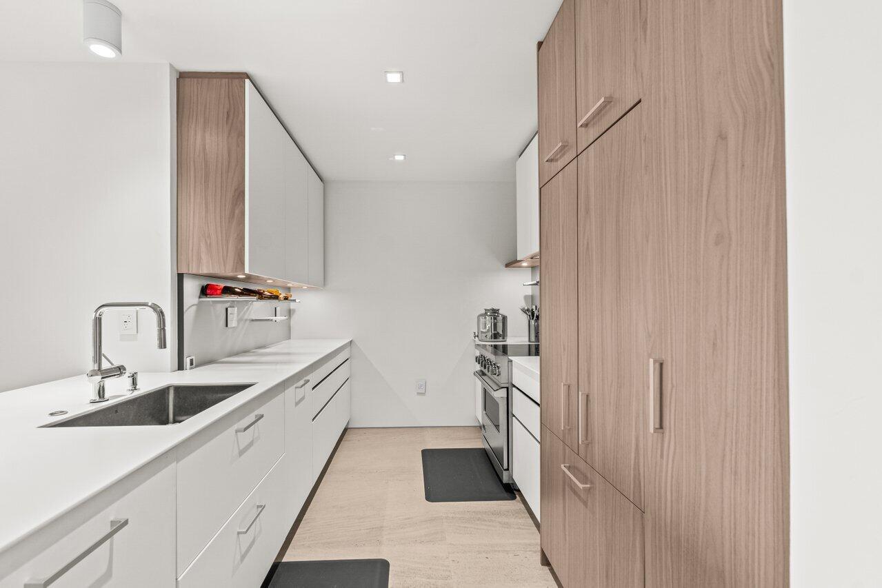 Flawless 2025 renovated 2BR/2BA at The Edge. Condo features mocha limestone honed floors, all new doors and drywall, seamless lighting, and bathrooms with natural stone and frameless glass showers. Both bedrooms have Container Store custom closets. Condo includes reverse osmosis water system, new AC, dehumidifier with pump, and plasma air cleaner. Kitchen boasts Viking stove top, custom-paneled Fisher & Paykel fridge/dishwasher, and Miele washer/dryer. Bonus built-in nook/workstation. Private balcony with city views. Amenities: rooftop pool/clubhouse, fitness & business centers, 24/7 security, lobby, 2 garage spots. Walking distance to downtown restaurants; easy access to PBI, Tri-Rail, and Brightline.