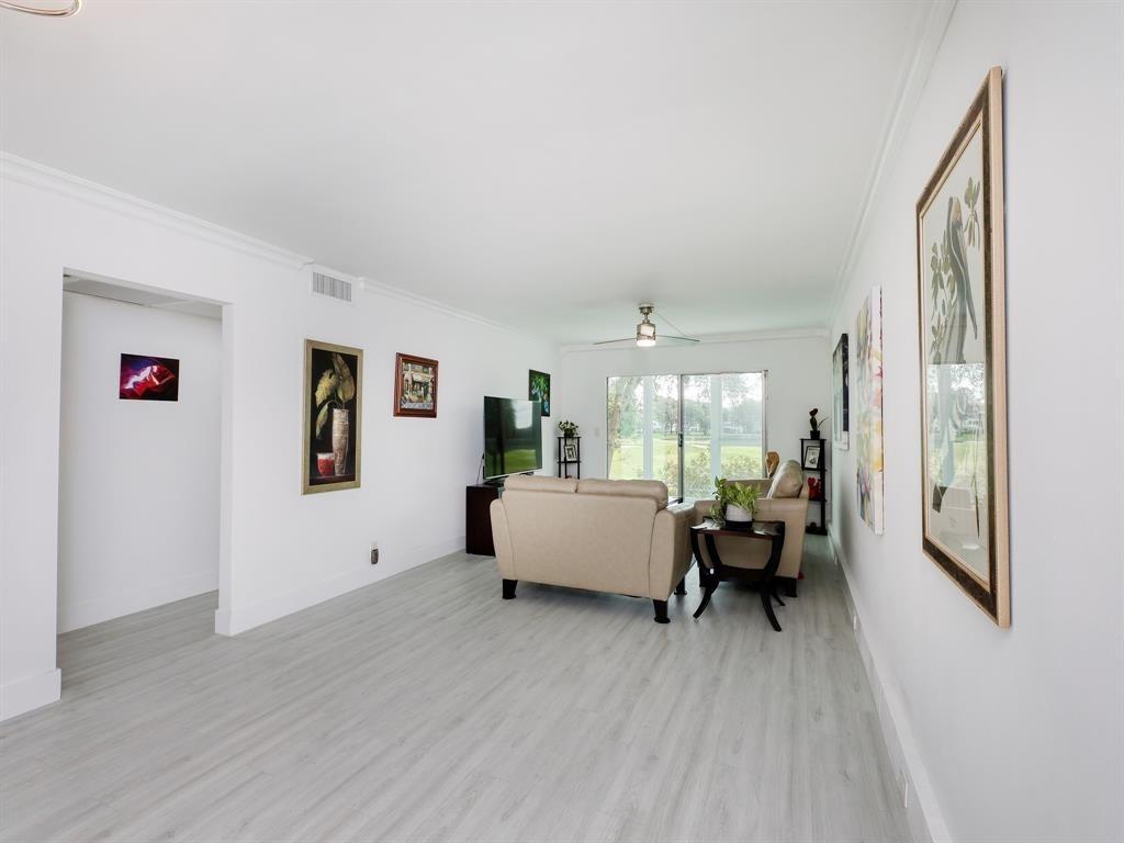 This fully renovated unit has captivating water vistas from its IMPACT glass-enclosed Florida Room, IMPACT WINDOWS & FRONT DOOR. Enjoy the spacious, open floor plan with abundant natural light. Open pass-thru and entryway. Quartz counters with Waterfall edge. SS Appliances, Custom Window Treatments. The bedrooms and bathrooms have been tastefully updated CUSTOM CLOSETS & DOORS. The master bathroom entry moved with barn doors. All SMOOTH CEILINGS with four ceiling fans. SHOWERS IN BOTH BATHROOMS (NO TUB), and the kitchen is a chef's dream. Master bedroom King-size bed. Large flat-screen TV in the living room. Enjoy the peaceful, serene Panoramic water views from the Golf Course Great location & very quiet. Condo is completely furnished and is Turnkey 55+Good income and credit required