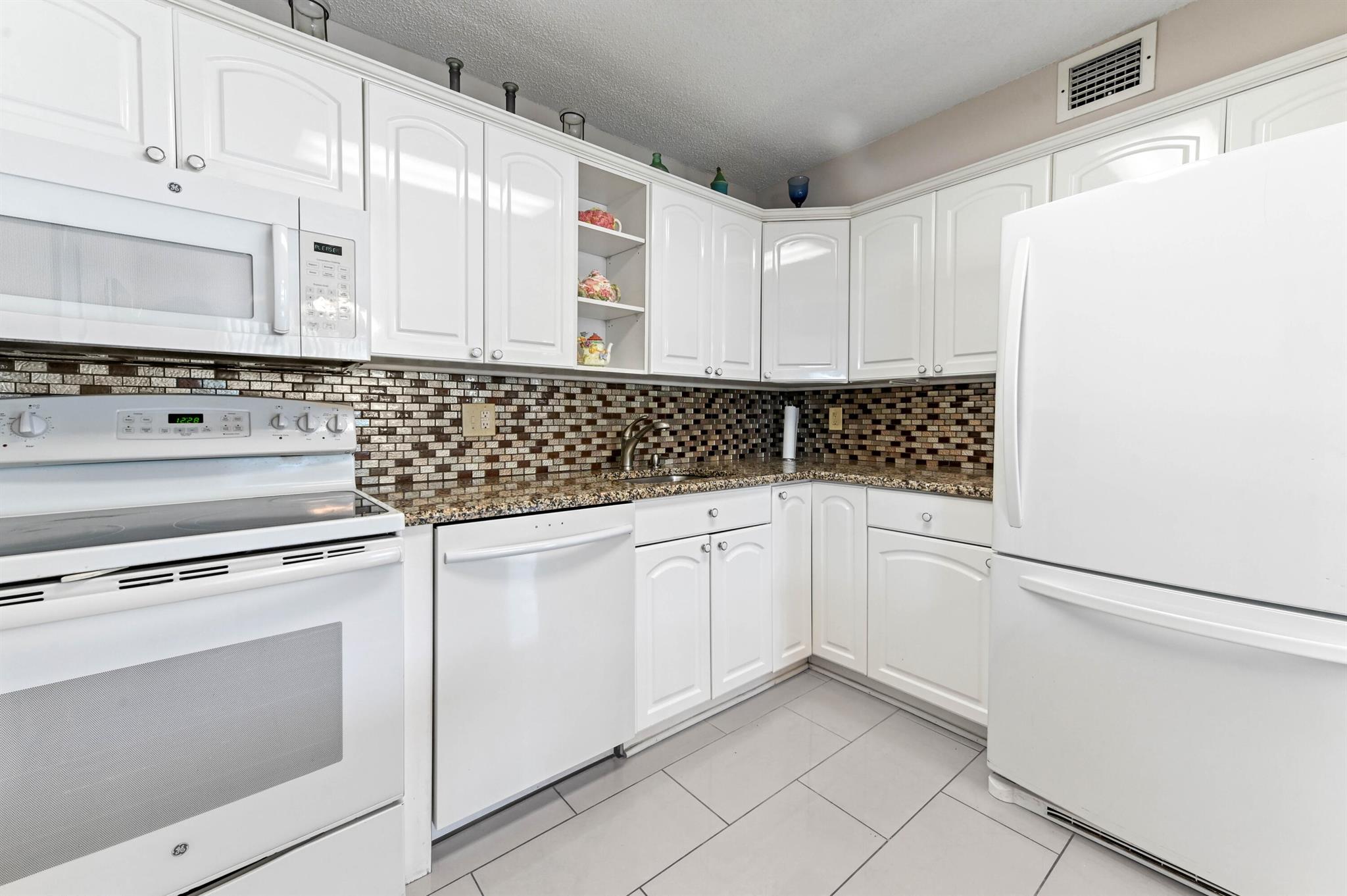 Newly painted, NEW AC unit, and NEW hot water heater installed 05/2025! Welcome to your perfect lakeside retreat in this meticulously maintained 55+ community! This move-in-ready, first-floor condo offers a seamless, comfortable lifestyle with serene water views. The spacious 2-bedroom, 2-bathroom unit features elegant tiled flooring throughout, ensuring a clean and modern feel. The kitchen has been nicely updated with a stylish tiled backsplash, granite countertops, and a flat-top stove. Peace of mind comes standard with hurricane roll-down shutters protecting the back patio, windows are all vinyl replacements and the convenience of a nicely furnished interior makes this an ideal snowbird escape or year-round residence.