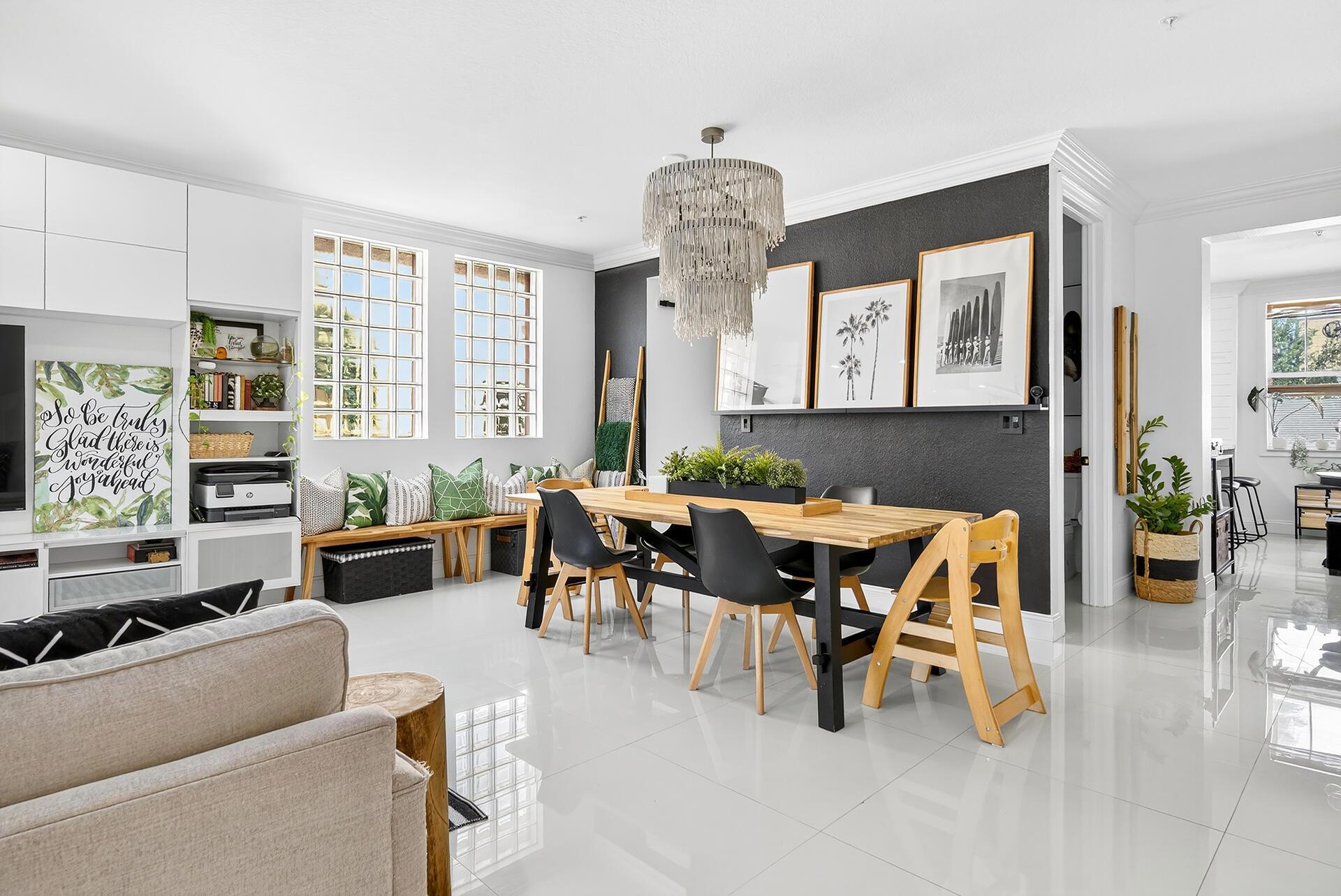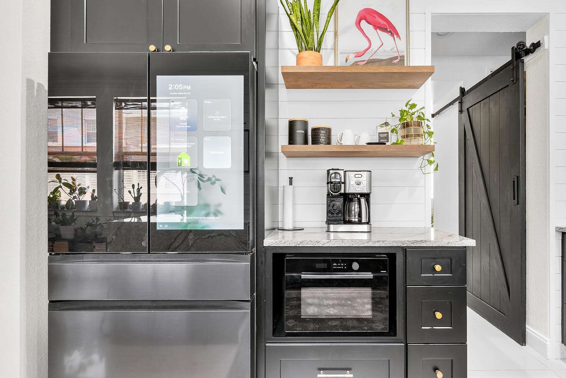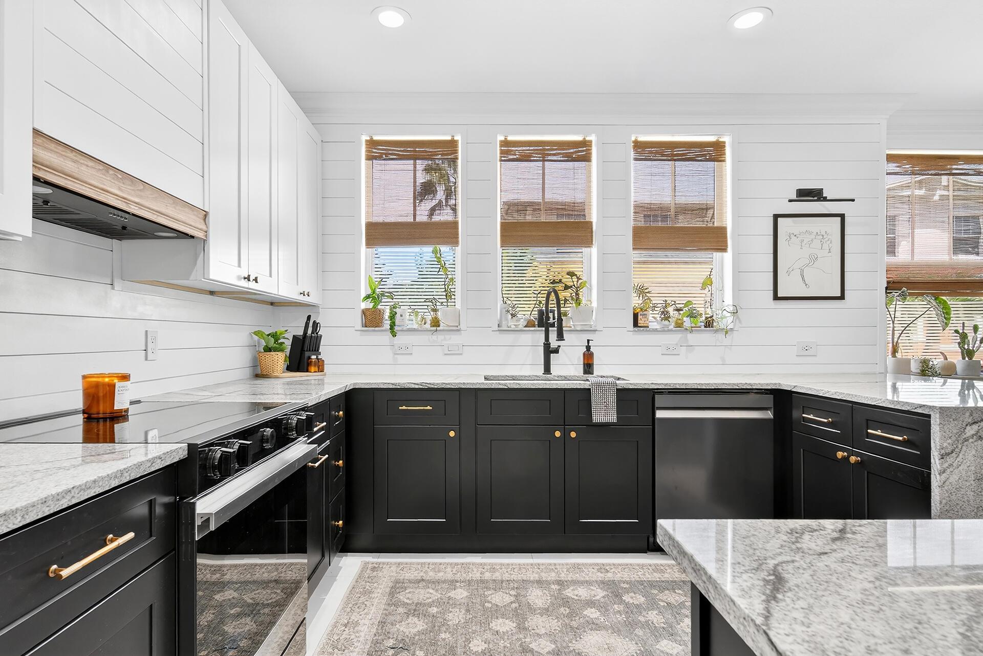 Stunning! Thoughtfully upgraded 4 bed 3.5 bath corner unit offers bright, open living with soaring 10' ceilings & tons of natural light. Features 32'' white tile & wood floors, crown molding, accent wall entry, modern fans, HUE lights, Nest thermo, etc. BRAND NEW kitchen is a showstopper, boasting granite waterfall edge with bar seating, slow-close cabinetry with 42'' uppers, open shelves, shiplap siding, black work station sink, & spacious pantry with a sliding barn door. Outfitted with top of the line Samsung Bespoke appliances, including a Family Hub touchscreen refrigerator & 3-drawer wine/beverage cooler, this kitchen is both stunning & smart. All bathrooms have been beautifully updated with new floors, counters, sinks, toilets, lighting & fixtures. New Bespoke W/D. 2 car garage.