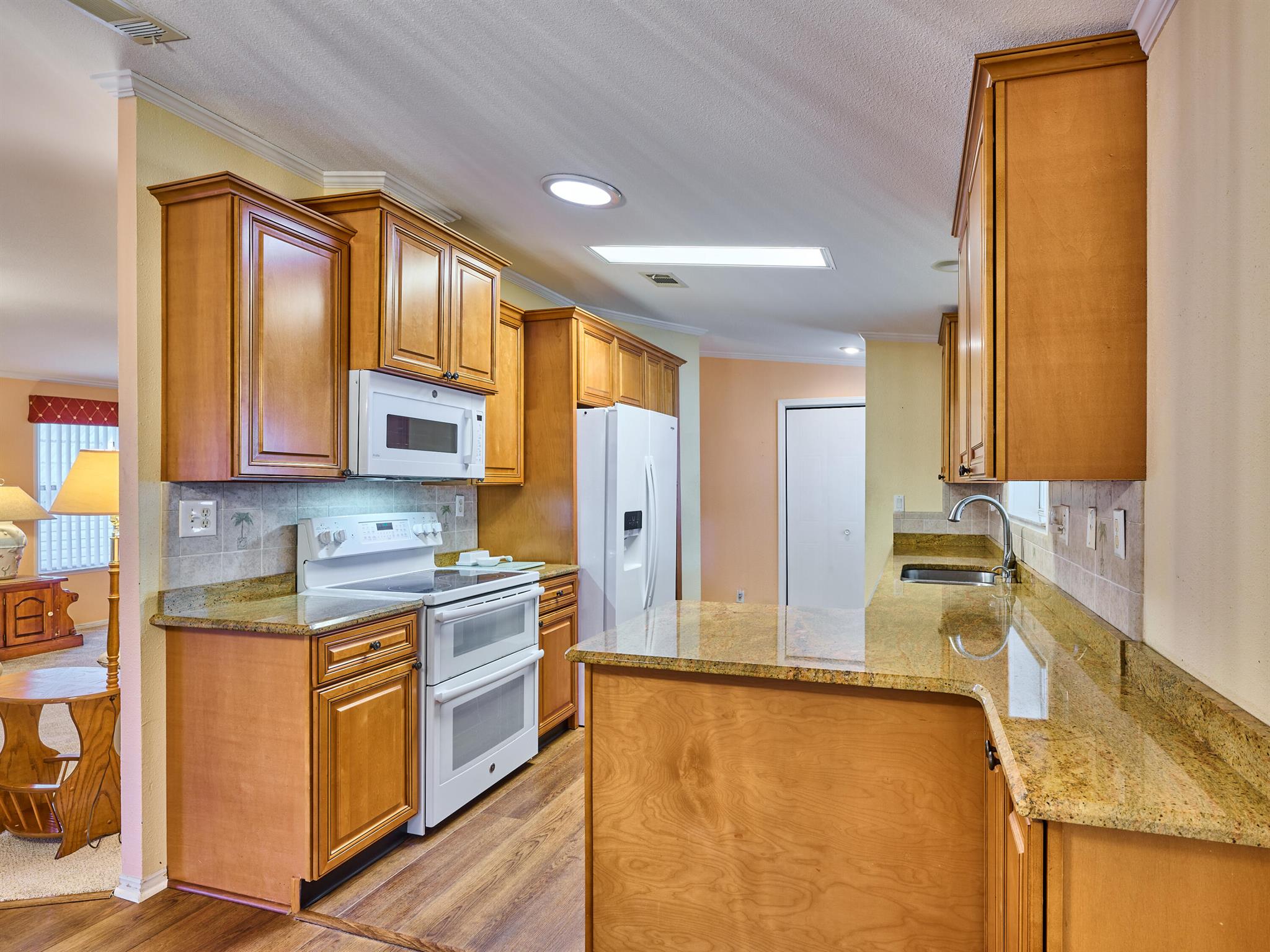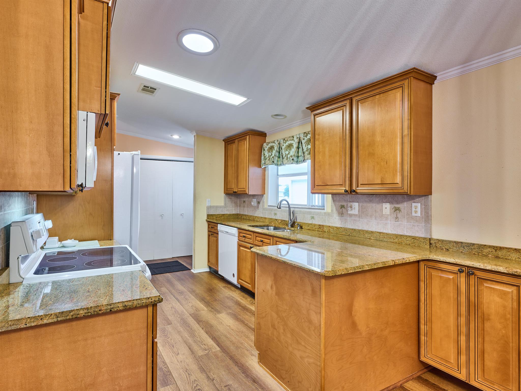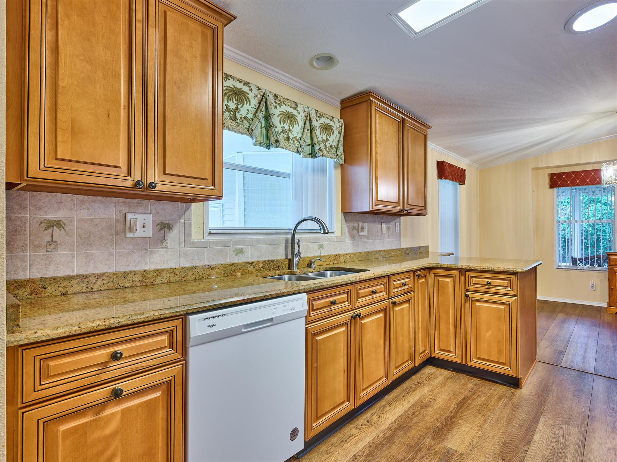 Welcome to this beautifully maintained 3 bedroom 2 bath Palm Harbor manufactured home in the sought-after 55+ community of Pinelake Gardens & Estates. This spacious residence blends modern updates with comfort and convenience.Featuring a new 2024 metal roof and a 2023 A/C system, the major updates are already done for you. Inside, the kitchen has been tastefully renovated with rich wood cabinetry, sleek granite countertops, and newer white appliances--perfect for cooking and entertaining. The adjoining dining area boasts new flooring, while the living room has fresh carpet, creating a warm and inviting atmosphere. Pinelake Gardens & Estates is a vibrant, active community offering resort-style amenities, including two clubhouses, pools, tennis, shuffleboard, and a social