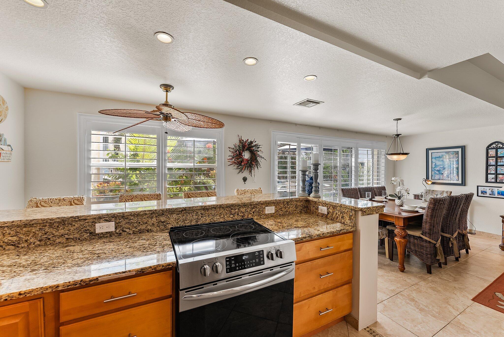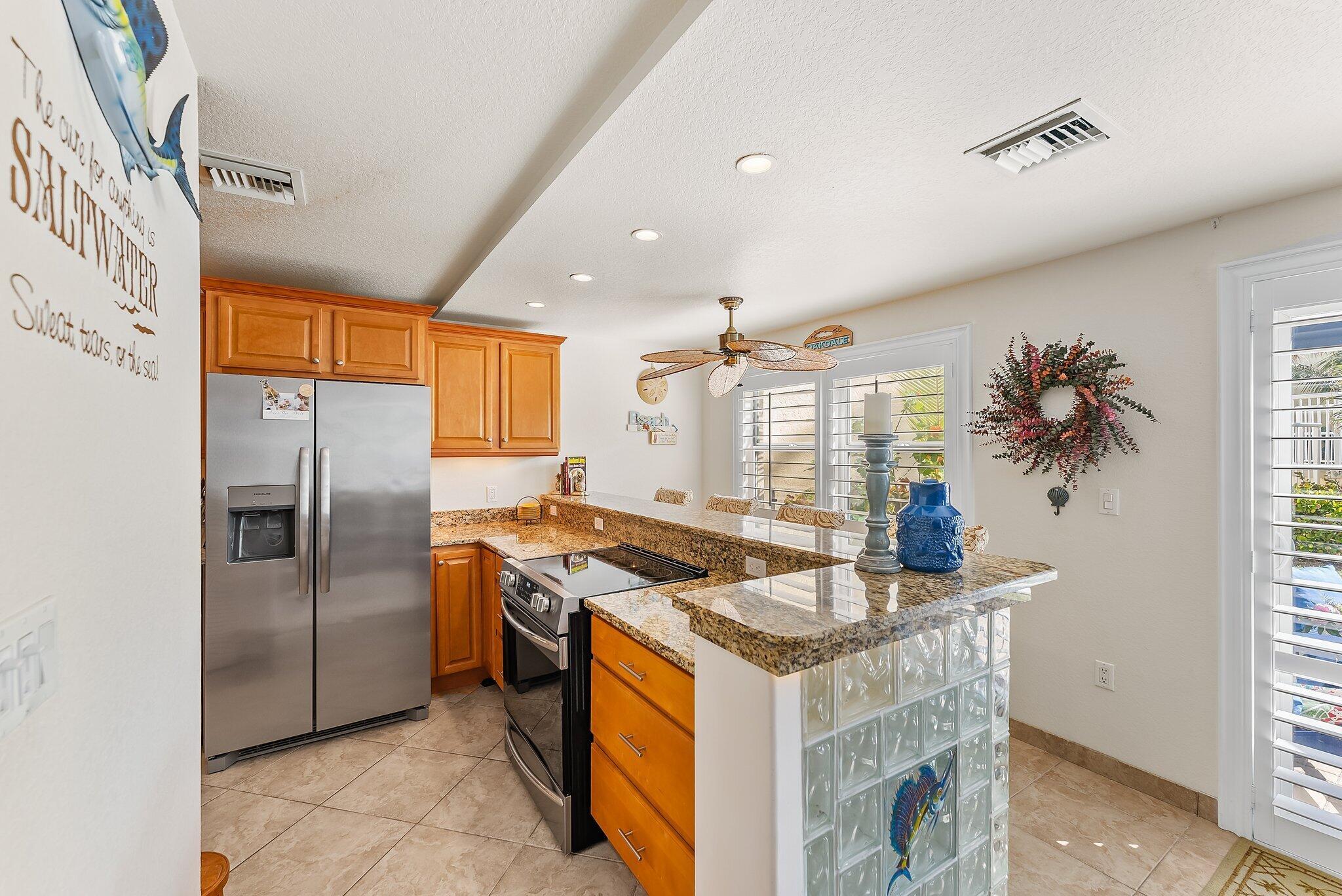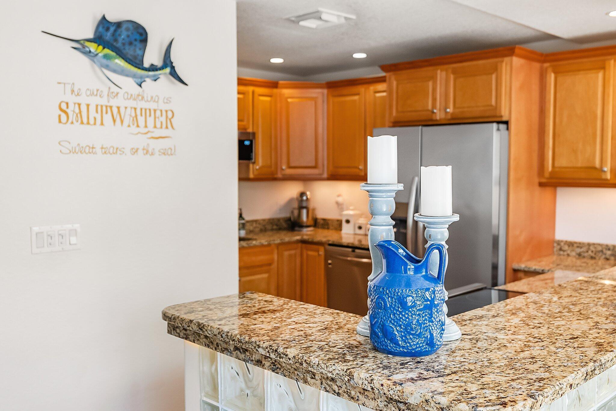 Stunning 2BR/2BA condo in the desirable oceanfront community of Seaside on Hutchinson Island! Enjoy private beach access, heated pool, and sundeck in a resort-style setting. Shows like a model home, it is impeccably updated with hurricane impact windows, plantation shutters, tile flooring, renovated baths, upgraded granite kitchen, new S/S appliances, custom lighting, stackable W/D, new water heater, and updated A/C. Spacious living and dining areas open to a sunny breakfast room and huge breakfast bar. Owner's suite offers a wall of closets and private bath; guest suite includes a full bath. Relax on the expansive brick paver patio overlooking the pool and garden. Concrete restoration completed 2022.