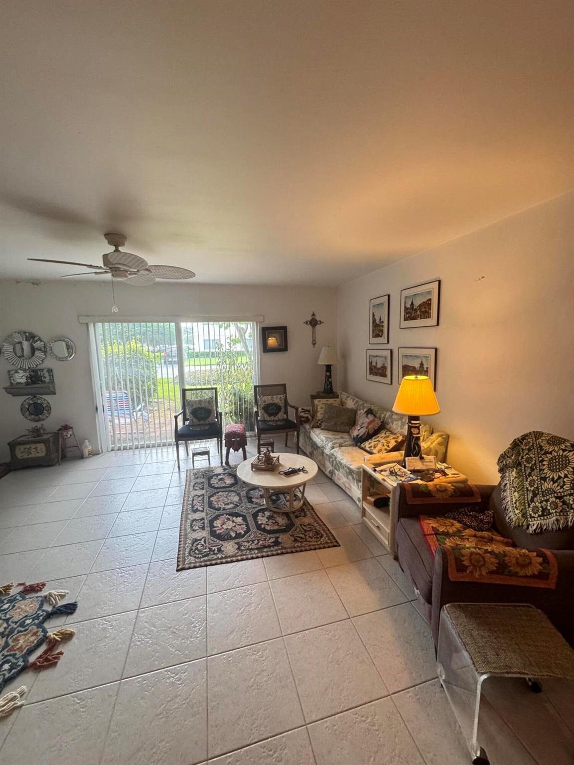 First-floor condo featuring till flooring throughout. Some kitchen and bathroom updates. Expanded walk in closet, impact windows, and newer A/C (2024). Enclosed Patio makes a great flex space. Currently used as guest space. Exterior front and rear outdoor patio spaces. Conveniently located in an east Boynton Beach location, close to the beach, dining, and shopping. Priced for a quick sale, this home provides great value for the area. Dues include water, trash, building insurance, cable, and internet.