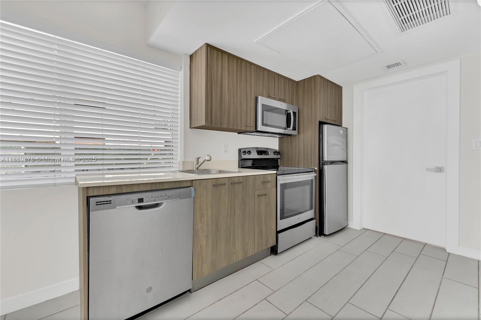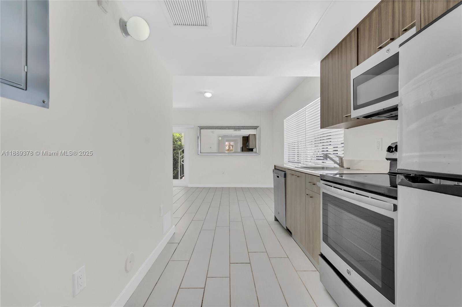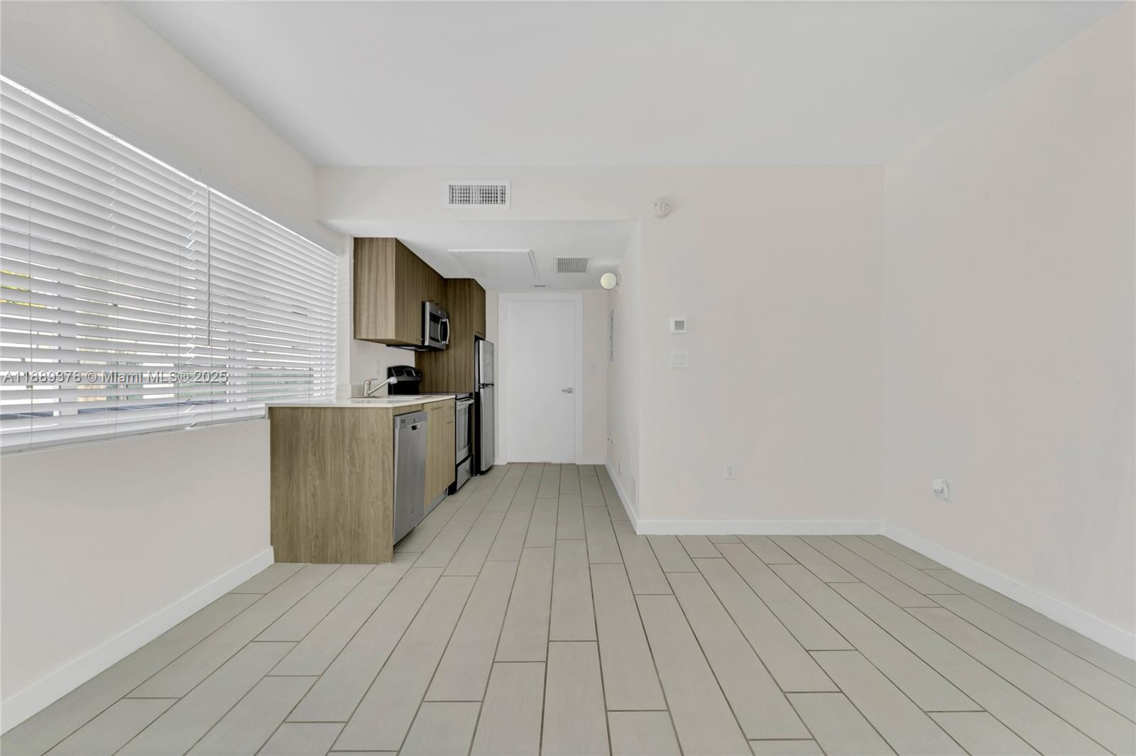 Beautifully renovated 1BR / 1BA corner unit on the ground floor. This apartment features sleek tile flooring, impact-resistant doors and windows. Enjoy a modern Italian-style kitchen with stainless steel appliances, updated plumbing and electrical, and a contemporary bathroom with stylish fixtures. The unit also includes central A/C, in- unit washer and dryer, and convenient street parking. Easy to show!