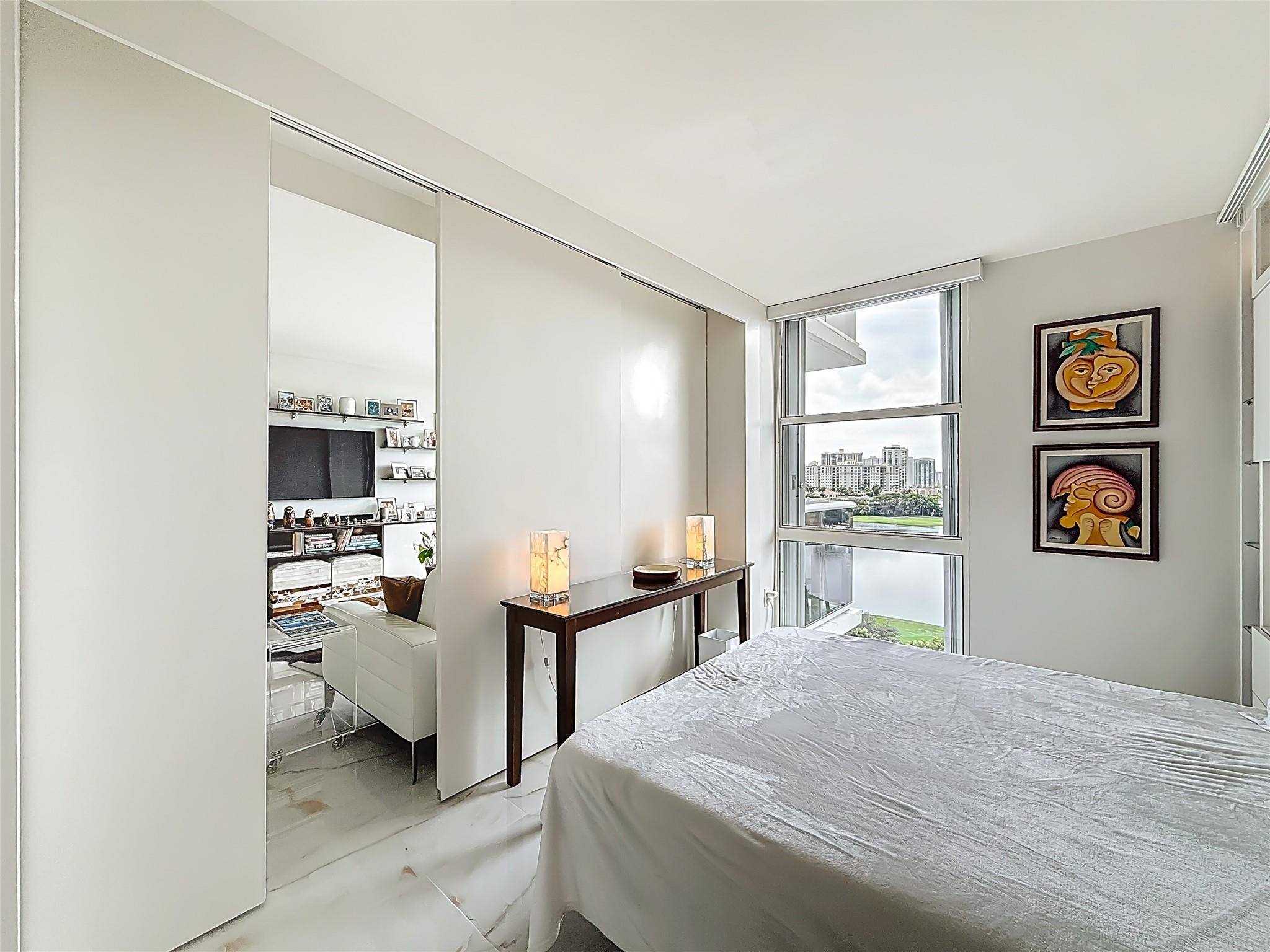 Architect’s residence with turnkey fully furnished option. 180-degree views of sunrises over the ocean, majestic sunsets, shimmering moonrises & serene lake reflections. Innovative living area seamlessly integrates the LR, DR & 2nd BR for open concept, but can be portioned into an office/bedroom w/ a panel pocket wall system. Artfully concealed Murphy bed creates a BR w/ closet & en-suite bathroom. Interior features: 3D accent walls, exquisite mother of pearl tile, custom kitchen, bar w/ built-in cabinets, entertainment center w/ floating shelves, motorized blackout shades, WIC, lots of storage, hurricane shutters & deeded parking (2nd available). Location is on the Soffer nature trail & Turnberry lakes…Walk to Aventura mall, restaurants, houses of worship, dog park, horse track
