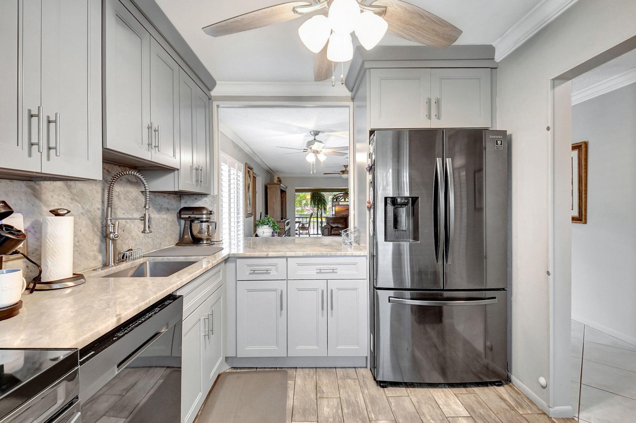 This beautiful 2nd floor corner unit in Fairways Green, Boca Raton, is in a secure 55+ community with 24-hour manned gate access. It features 3 bedrooms and 2 bathrooms in a split floor plan, with impact windows throughout. The open living room, dining room, kitchen and patio offer peaceful lake views.The unit features several recent updates, including new 14-inch attic insulation to keep it cool during Florida's hot summers. It also boasts a brand-new electric box, AC system, and hot water heater. Inside, you'll find crown molding, baseboards, new closet doors, and a wet bar with a wine fridge, top and bottom wine racks, and a bar sink.