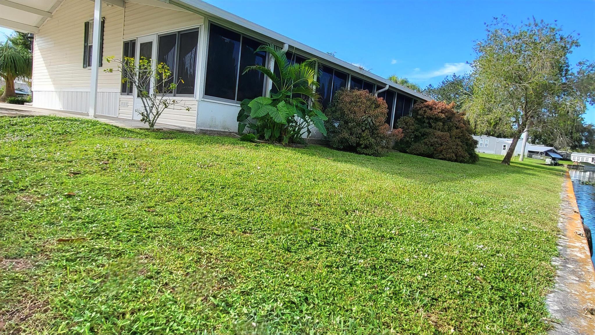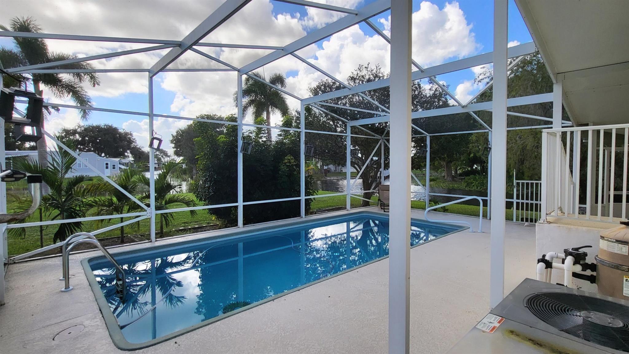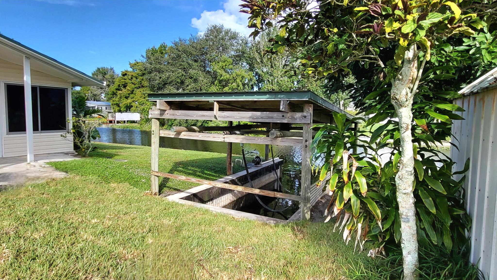 WATERFRONT POOL HOME sprawling over .26 acres situated on a cul-de-sac and converging canals. Relax or exercise in the lavishly inviting 12x24 sparkling pool with non-skid, cool-coated surface under a fully enclosed patio with bona fide privacy. Any boat will appreciate being on the electric lift shaded under the boat slip, before a day of leisure or fishing on Lake Okeechobee. Rest-assure the impressive 220 ft of strong seawall will last a lifetime. Pull a camper right up the 2nd driveway for full RV hook-up (2nd septic system). Zoned irrigation will keep landscaping and green & lush. Take in the calming view of the waterfront from the 12x45 Florida Room (mini-split AC). Appreciate the ample soft-close kitchen cabinets, granite countertops and updated baths. Roof 2018. Avocado trees too!