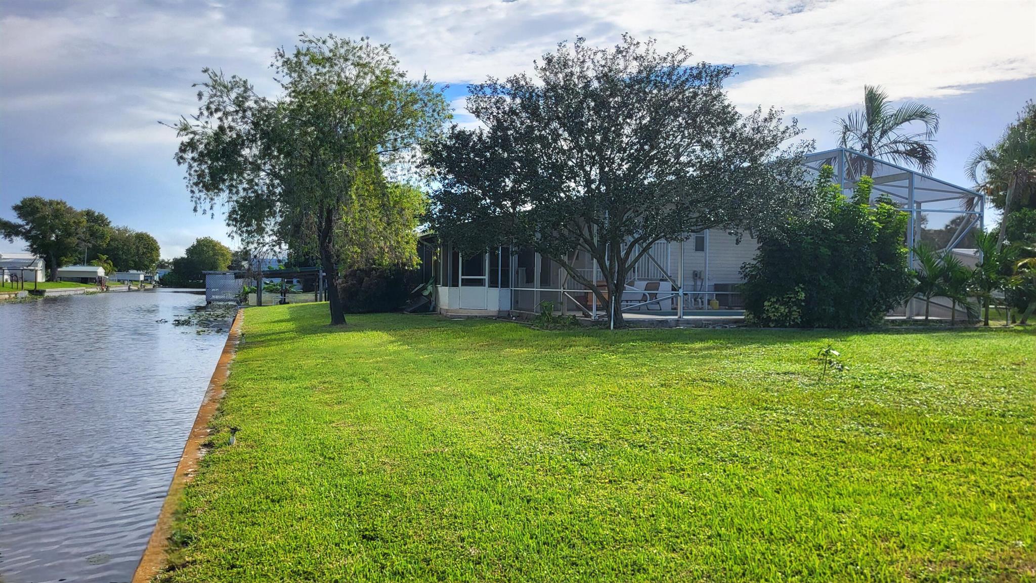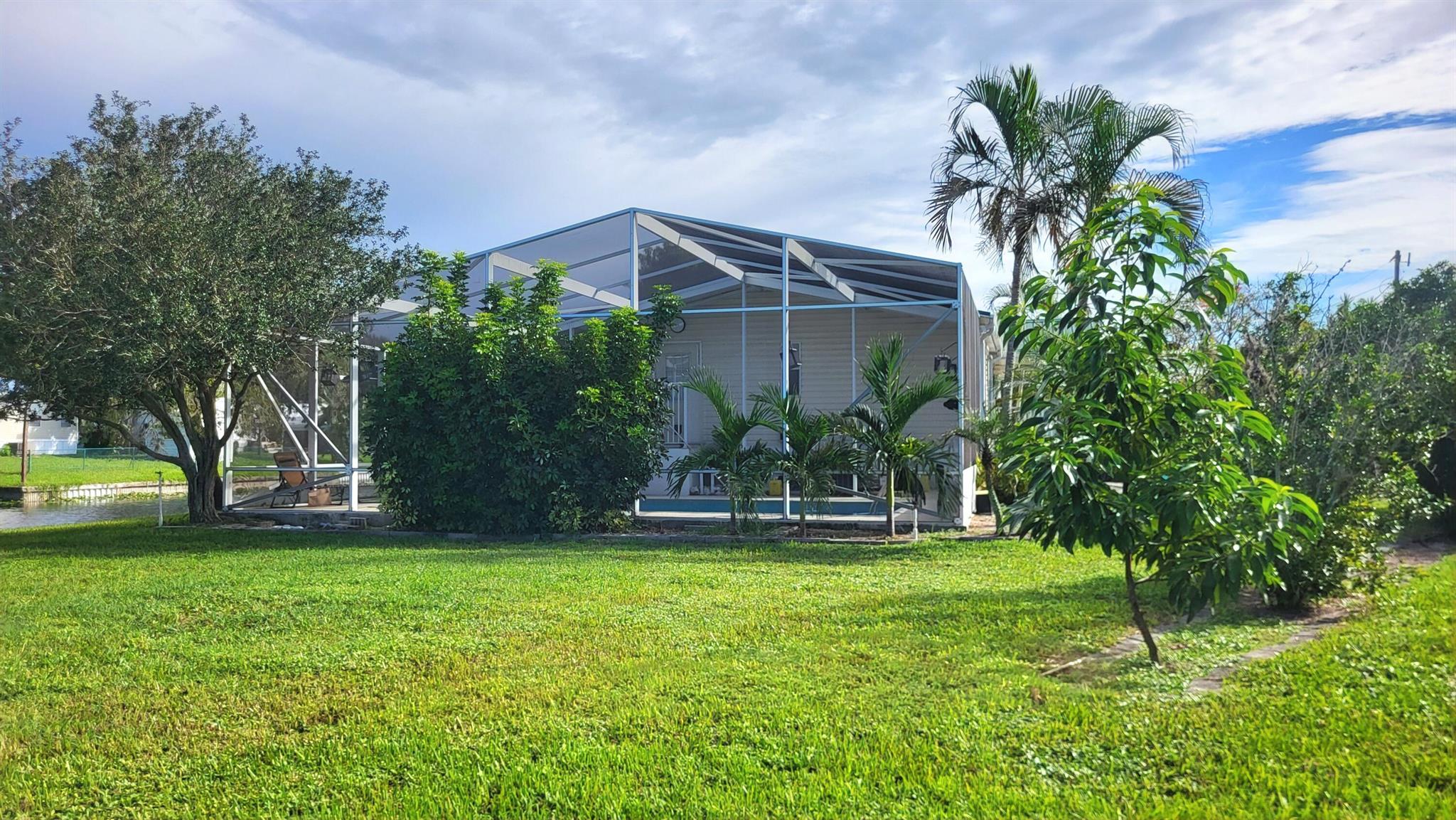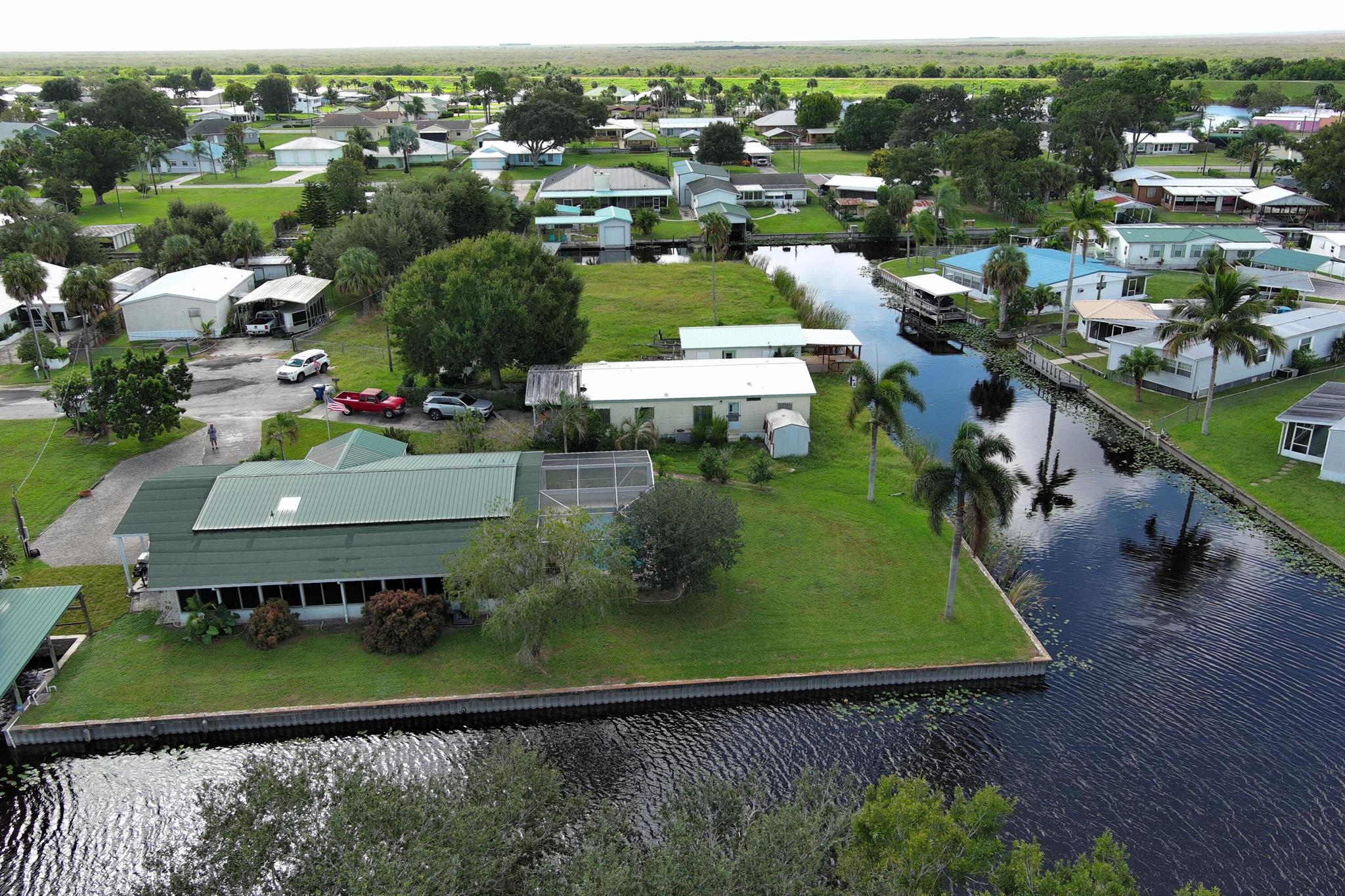 WATERFRONT POOL HOME sprawling over .26 acres situated on a cul-de-sac and converging canals. Relax or exercise in the lavishly inviting 12x24 sparkling pool with non-skid, cool-coated surface under a fully enclosed patio with bona fide privacy. Any boat will appreciate being on the electric lift shaded under the boat slip, before a day of leisure or fishing on Lake Okeechobee. Rest-assure the impressive 220 ft of strong seawall will last a lifetime. Pull a camper right up the 2nd driveway for full RV hook-up (2nd septic system). Zoned irrigation will keep landscaping and green & lush. Take in the calming view of the waterfront from the 12x45 Florida Room (mini-split AC). Appreciate the ample soft-close kitchen cabinets, granite countertops and updated baths. Roof 2018. Avocado trees too!
