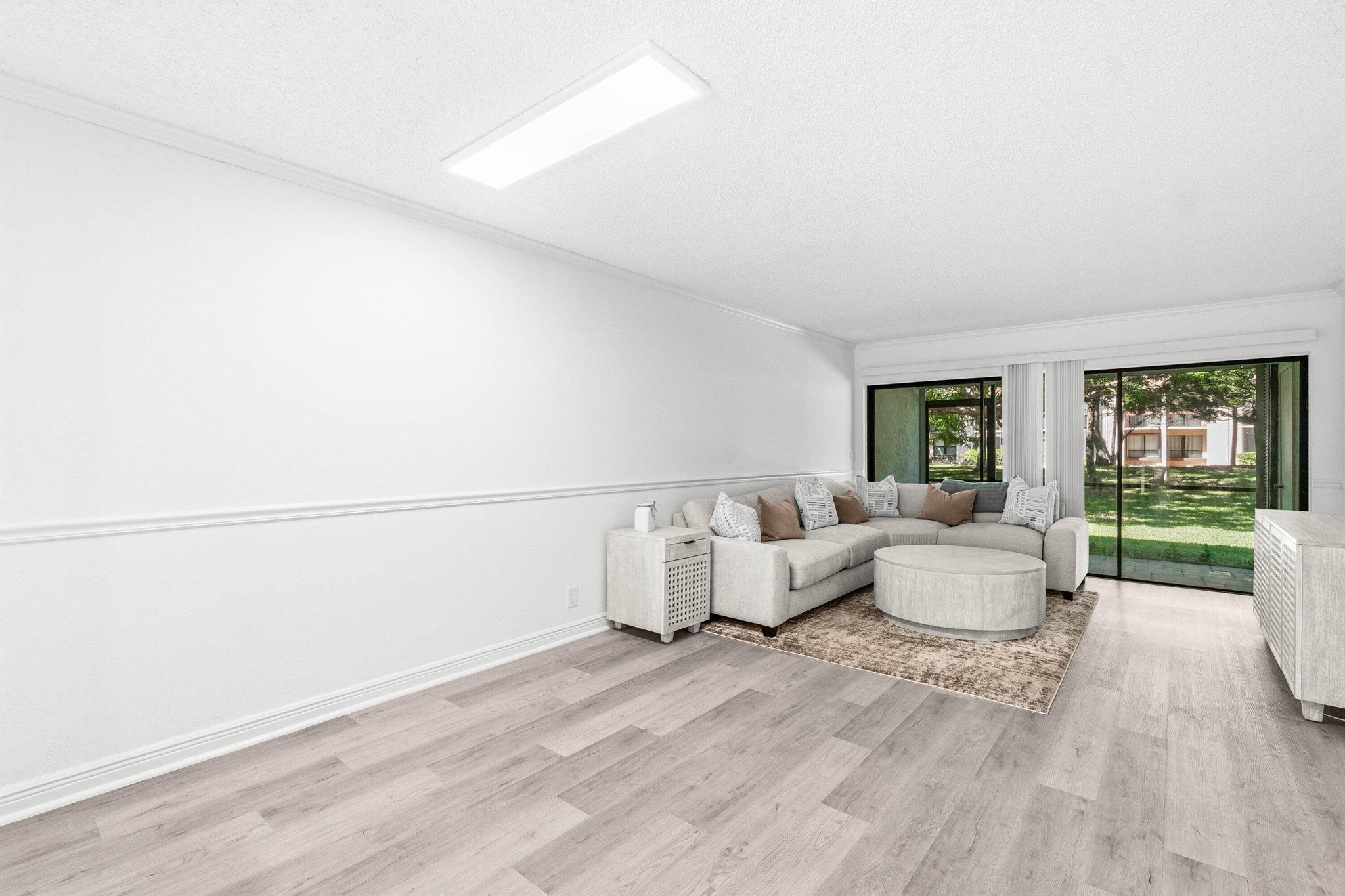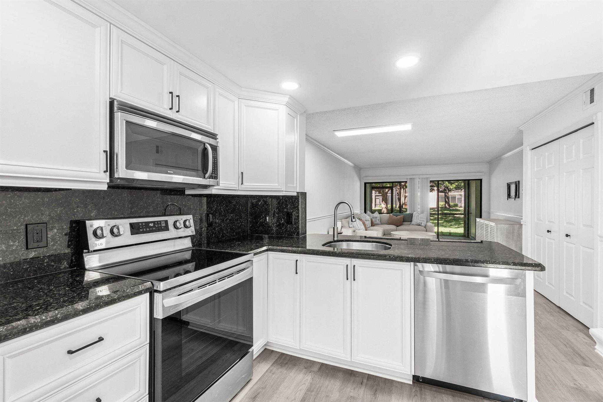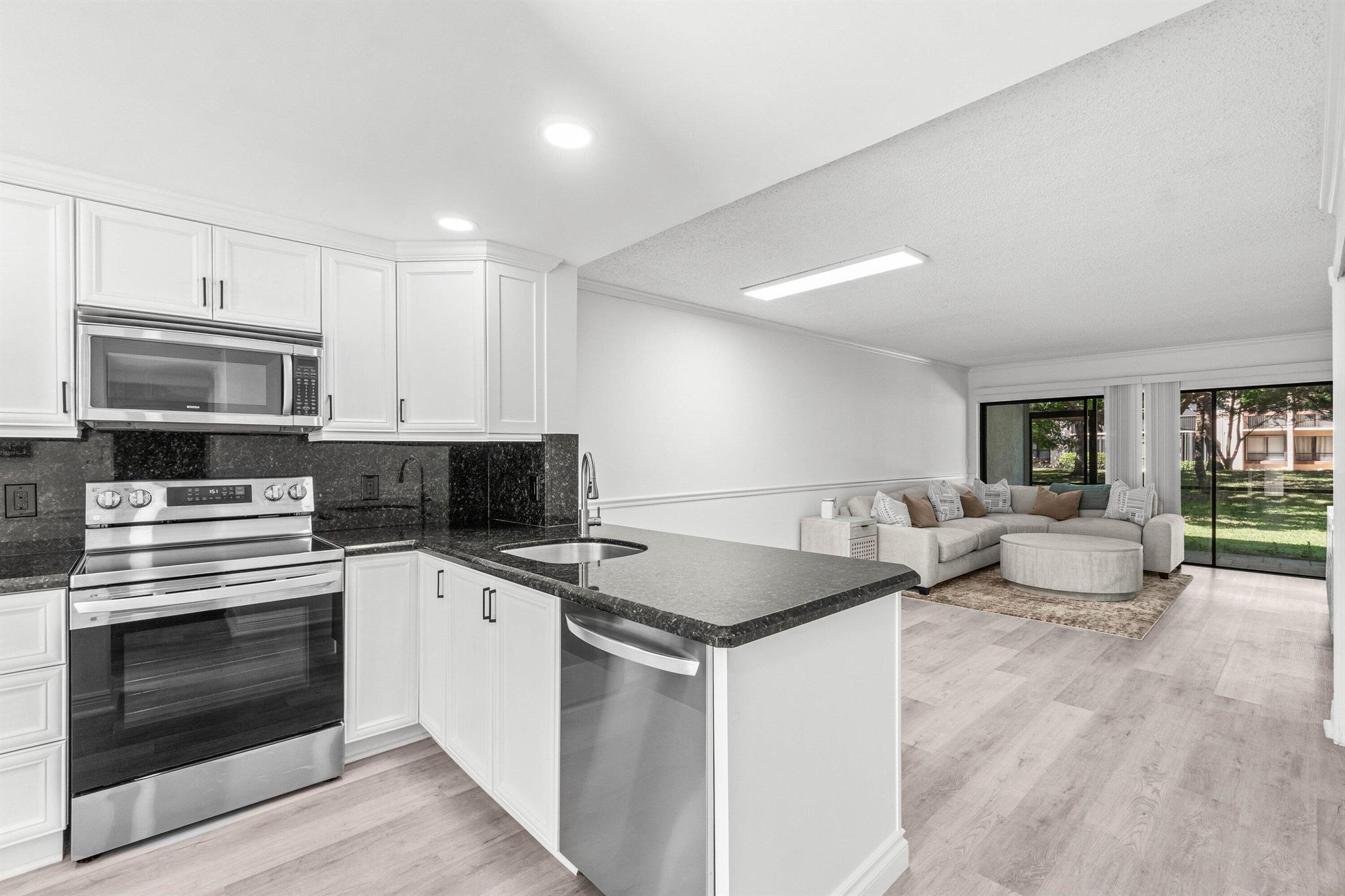Stunning First-Floor Renovation in Meadowridge Deerfield Beach! Fall in love with this tastefully remodeled and furnished 2 bedroom 2 bath unit. New Roof 2023! Beautifully updated with modern finishes throughout. Open floor plan connects the living & dining areas effortlessly; large windows capture serene garden views. Kitchen features white shaker cabinets, granite countertops, and brand new stainless steel appliances. The split bedroom layout offers privacy, with both bathrooms fully updated to perfection, each showcasing glass shower doors, striking mosaic tile accents, and sleek vanities with quartz countertops. Additional highlights include luxury vinyl tile flooring throughout, built-out closets, and new in-unit laundry area, large patio, AC 2022 and WH 202