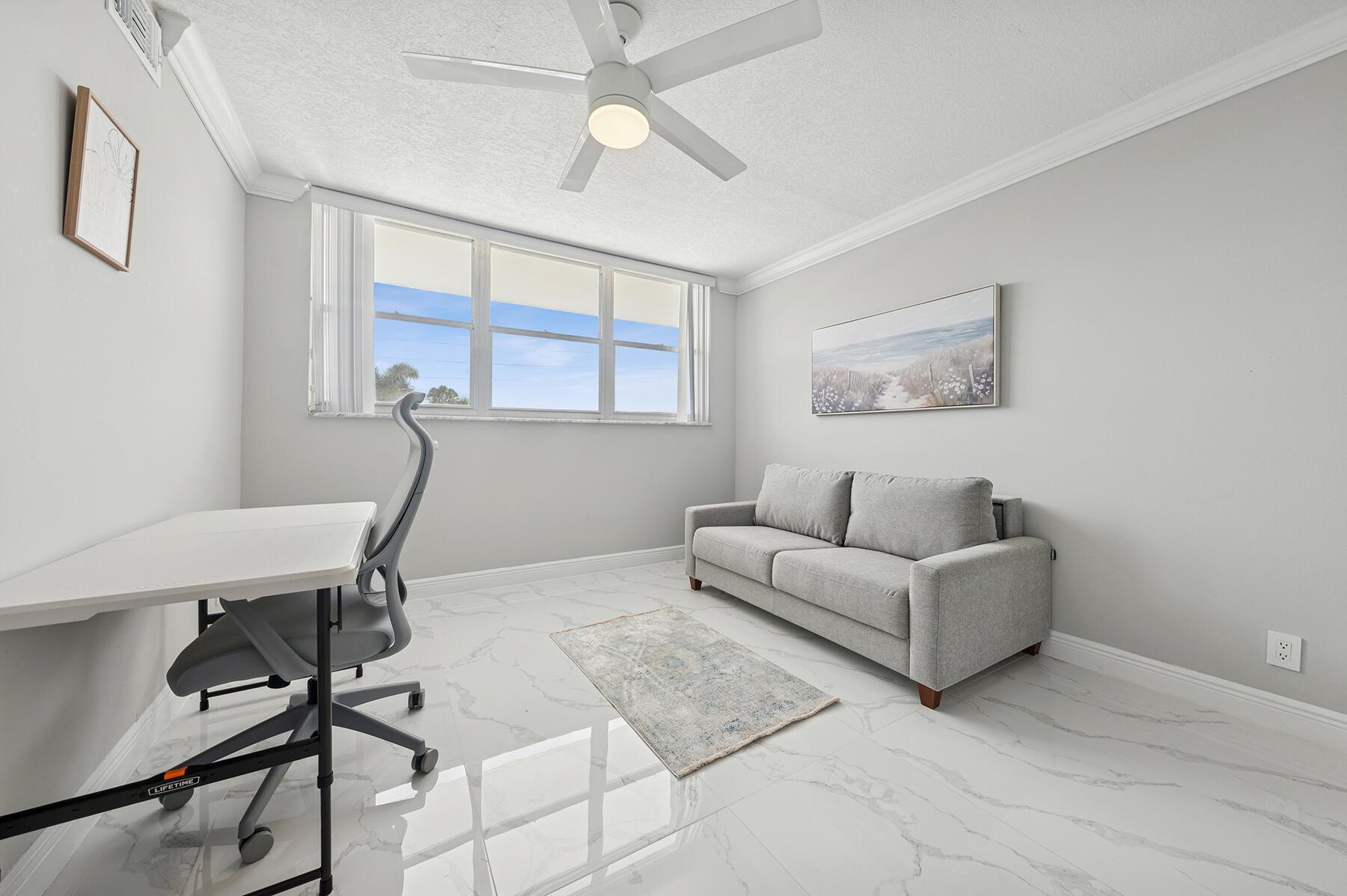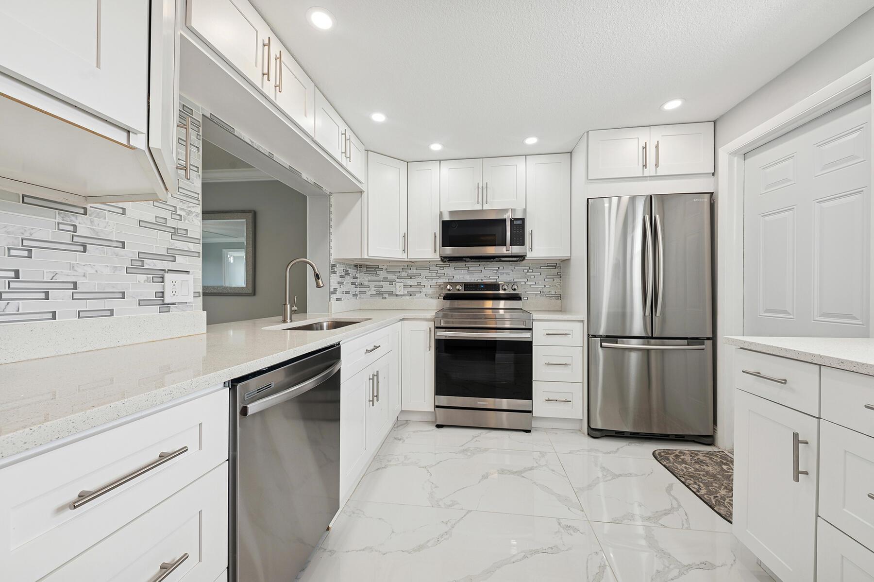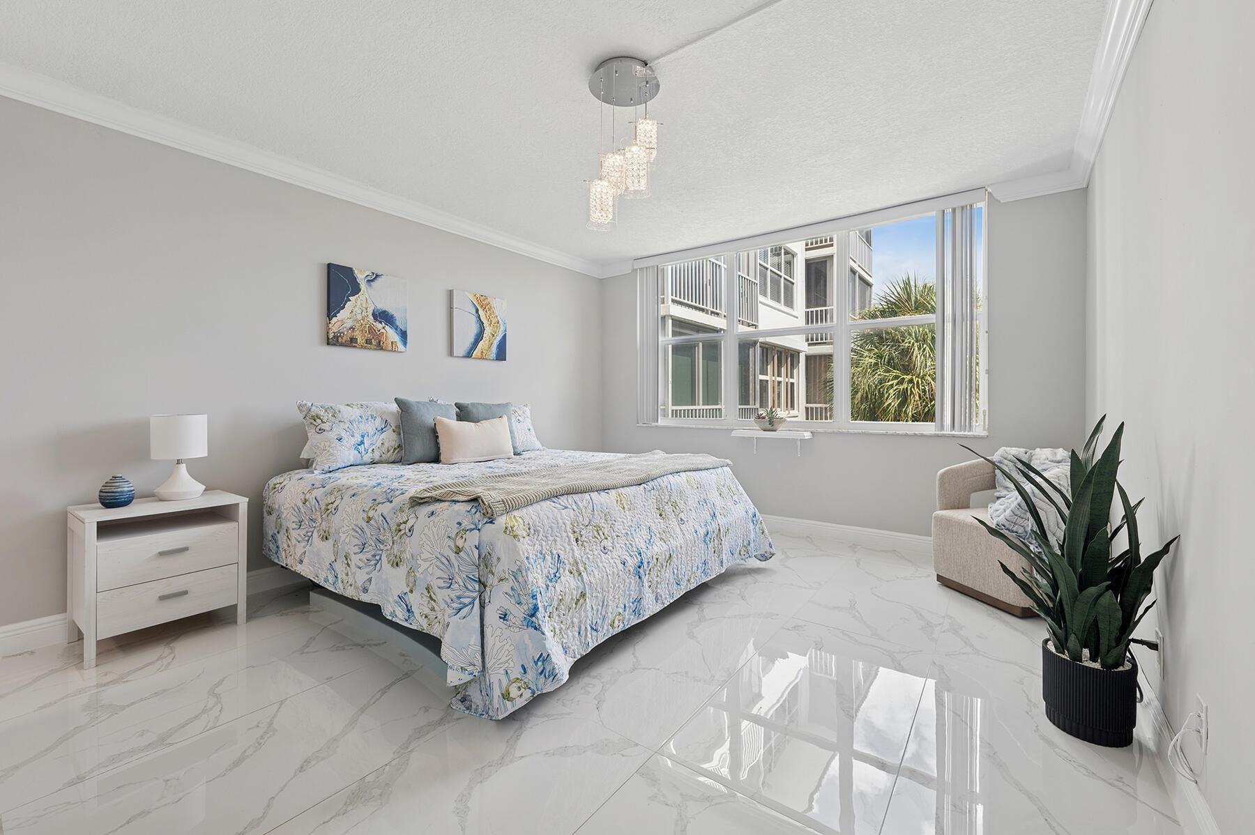 MOTIVATED SELLER! As you enter this stunningly remodeled 1200sqft, 2BR/2BA condo, you are immediately struck by the bright and airy split and open floor plan, the high end finishes, and the beautiful intracoastal and garden views. Every aspect of the home has been remodeled including chic marble-designed tile throughout (no carpet here!), new designer lighting, a gorgeous stone accent wall, and renovated kitchen and bathrooms. The beautiful kitchen boasts custom white cabinetry, quartz countertops, stainless steel appliances, and an opening into the spacious dining and living room. Sun streams through the floor-to-ceiling glass sliders on the screened in lanai. The oversized primary suite offers Intracoastal and garden views, a walk-in closet, and a designer bathroom with luxury