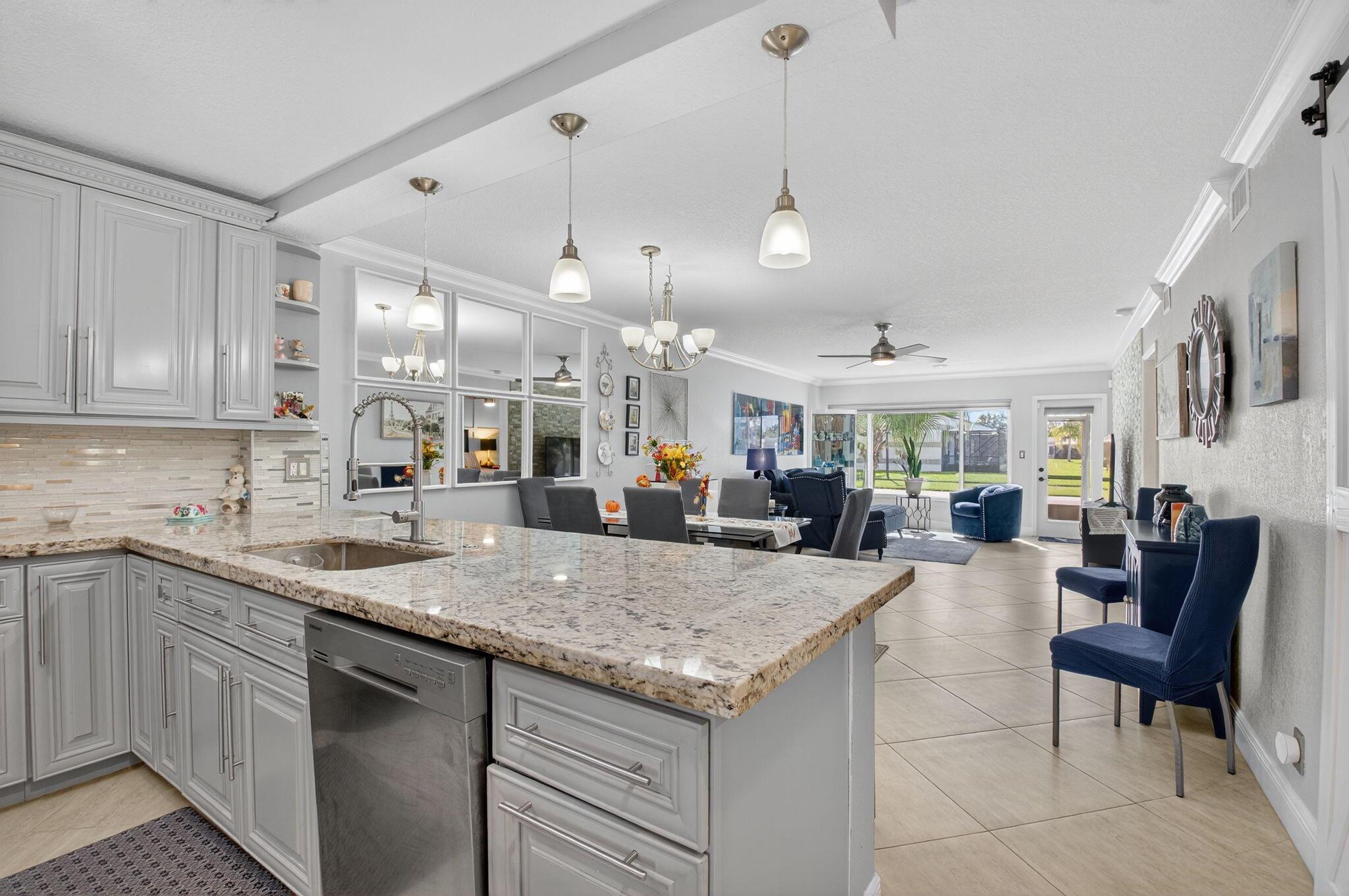 Discover your own tranquil retreat in this beautifully updated 2-bedroom, 2-bath villa with a magnificent lake view. Imagine enjoying your morning coffee or evening cocktail from the covered back patio while taking in the breathtaking scenery. Inside, the open-concept kitchen features sleek granite countertops and stainless steel appliances, with the sink and faucet recently upgraded just six months ago. The living area boasts elegant tile flooring and is centered around a stunning real brick accent wall, adding character and warmth. Both bedrooms offer modern wood-look flooring for a clean and cohesive look. Updated bathrooms, a barn door that provides a private hallway to the laundry area create a seamless living experience. With high-impact windows and doors and a