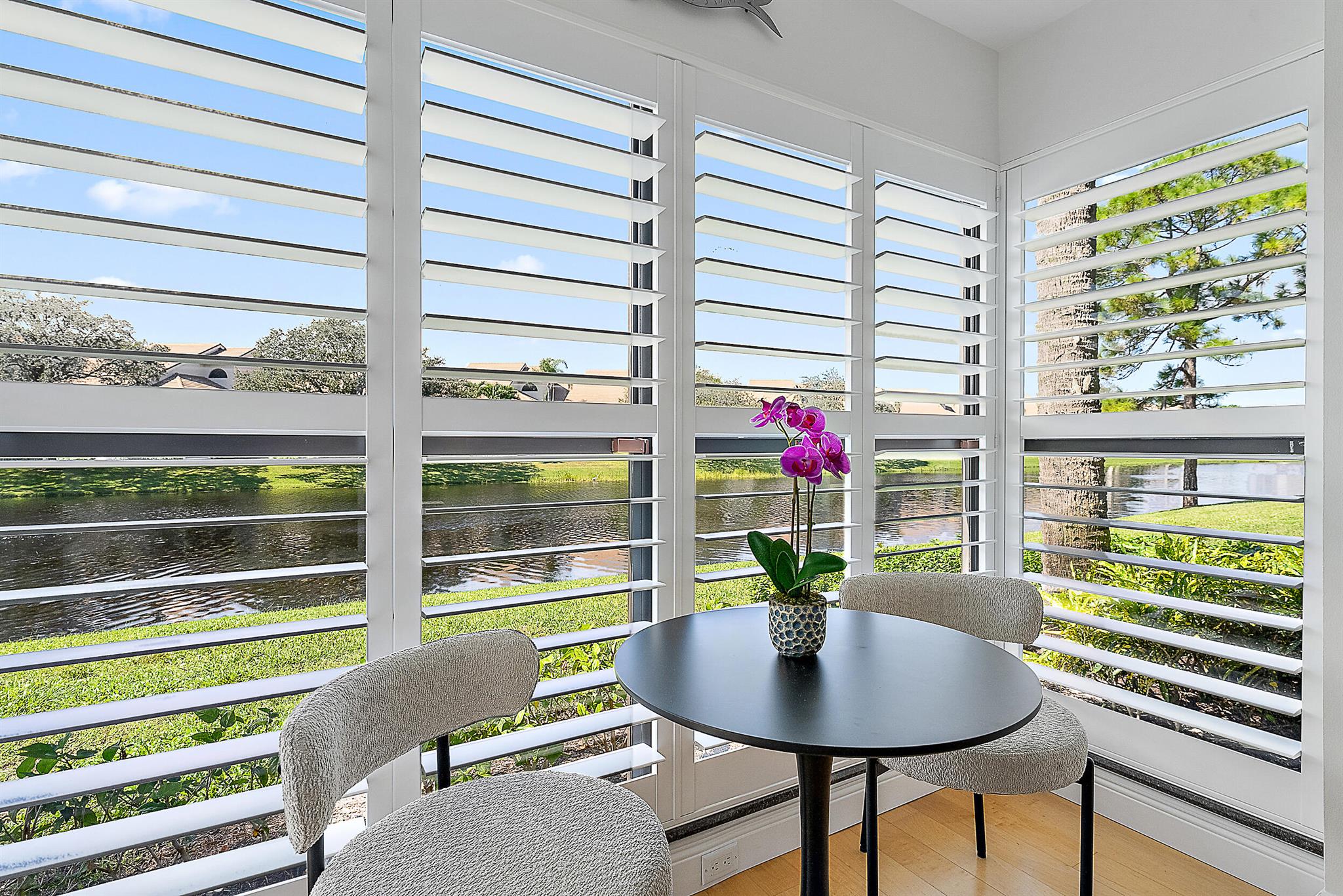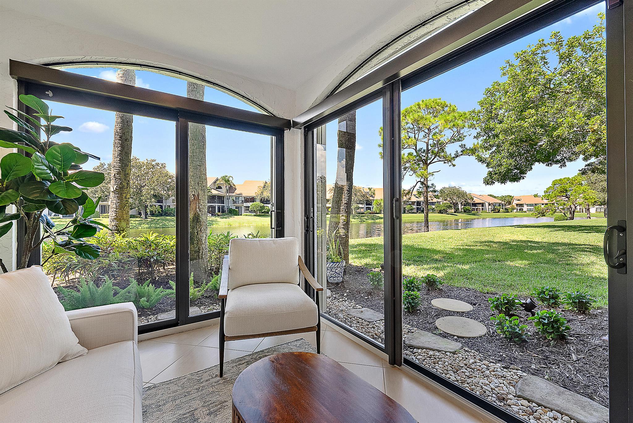 Enjoy serene lakefront views from this beautifully updated ground-floor 2-bedroom, 2-bathroom condo in the gated community of Jonathan's Landing. This light-filled residence has been thoughtfully updated and is being sold furnished, offering effortless move-in readiness. The patio has been enclosed and opened up, adding valuable extra square footage of living space while showcasing stunning water views. Features include impact windows, a new AC unit, a water filtration system, and an open & spacious floor plan. Additional highlights include a 1-car garage plus a separate golf cart garage - ideal for enjoying everything Jonathan's Landing has to offer with optional membership. Located in the heart of Jupiter minutes to the beach, restaurants, and shopping. Don't miss!