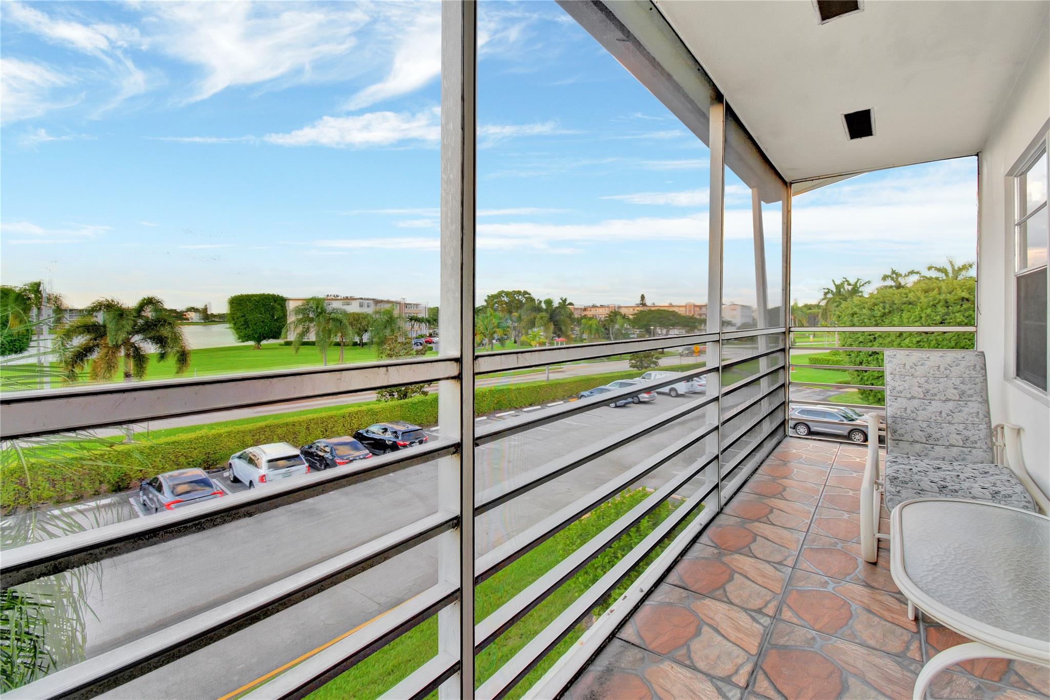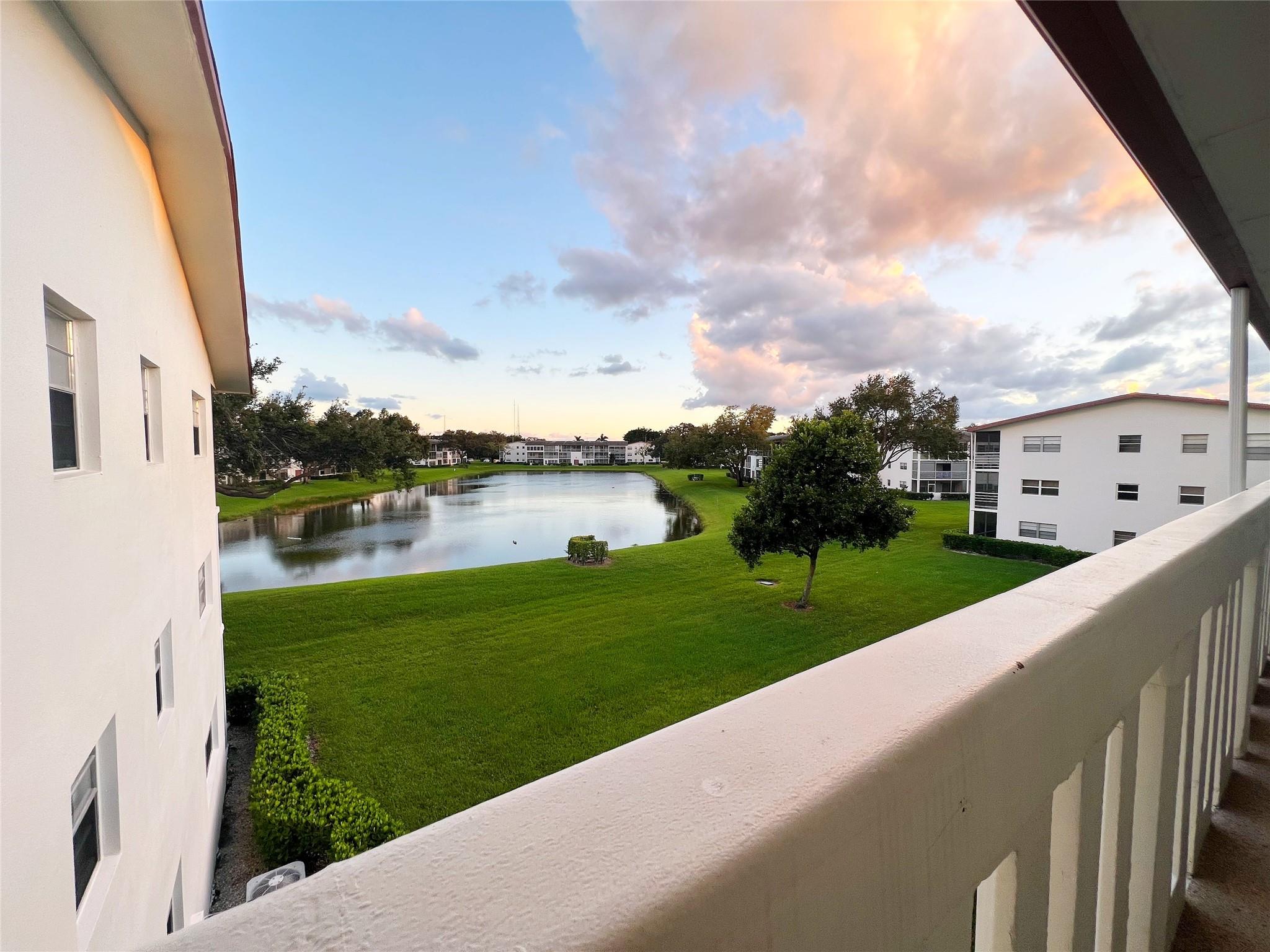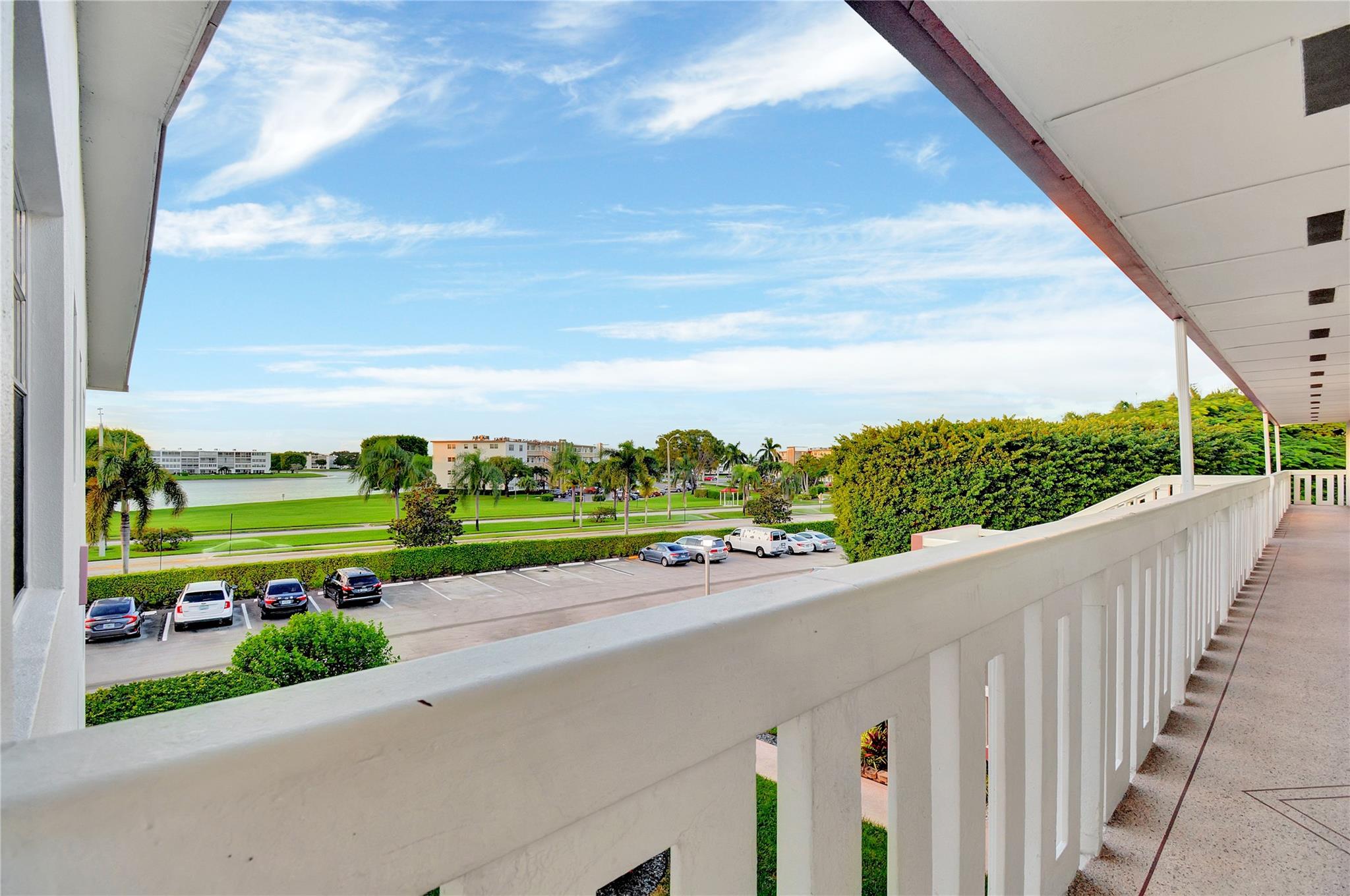 Unique 3rd Floor Corner Oasis, that is meticulously maintained & turn-key ready. Enjoy breathtaking dual lake views (front/back), creating a serene, resort-like ambiance at twilight. This bright open-concept home features a modern kitchen, tile floors, knockdown ceilings, & Hunter Venetian blinds. The primary suite boasts new vinyl plank flooring; guest room offers plush carpet & a large walk-in closet. The 17-ft rock-pattern tiled terrace extends your living space. The unit includes a high-end Himolla Siegfried white leather sofa w/ a large plexiglass image over the couch resembling dual open windows looking onto a serene lake w/ a sailboat, which ties in to this condo's setting. Steps from pool & designated parking spot. Can rent immediately, WOW! This unit is special & won't last long!