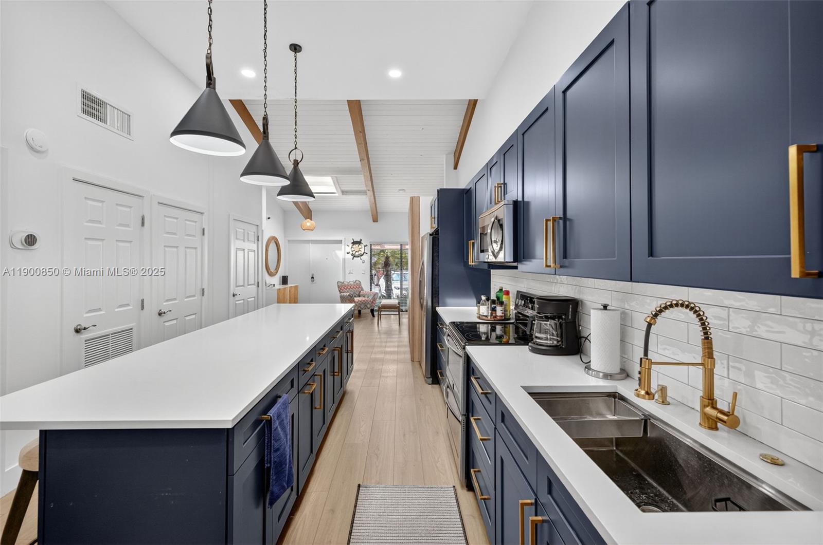 Rarely available 3-bedroom waterfront villa with private dock 29.7-foot in Hallandale’s exclusive Three Islands community! Completely renovated and offered turnkey furnished, this light-filled home features vaulted ceilings, skylights, and an open-concept layout perfect for entertaining. The thoughtfully designed kitchen offers abundant cabinetry, a central island, quartz countertops, and a wine cooler—ideal for gatherings. Enjoy seamless indoor-outdoor living. Sail into the sunset from your private dock! Quiet cul-de-sac with two parking spaces, guest parking, and EV charger. New impact sliding doors are being installed. Low-maintenance community with heated pool, tennis courts, and parks. Just minutes to the beach, dining, and Gulfstream Park!