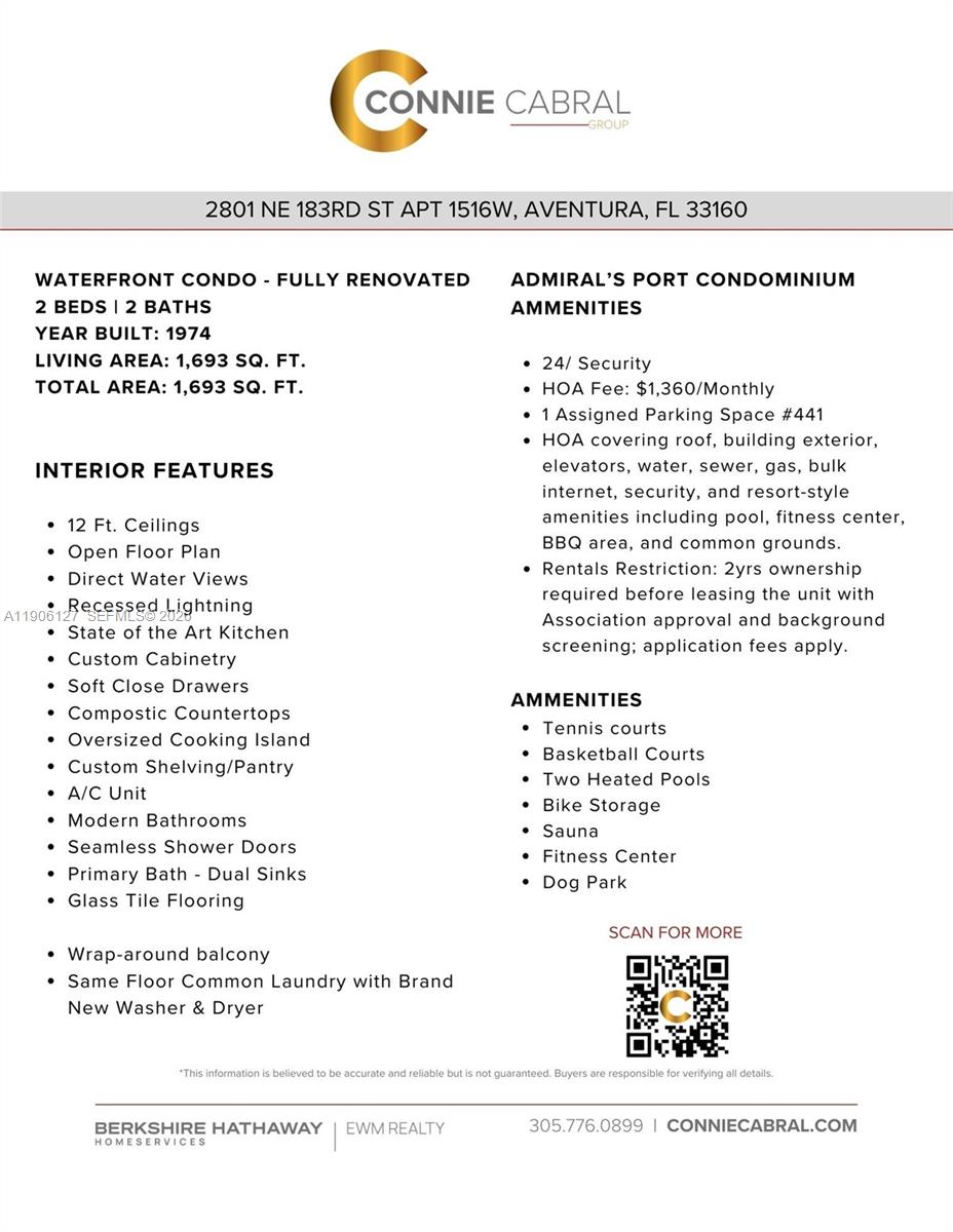 Welcome to Aventura, Florida! This rare direct waterfront corner unit offers 2 spacious bedrooms & 2 full baths with spectacular sunset and Intracoastal views. The open-concept layout is fully renovated to maximize water views from every angle, including the expansive wraparound terrace—perfect for dining or relaxing. The modern kitchen features an oversized island, floor-to-ceiling cabinetry, full pantry & extra storage. Enjoy resort-style amenities including pool, tennis courts, and more. Convenient same-floor laundry. Located minutes from Aventura Mall, world-class dining, and pristine beaches, this unit delivers luxury and location. Don’t miss this opportunity to own a renovated waterfront condo in Aventura’s prime location! 24 hour notice a must and only pre-qualified buyers!