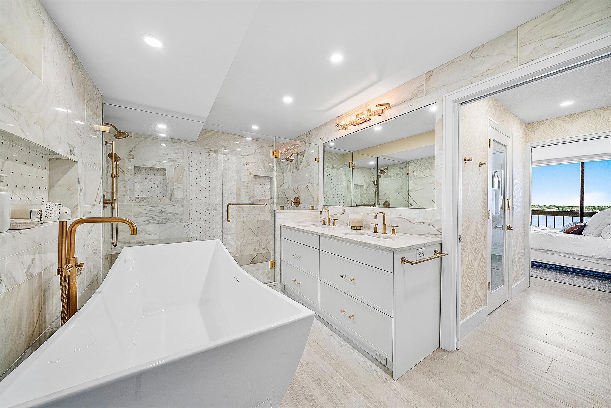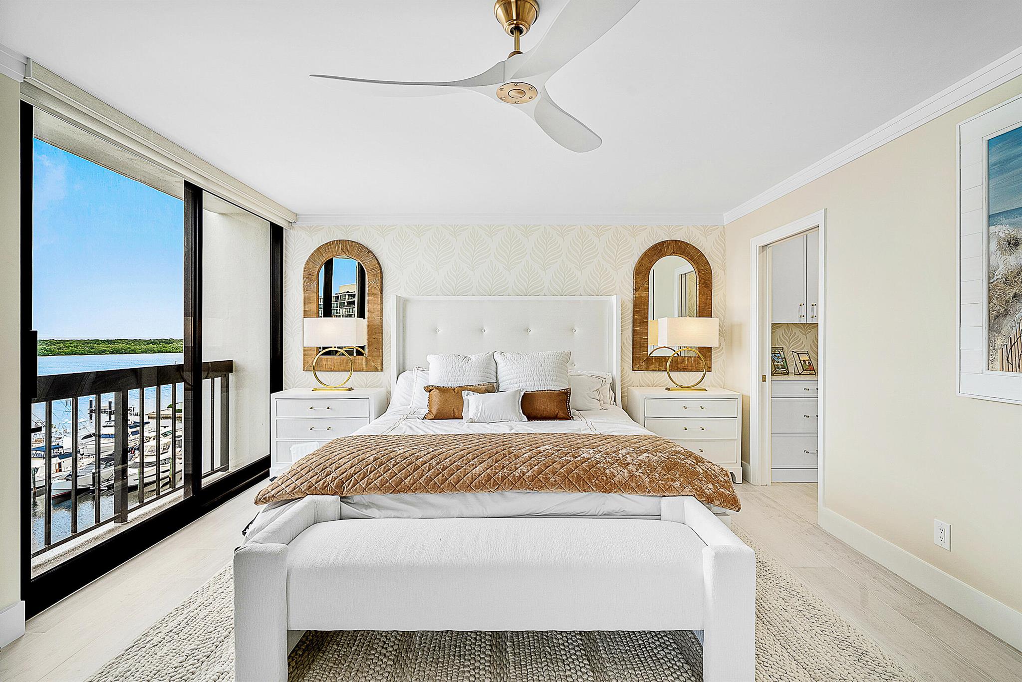 Completely remodeled down to the studs in November 2022, this exquisite 2BR/2BA residence in Marina Tower at Old Port Cove offers luxurious modern living with breathtaking water views from every room. Enjoy seamless indoor-outdoor living with an expansive wrap-around balcony perfect for entertaining or taking in year-round sunsets over the Intracoastal. Every inch of this home has been thoughtfully upgraded -- featuring new hurricane-rated doors & glass, high-end fixtures for plumbing & lighting, electric window shades with remotes in every room, upgraded interior doors with smoked glass & hardware, new washer & dryer (2023), and all lights on dimmers.