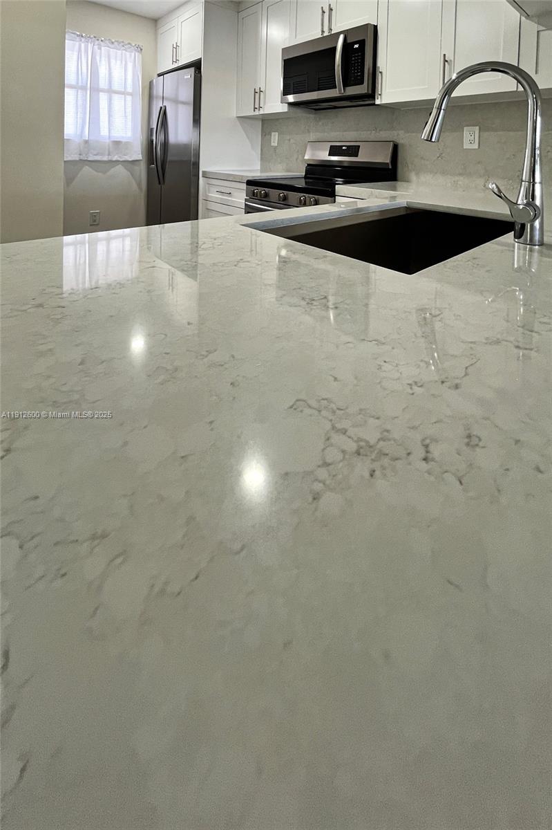 Meticulously updated top-floor residence w/deep, covered balcony overlooking breezy lake views. Expertly executed renovation blends sleek modern design w/warm, inviting flow. Reimagined kitchen offers all-new: quartz countertops, soft-close cabinetry, full stainless appliance pckg, deep sink w/disposal, W/D & recessed lighting. Principal bedroom has walk-in closet & ensuite bath. Both bathrooms fully renewed: marble floors, vanities w/integrated lighted mirrors, modern sinks & bath fittings. New: durable wide-plank wood-style flooring in neutral tones, baseboards, freshly painted walls, ceilings & doors. 1 assigned parking space. HOA permits 2nd vehicle in ample guest spaces. 6 min to Dolphin Mall, 8 min to FIU, 12 min to MIA & City Place Doral, 18 min to UM. Immediate leasing permitted.