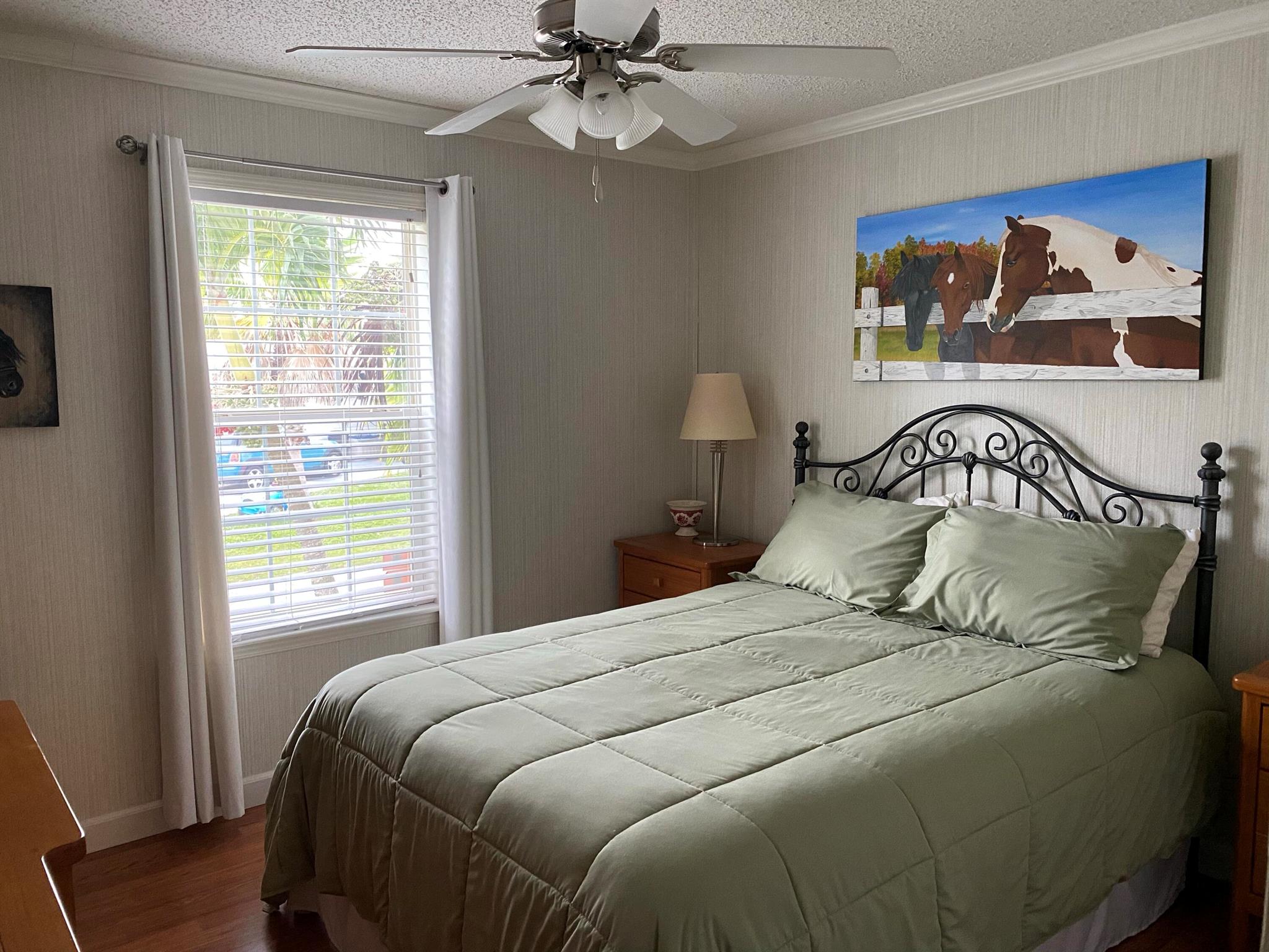 Leased Lot $910.60, This pristine 2bed/2Bath furnished manufactured home with crown molding and new AC 2021. Kitchen is open and includes large island, inside laundry, laminate flooring. Large private screened porch and solar shades. Located in a 55+ community, Spanish Lakes One provides a relaxed yet vibrant lifestyle for active seniors. Enjoy resort-like amenities, including a community clubhouse, free golf, social events, tennis courts, and pool. Park approval is required to purchase. ****Personal items and artwork DO NOT CONVEY.