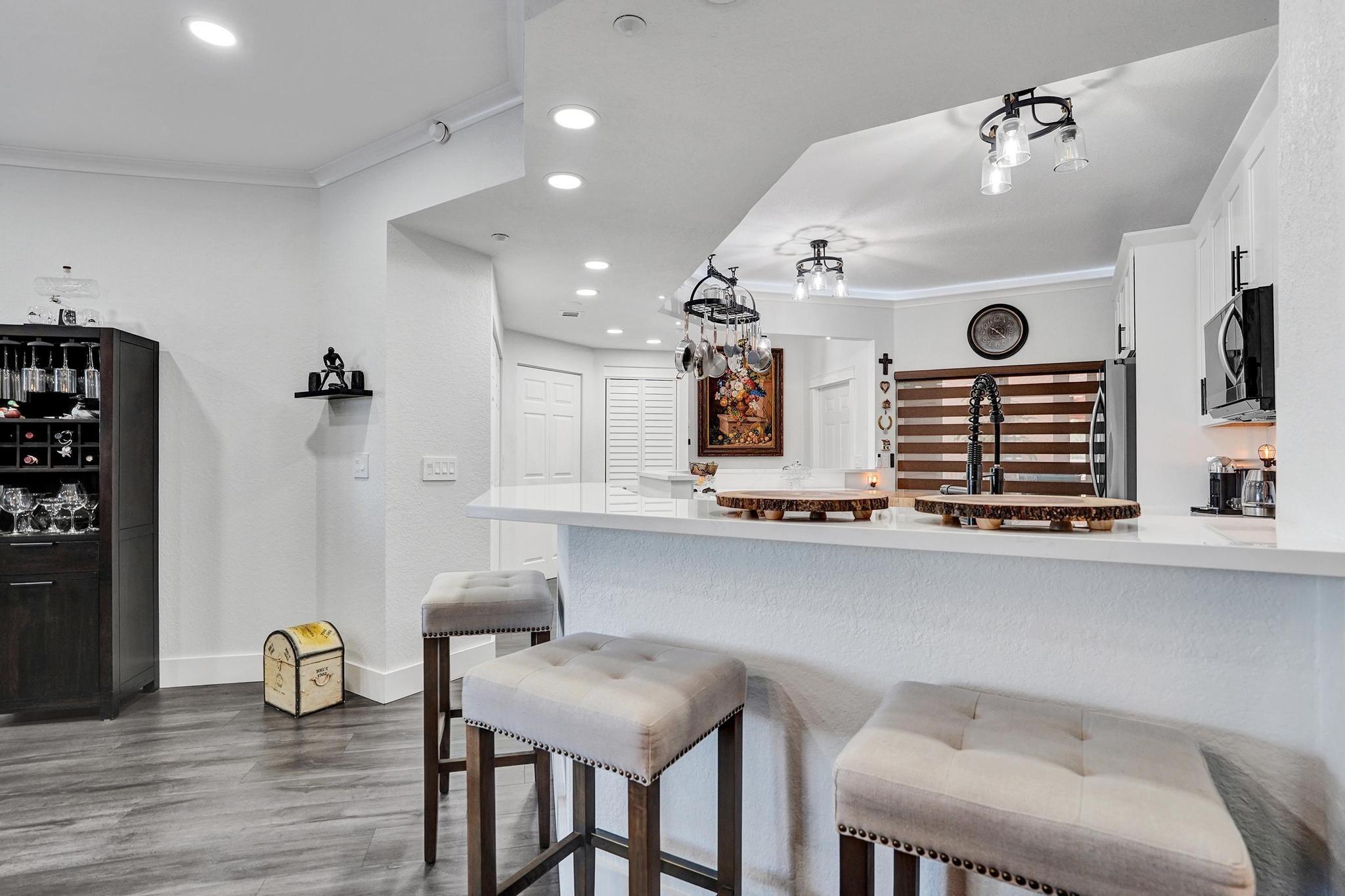 OK settle in because the upgrades are many!! Rare oppty to own one of the largest and newest Lakefront Cambridge models in Kings Point! Deeded CLUB membership comes w/ this unit! Peace of mind and modern living w/professional remodel w/permits, offers 2bed/2bath turn-key luxury w/lake views from every room. New elec panel, outlets, switches, plumbing pipes/drains, hot water heater/A/C 2019. Impact front door (keyless), Impact sliders. Completely new chef's kitchen from top to bottom, feat elegant cabs, quartz countertops, all-new LG appl, full-sized pedestal W/D. LVP flooring, Bboards, inter doors, custom frames + handles. New lighting+fans. Motorized Zebra blinds on all sliders, custom closets, wood shelving in laundry, bath, hall closets. Enjoy screened front AND back patios! Gated too!