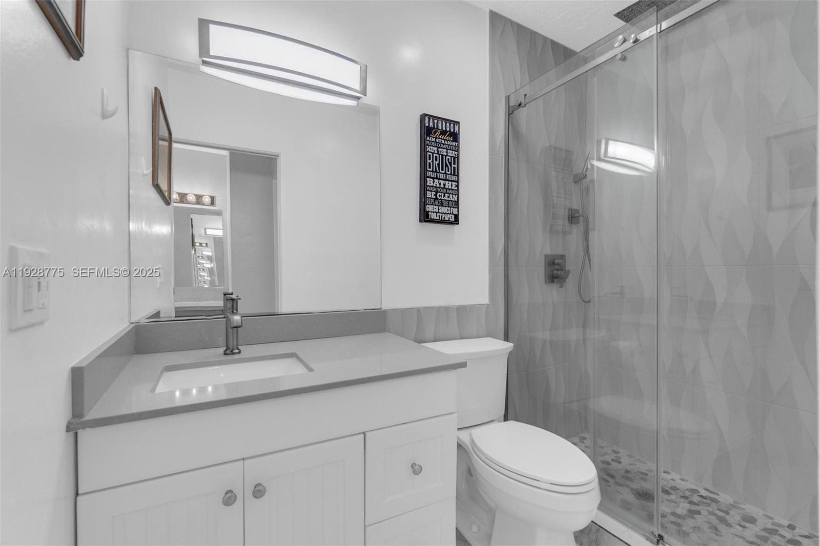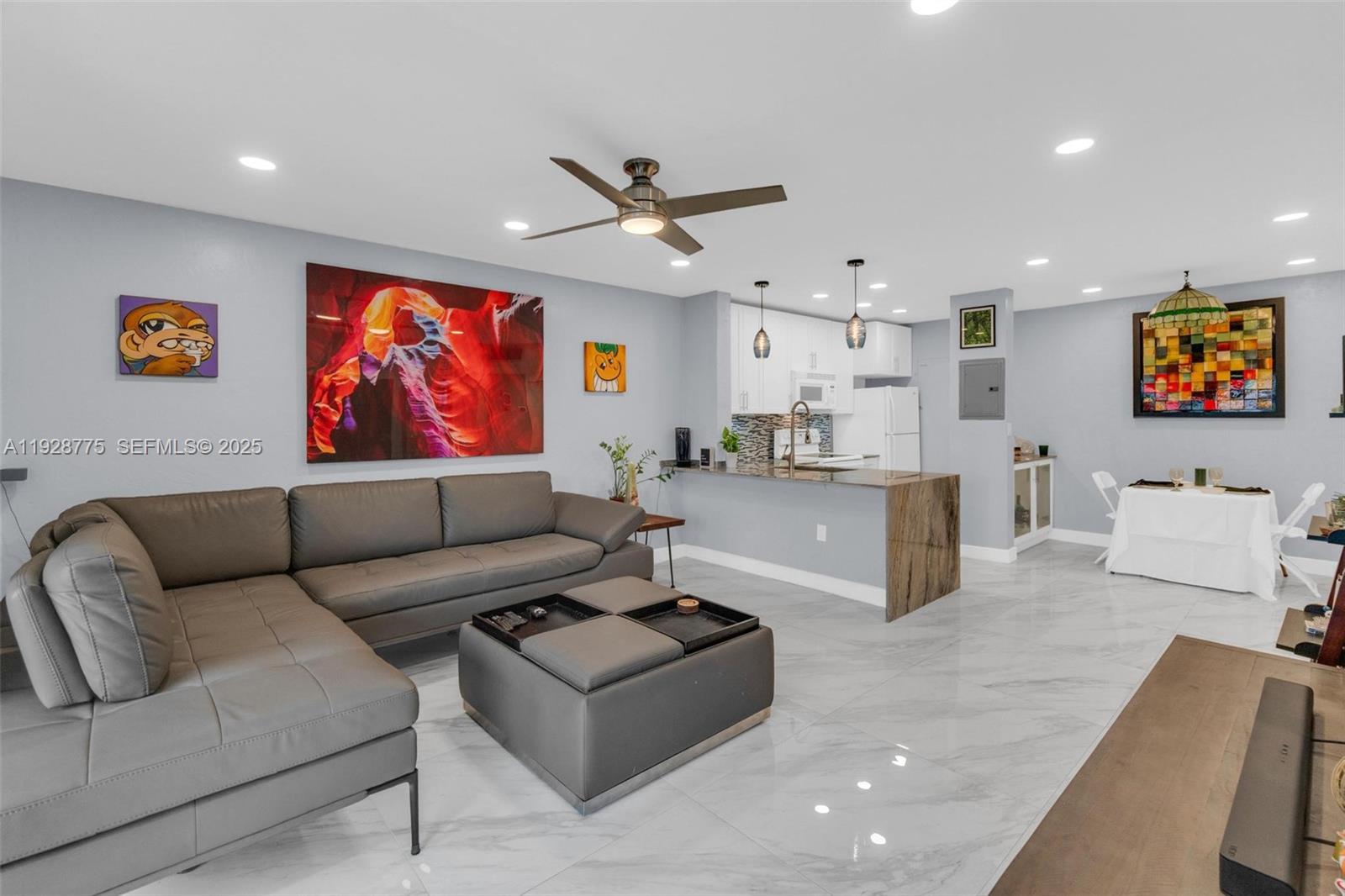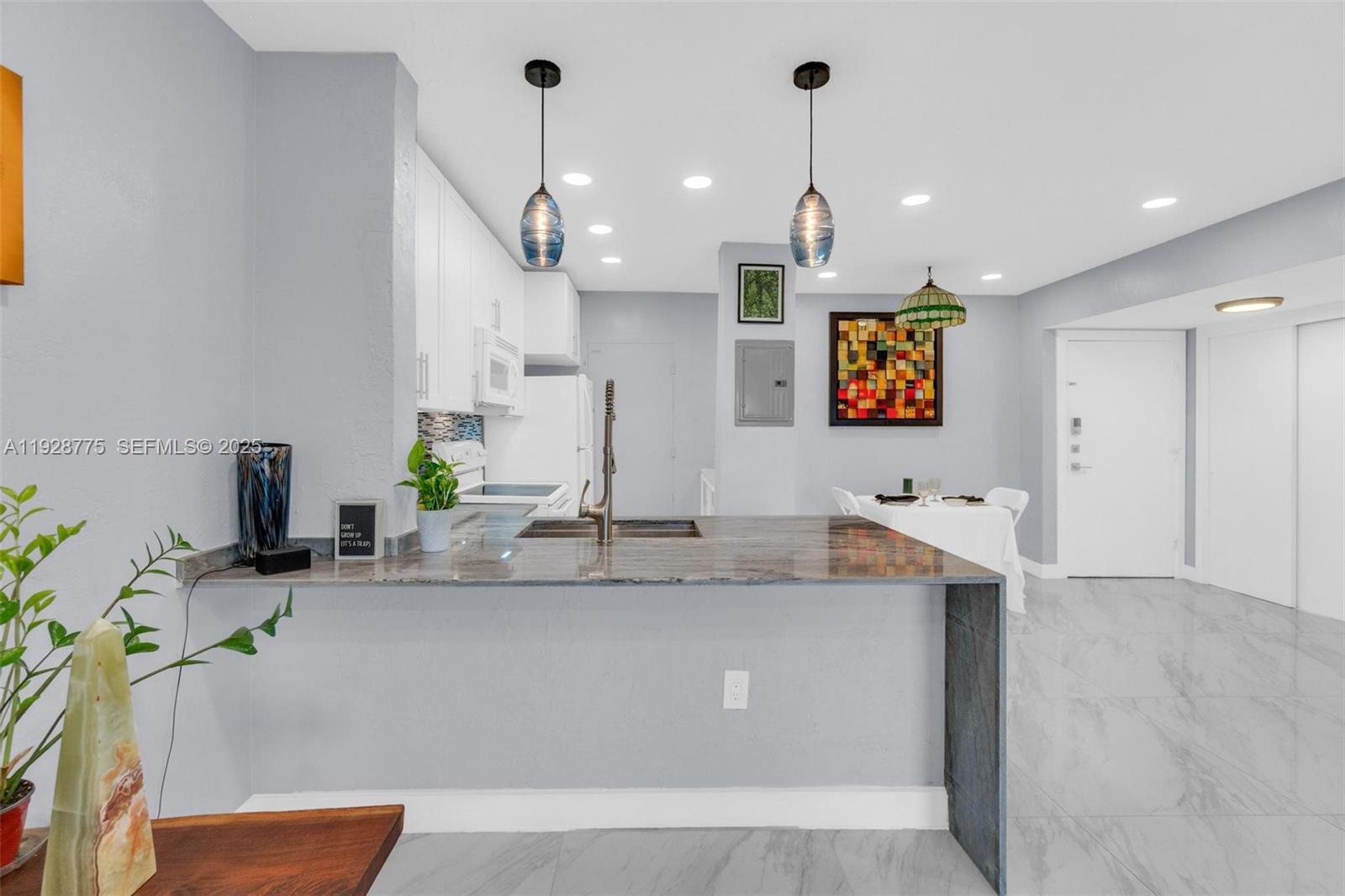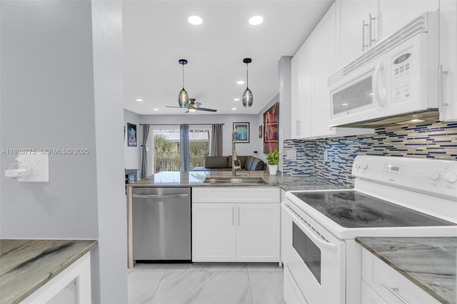 Contemporary 2023 updating includes 24x24 porcelain floors & paint job thru out entire unit, new waterfall granite kitchen counters, new extra-large sink & faucet, new white kitchen fronts, new recessed lighting thru out unit, new electric panel, new primary glass shower with custom tile & shower heads and new tile in second bathroom. Open living area and both bedrooms have direct access to 37x6 foot balcony overlooking community swimming pool. Primary 15x12 bedroom has dressing area & walk-in closet. Washer/dryer in unit. Silver Palms at Dadeland is enclosed gated community near Dadeland shopping mall, Metrorail north station, 878 & 826 Expressways.