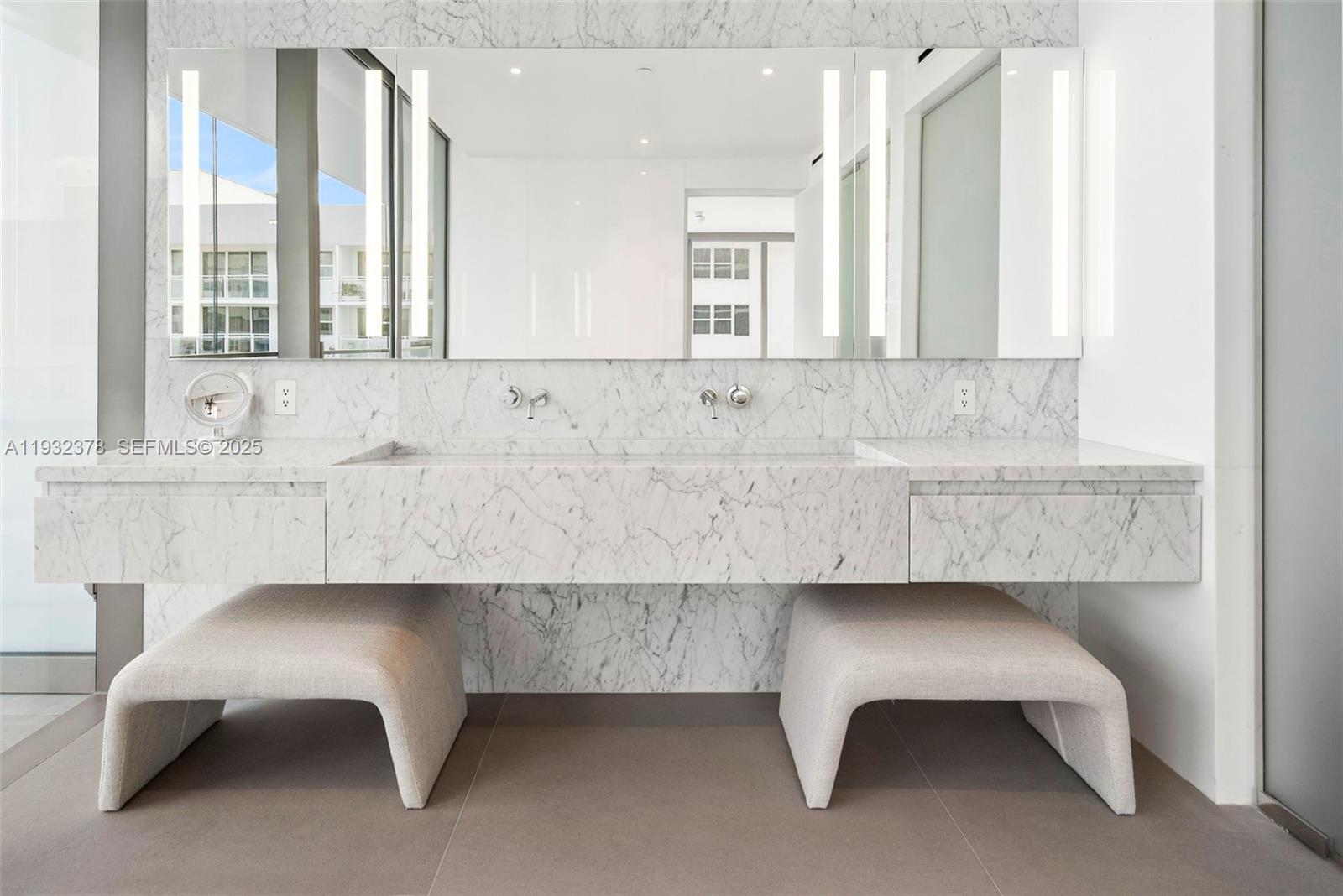 Indulgent, turn-key oceanfront residence offering breathtaking sunrises over the ocean and golden sunsets over the intracoastal waterway. Fully furnished with refined Artefacto furniture, this half-floor, 3-bed, 3.5-bath condo welcomes you via private, facial-recognition elevator, soaring 10-ft ceilings, and elegant Serena stone floors. Surrounded by tranquil blue ocean, the living room features a sleek Boffi kitchen with premium Gaggenau appliances and a terrace. Exceptional west-facing primary suite offers a private terrace, custom walk-in closets by B&B Italia, and a spa-inspired bath, sunlit media room, 3 parking spaces. Enjoy luxury boutique living with resort-style, beachfront amenities: beach club, 2 pools, fitness center, owner’s lounge with catering kitchen, spa pavilion, and more.