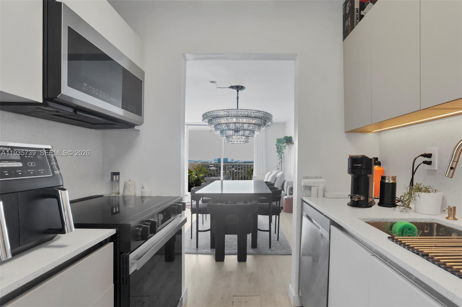 Gorgeous water view, modern fully remodeled apartment featuring light oakwood vinyl floors, modern kitchen cabinets with quartz countertops and backsplash, fingerprint resistant stainless steel appliances, a separate vanity area with a floating vanity and round backlit mirror, floor to ceiling custom closets with floating shelves and drawers, and much more. Enjoy the best view in the building from your private balcony overlooking the canal and the intersection with another canal, creating an open and stunning water view. Located close to universities and a park at the end of the street, and just 10 minutes from Bal Harbour Shops and the beaches. Excellent opportunity for investors, generating over 5% annual return, with a new building being constructed nearby that is expected to add value to the surrounding properties. Tenant occupied until February 26, 2026.