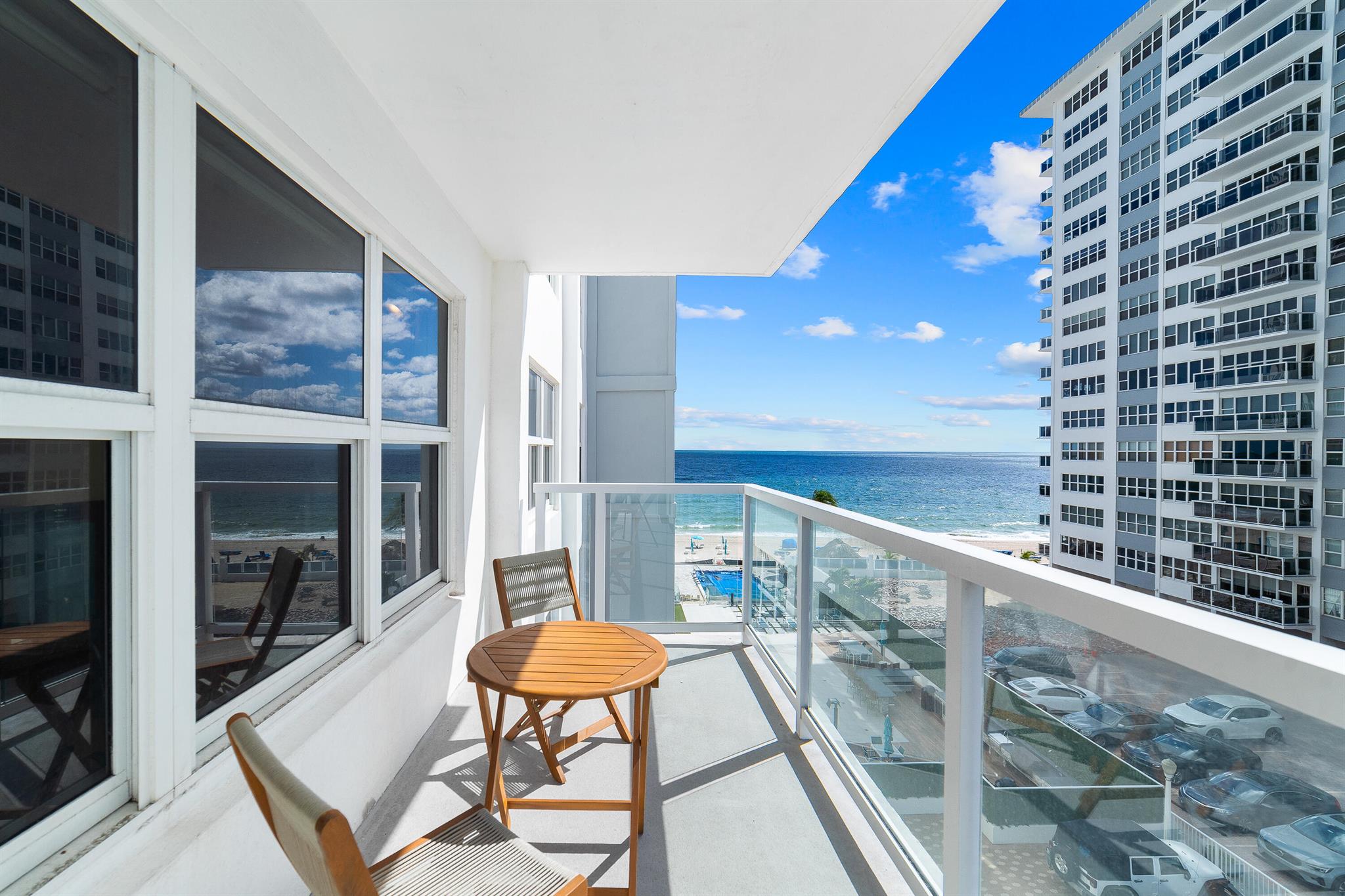 Experience coastal living at its finest in this spacious 2-bedroom, 2-bath residence with the largest two-bedroom layout in Regency South. Enjoy the breathtaking ocean view from your private balcony, where you can listen to the waves roll in. This turn-key home features a beautifully renovated kitchen with granite counters, stainless steel appliances, and a wine fridge, along with updated bathrooms and an elegant primary suite with a generous walk-in closet. Additional upgrades include impact windows and doors, newer AC and water heater. Offered fully furnished and move-in ready, this residence overlooks the pool and provides resort-style amenities in a premier beachfront building that has completed its 40-year inspection.