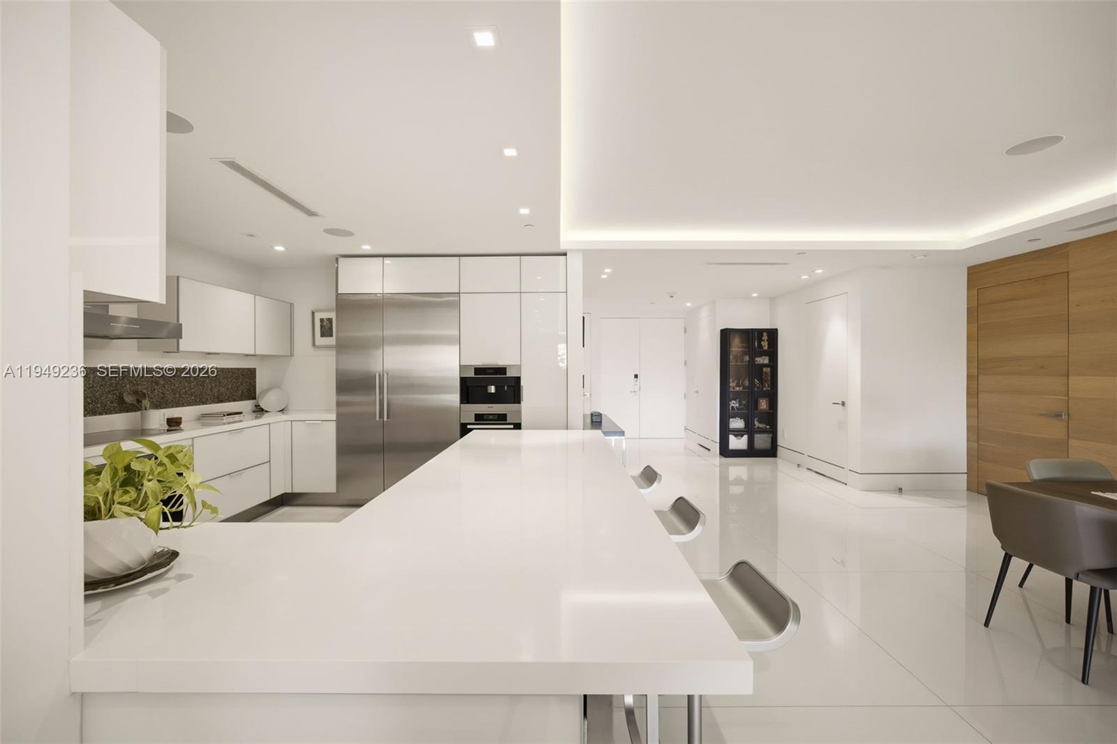 Visionary design and innovative craftsmanship define this ultra-luxurious residence at the exclusive Residences at Vizcaya, an intimate collection of only 18 homes set along the picturesque Biscayne Bay in Coconut Grove. Offering the timeless appeal of waterfront living with a relaxed, modern aesthetic, this residence delivers privacy, tranquility, and a seamless balance of form and function. The thoughtfully designed open floor plan features two bedrooms, two-and-a-half baths, and expansive living spaces filled with natural light streaming through a covered balcony overlooking lush garden views. Upon arrival via a private keyed elevator, the residence reveals calming neutral tones complemented by bespoke finishes throughout, including Miacucina Italian glass cabinetry in the kitchen and closets, Miele stainless steel appliances, 48x48 white glass flooring, custom oak wood accent walls, Lutron lighting, and a fully integrated audiovisual system. Every detail has been curated to reflect understated elegance and refined simplicity. Residents enjoy a boutique lifestyle with resort-style amenities, including an infinity-edge lap pool with dual spas, cabana areas, and a marina directly on the bayfront. The residence includes two covered parking spaces with a parking lift accommodating a third vehicle. Ideally located minutes from Downtown Miami, Brickell, and Coral Gables, this is a rare opportunity to experience gracious service, unparalleled luxury of waterfront living.