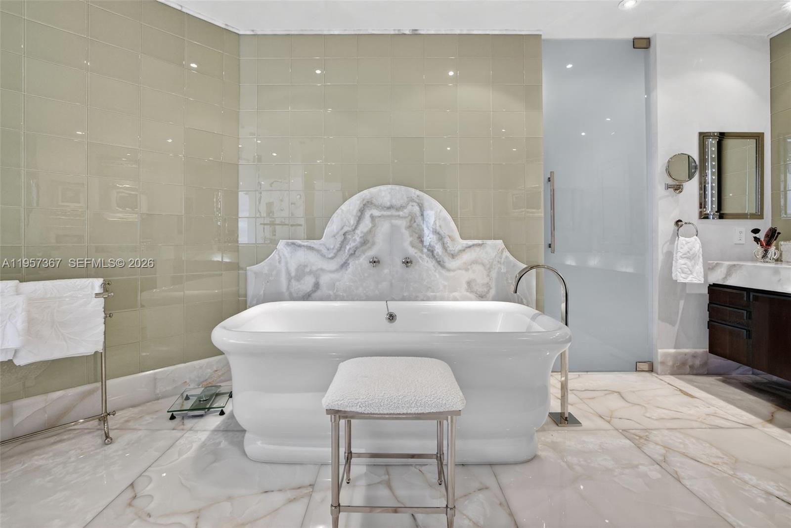 WOW comes out of your mouth every time you walk in. Introducing a truly rare Williams Island penthouse offering 5 bedrooms and 4.5 baths with immense 14-foot ceiling heights and breathtaking, full panoramic views stretching from the direct ocean to the east and southeast, all the way to the dazzling city skyline. This residence delivers a one-of-a-kind “wow factor” with a dramatic glass staircase, a sunken living room, and an elegant formal dining room—perfectly designed for both grand entertaining and refined everyday living. Enjoy limestone flooring throughout, custom doors, and the convenience of an internal private elevator. The renovated chef’s kitchen features state-of-the-art Gaggenau appliances, sleek European cabinetry, and stunning Taj Mahal marble countertops that elevate the space with timeless luxury. A rooftop terrace offers the ultimate outdoor setting—decorator-ready and ideal for creating your dream summer kitchen and entertaining space under the Miami sky. The principal suite is a showpiece, featuring a renovated spa-style bathroom with onyx accents, backlit countertops, top-of-the-line finishes, and an oversized shower with dramatic ocean views. This is truly a world-stage residence—rare, unforgettable, and unlike anything else. Enjoy the legendary Williams Island lifestyle with world-class amenities, 15 har-tru tennis courts, 4 pickleball courts, 2 panel courts, 27,000 health spa w/.indoor pool, 105 slip world class marina, 4 restaurants venues, and more