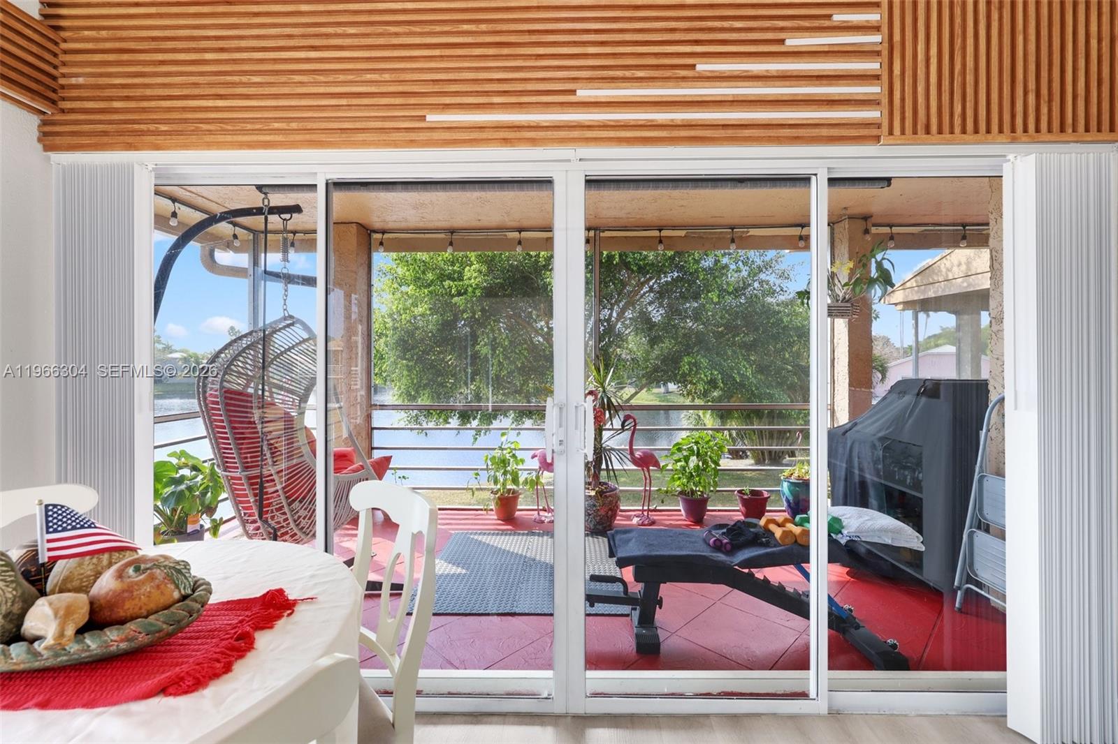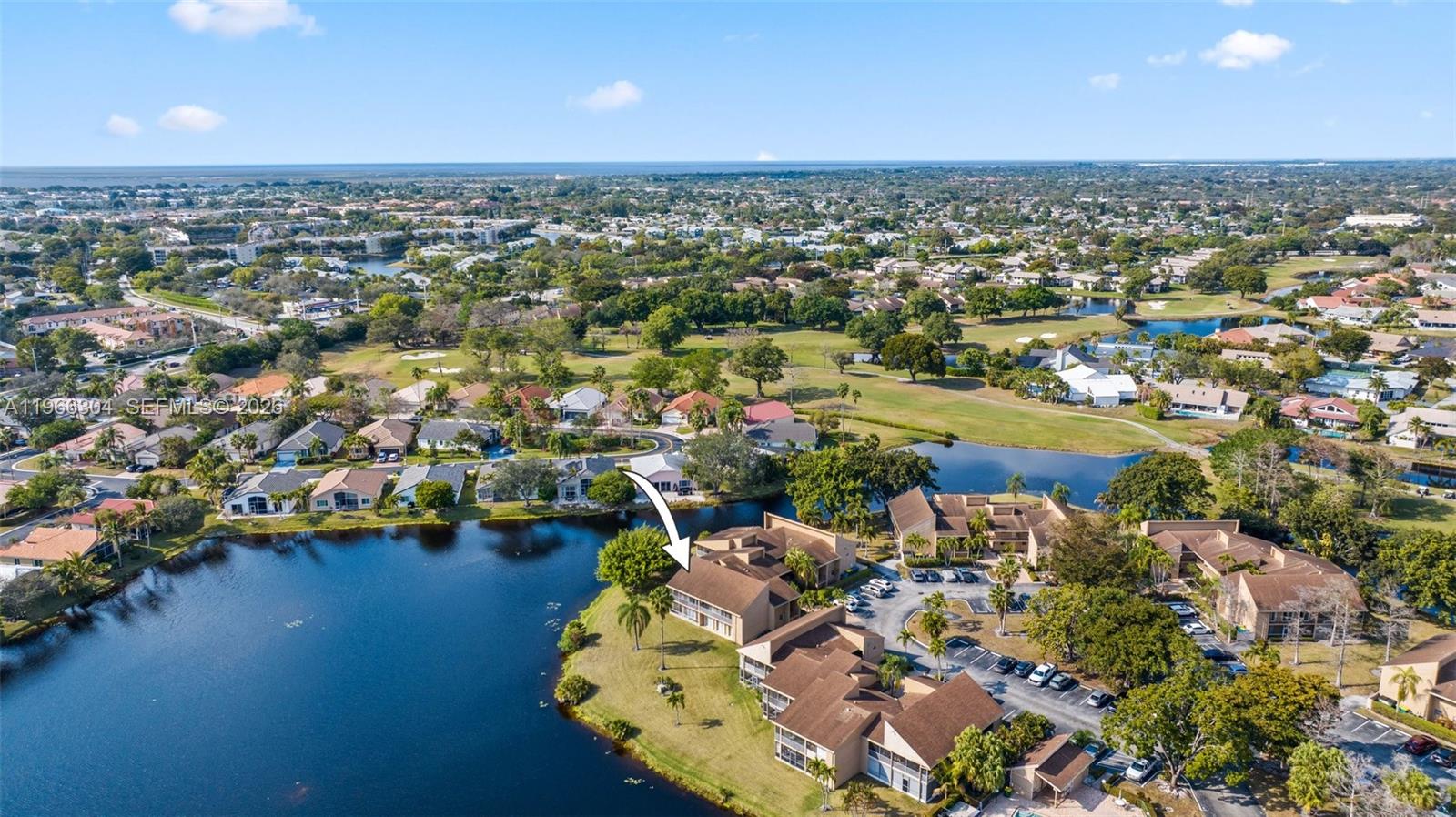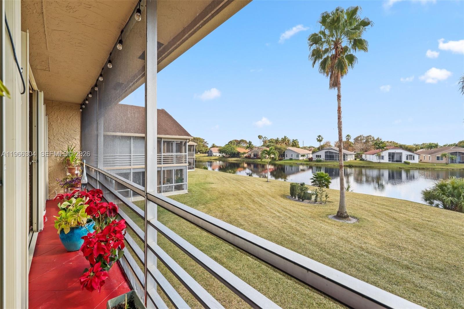 Welcome to The Atrium, a Woodmont community. This spacious second-floor 3 bedroom, 2 bathroom corner unit is move-in ready! As you enter your foyer area, you're greeted with an open concept layout with super high ceilings in the main living areas with tons of natural light pouring in from multiple sliding doors. Enjoy the breathtaking lake views right from your living room that makes it feel like you're on the intercoastal. Enjoy the expansive wrap-around balcony area perfect for indoor/outdoor living. Kitchen features beautiful white cabinetry, quartz countertops, SS appliances, complimentary backsplash, pantry, and a cooking island perfect for bar-style seating. Waterproof vinyl flooring throughout. Primary bedroom features a nice-sized walk-in closet, sliding doors to the balcony, and a sleek primary bathroom with dual sinks and a nicely updated frameless shower. Full sized laundry room added for convenience. Accordian shutters throughout for peace of mind. Newer AC unit last installed in 2021. A desirable split floorplan with a generous sized storage closets. Two assigned parking spaces with tons of guest parking. Maintenance includes water/sewer, trash, roof repairs, lawn/landscaping, community pool, & more. The Woodmont community has gold course memberships and is centrally located by supermarkets, parks, schools, dining, highways, and so much more! Schedule your showing today!