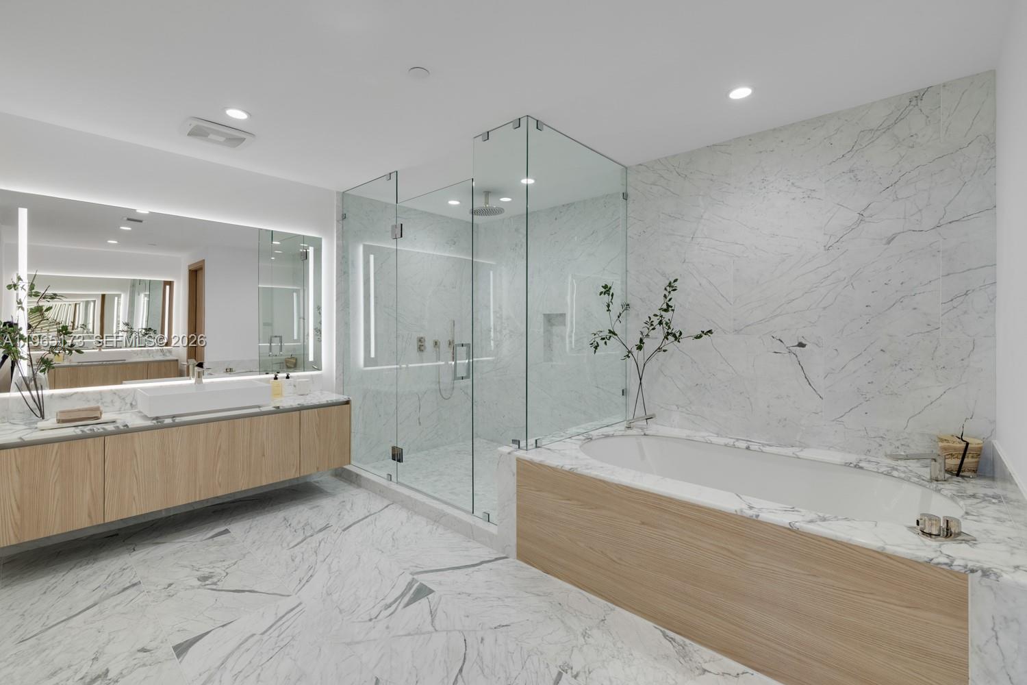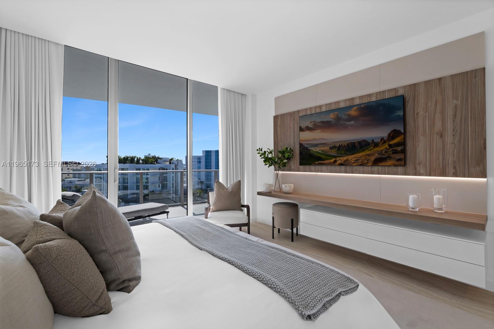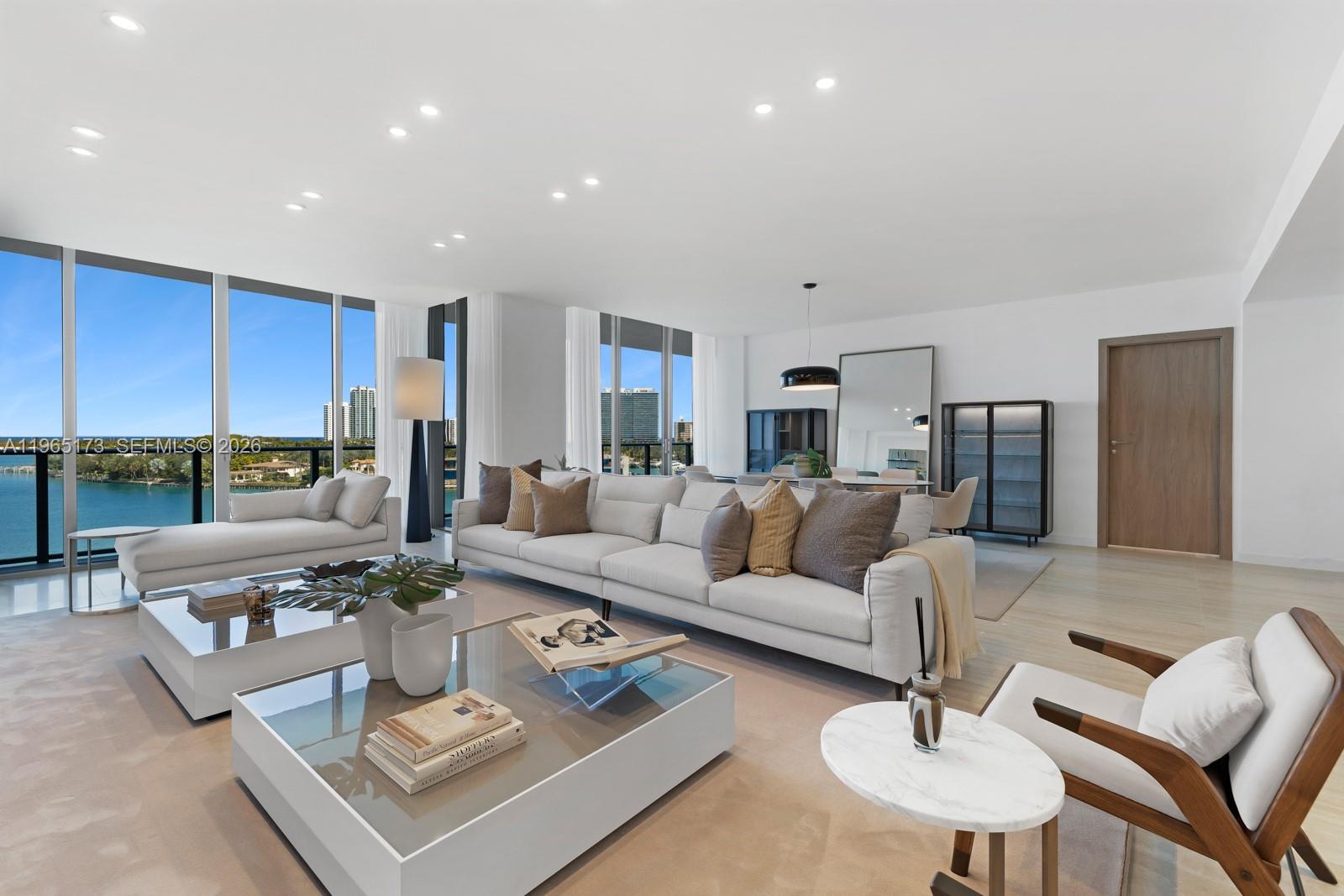 Step Inside With Me! One of only four premier penthouses at Onda, Bay Harbor Islands’ newest luxury boutique residential experience. Surrounded by aqua waters, this never-lived-in bayfront stunner has travertine flooring throughout and is offered furnished. Beyond the private foyer, the grand hosting salon reveals itself through walls of glass where a floating, backlit media wall with custom shelving and lacquered cabinetry defines the space. The Snaidero kitchen showcases an expansive eat-in island with marble counters and premium Miele appliances, extending into a sunlit dining room with water views. The primary suite displays an integrated entertainment wall, spa-inspired marble bath with dual vanities, and two generously proportioned closets. Penthouse 3 features three additional appointed guest suites, each with custom drapery and private access to one of the two expansive terraces. Standout features include a private office and sleek media den thoughtfully designed for comfort and entertainment. Designed by award-winning Arquitectonica and landscaped by Enzo Enea, Onda offers outstanding amenities: a grand pool, Technogym fitness center, wellness spa, EV charging station — plus 2 parking spaces, storage, and 24-hour valet. All moments from Bal Harbour Shops, Four Seasons Surf Club, and the beach. To be sold with 60' boat slip for an additional $500,000.